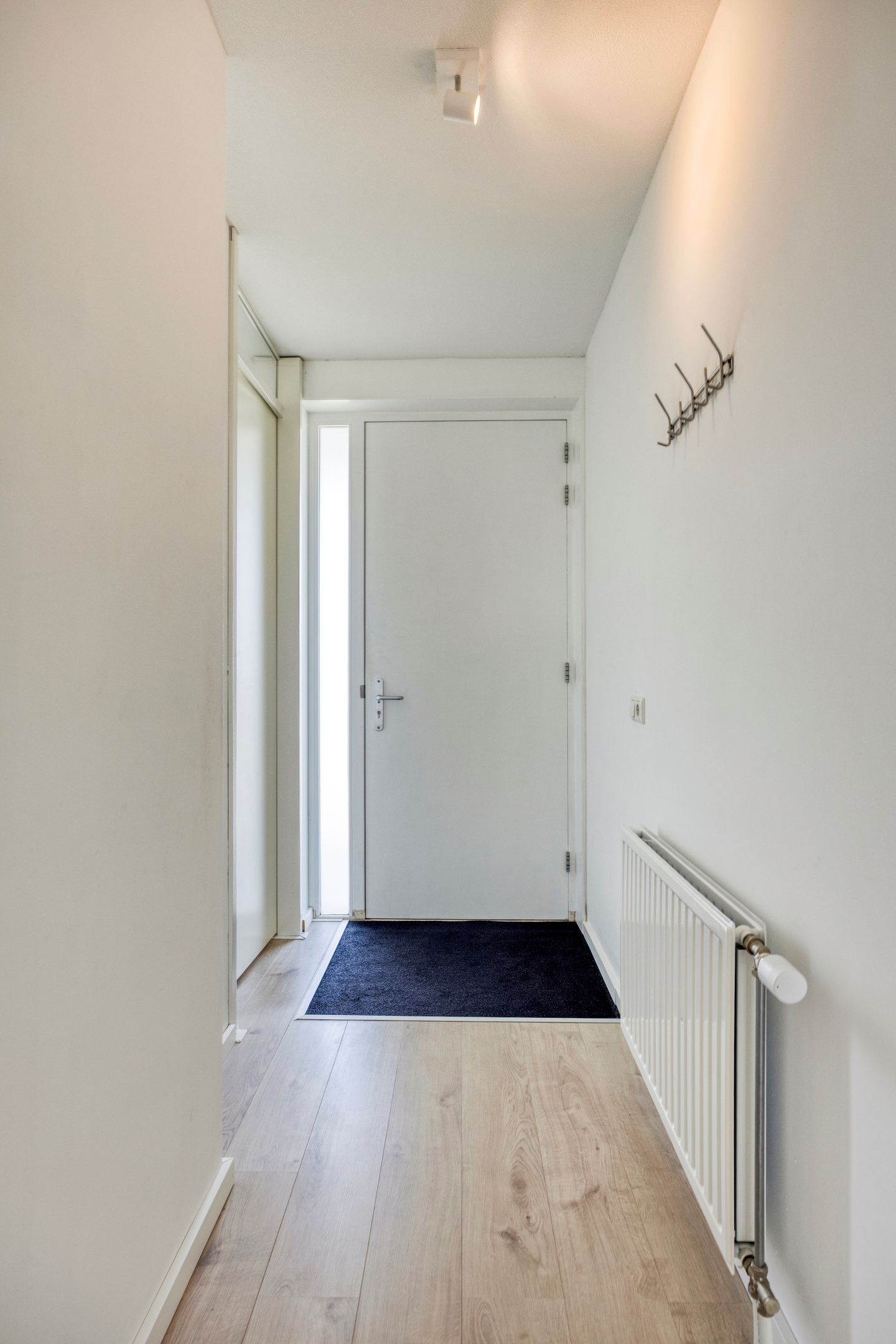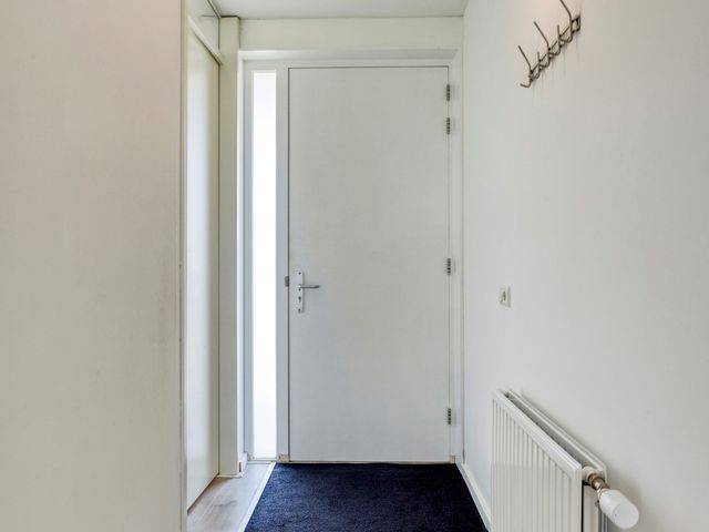 De ruime hal met intercom-videofoon, biedt toegang tot de slaapkamer, badkamer, meterkast, toilet en de woonkamer.