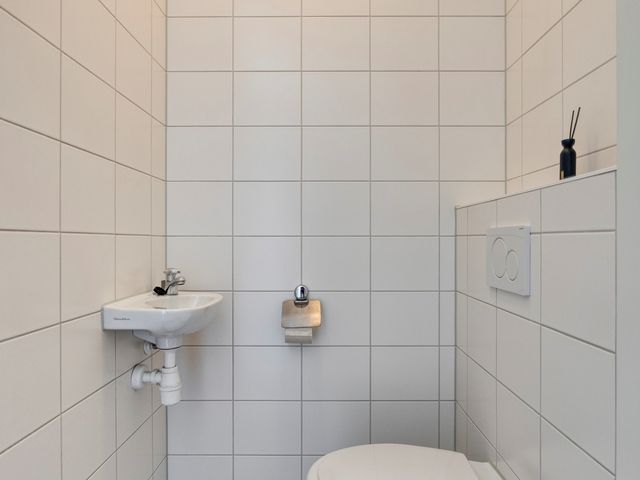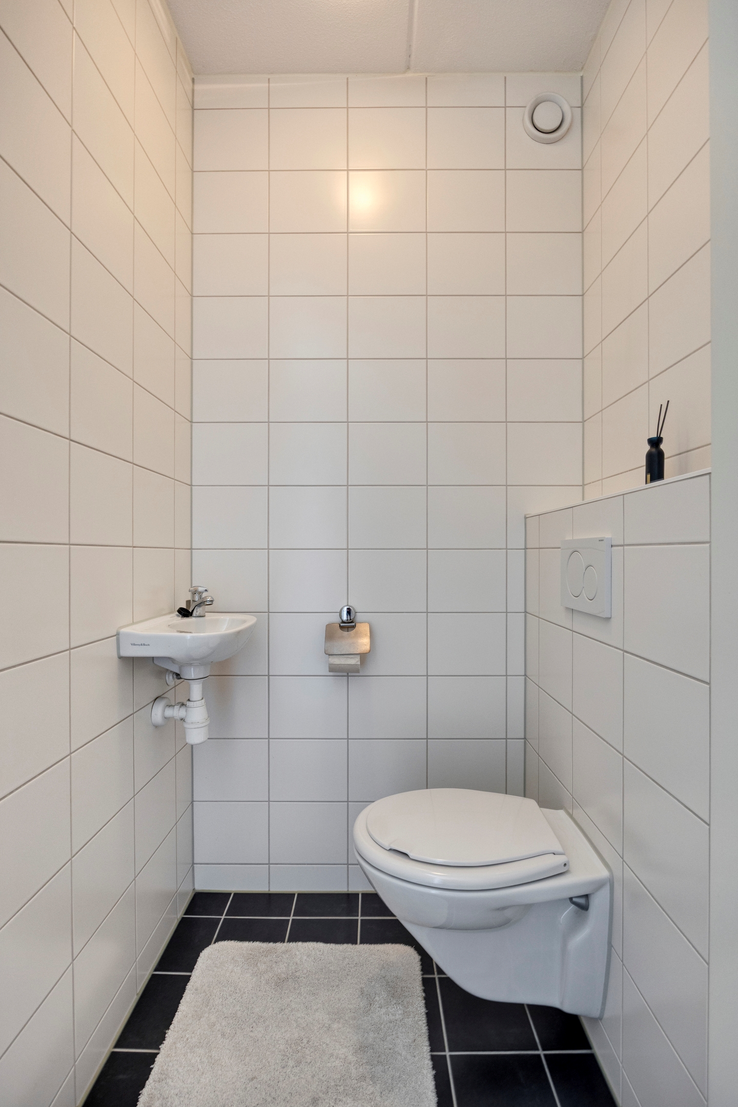 De toiletruimte voorzien van een wandcloset en een fonteintje, de vloer is afgewerkt met vloertegels en de wanden zijn geheel betegeld.