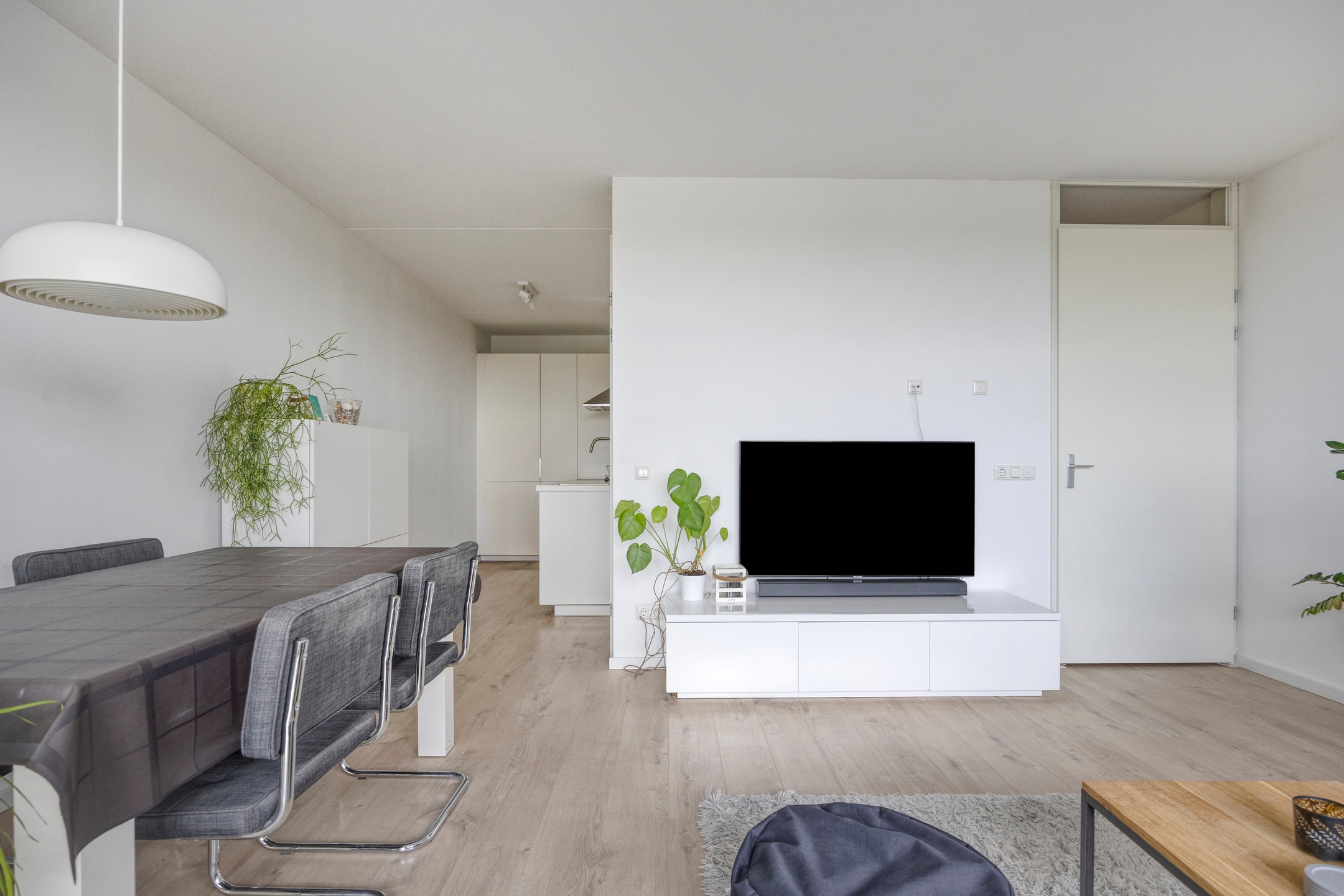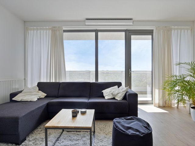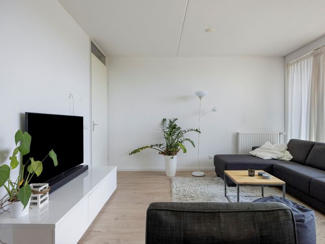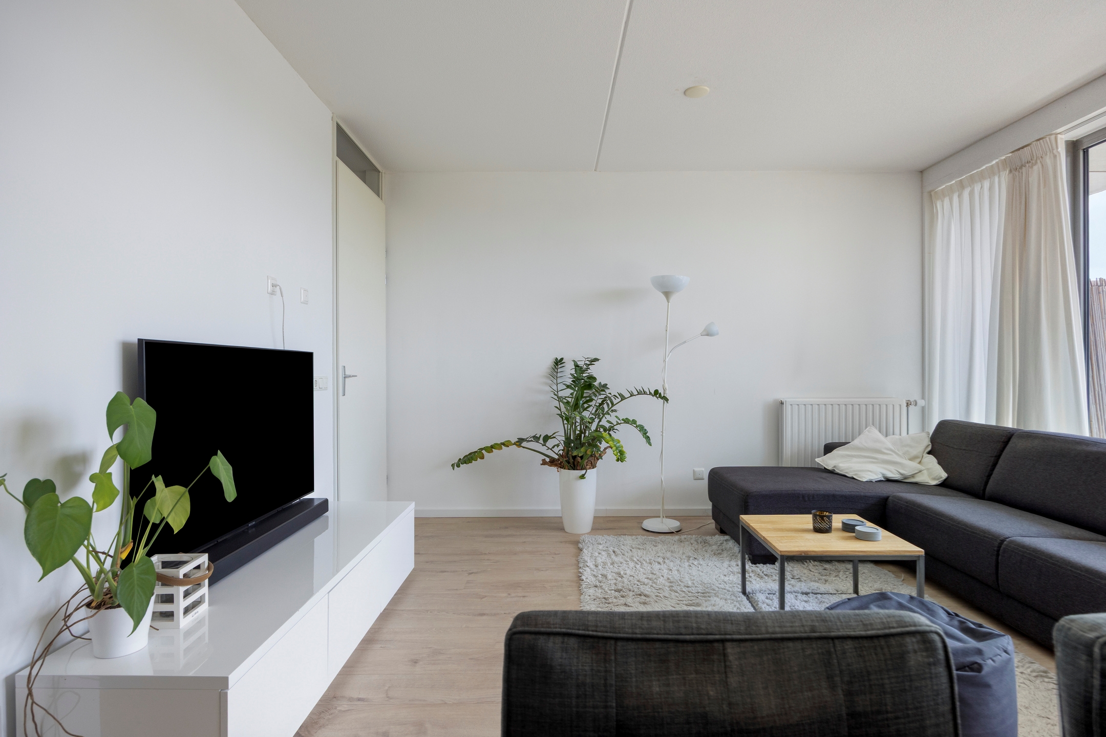 Dankzij de royale glazen pui geniet de woonkamer van een aangename hoeveelheid daglicht. De gestucte wanden zorgen voor een moderne uitstraling en via een deur is er toegang tot het ruime balkon.