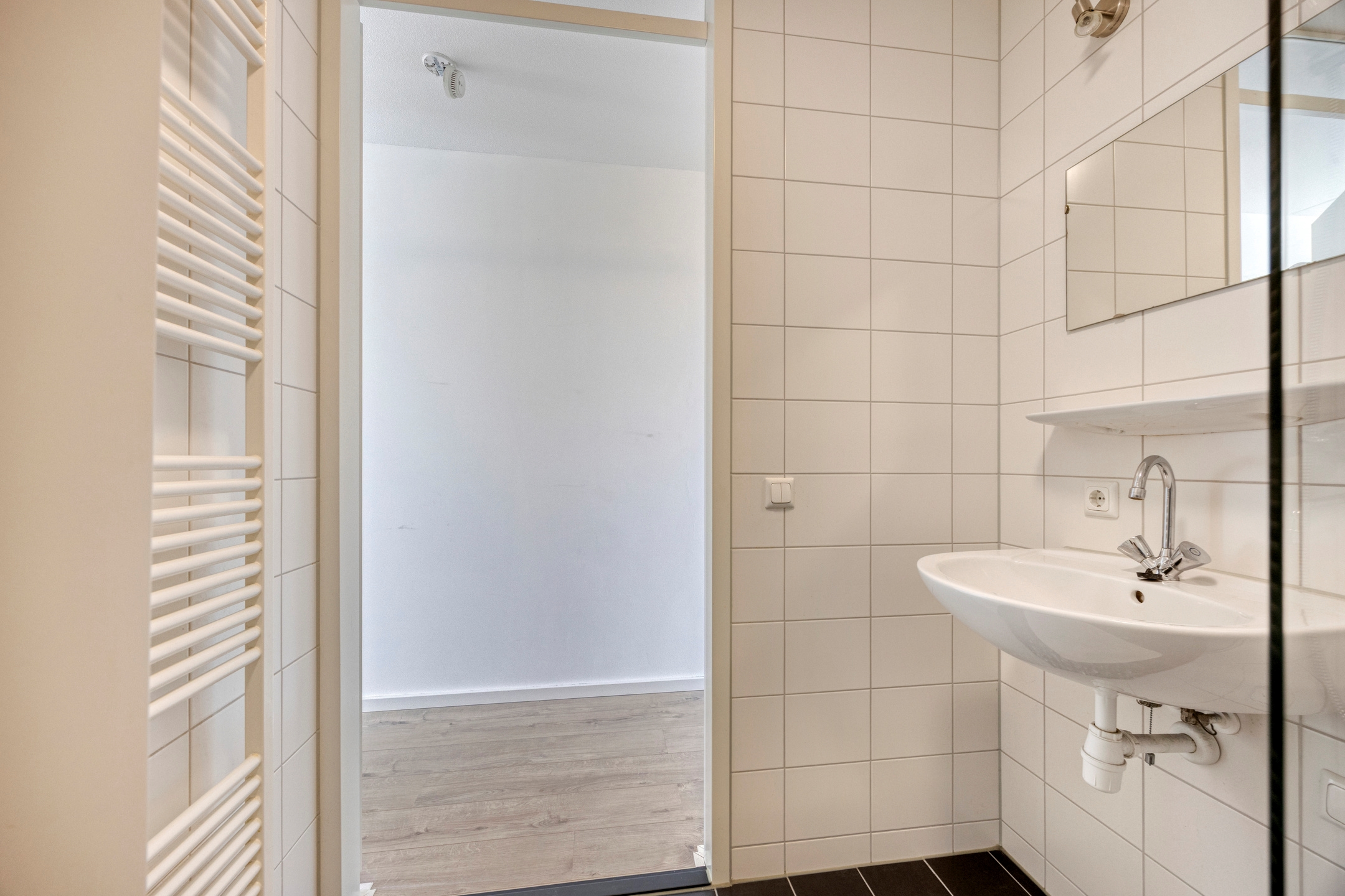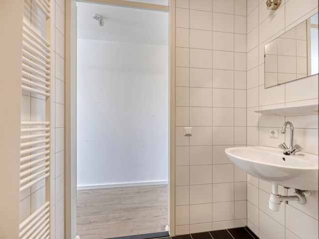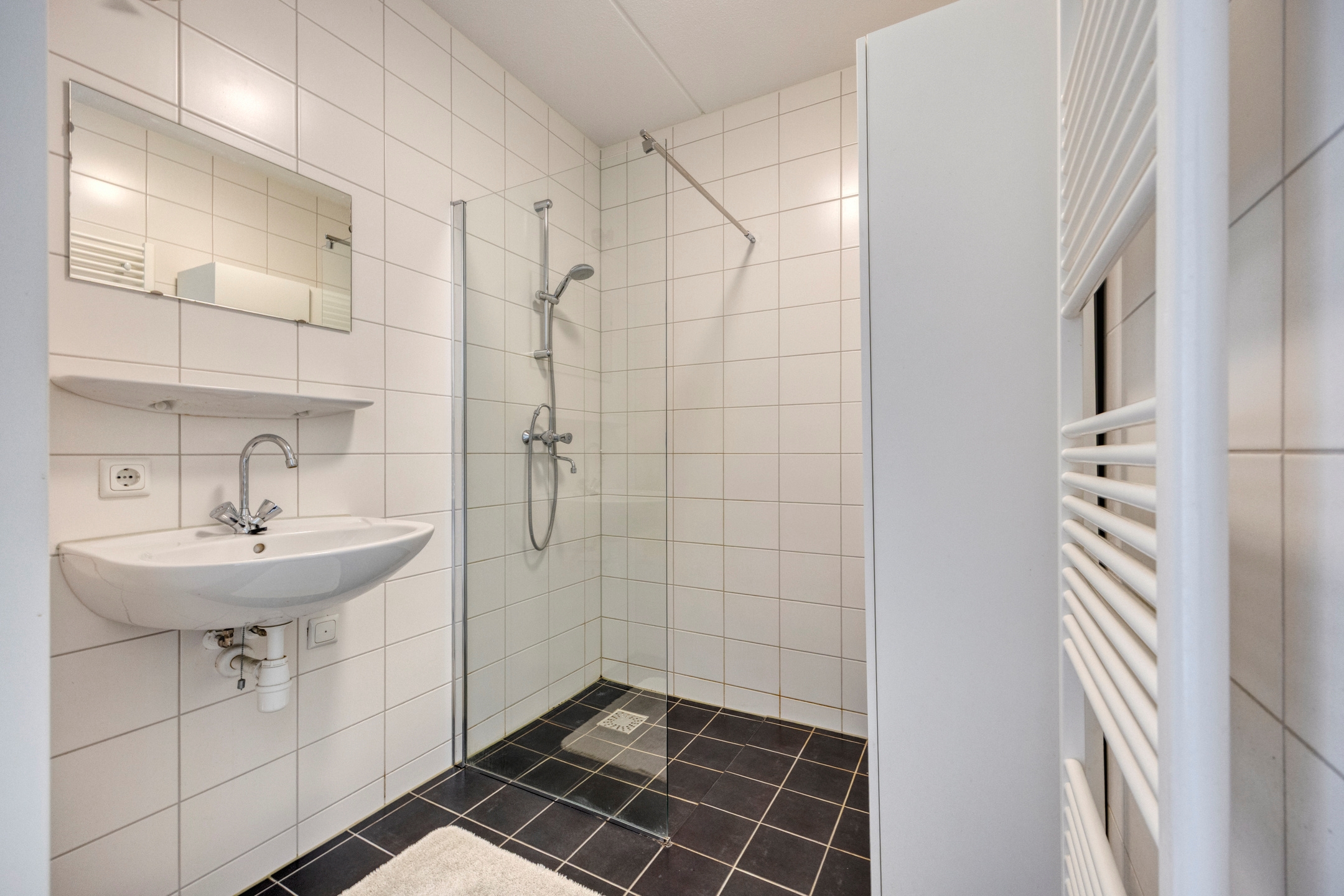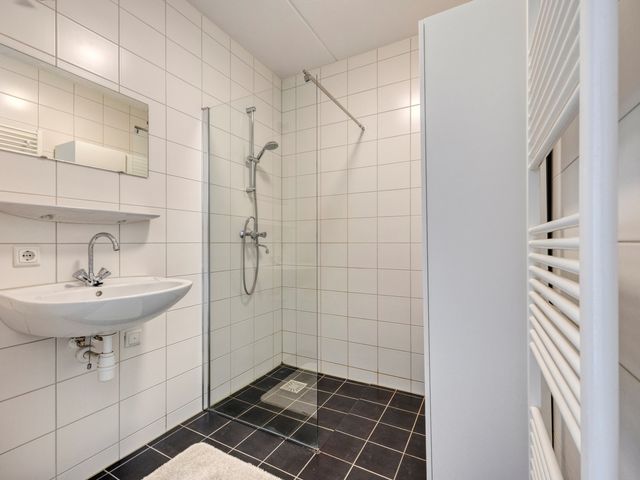 De badkamer is voorzien van een inloopdouche, een wastafel en een designradiator. De badkamer is geheel betegeld.