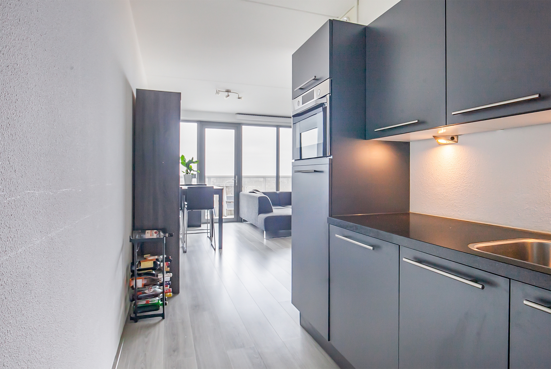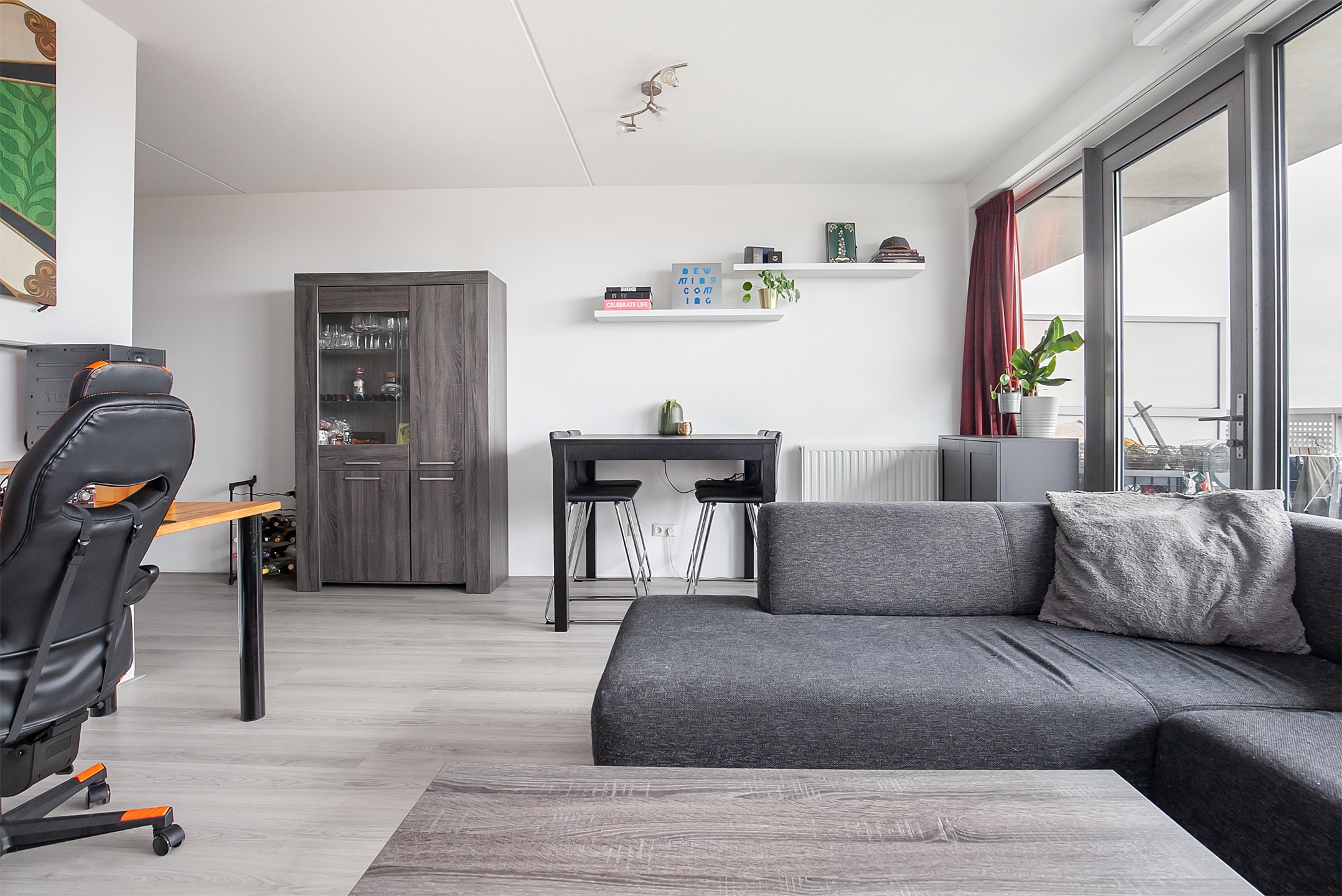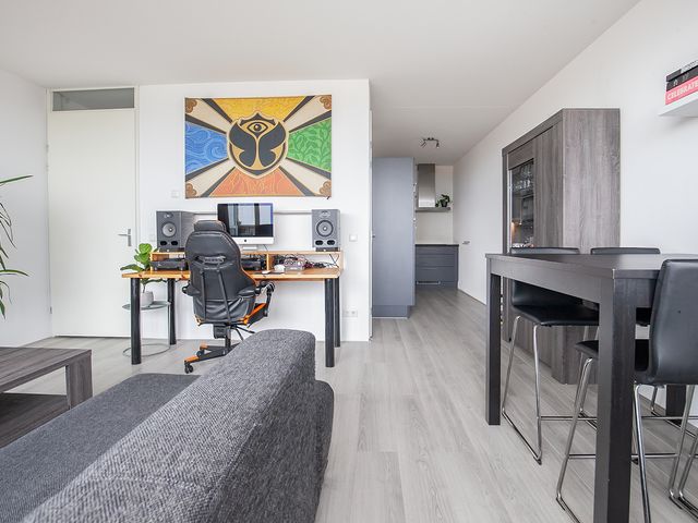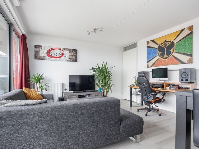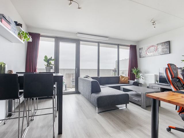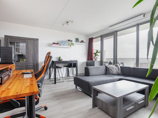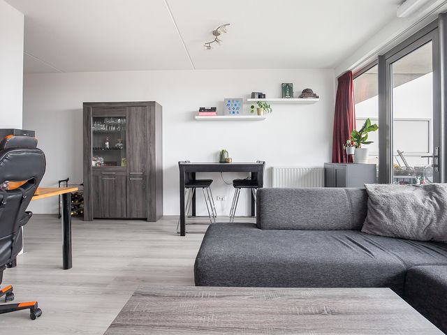 Door de grote glazen raampartij (dubbel glas) is de woonkamer er één met veel lichtinval. Door middel van een loopdeur heeft u toegang tot het ruime balkon. De woonkamer is afgewerkt met een laminaatvloer en de wanden zijn voorzien van stucwerk.