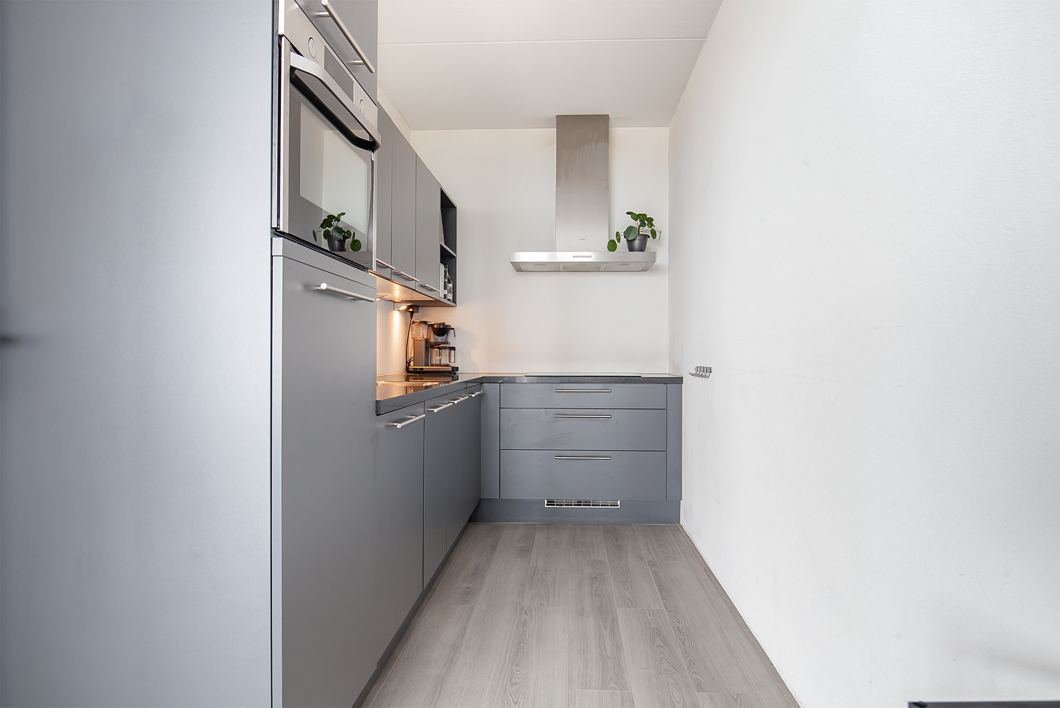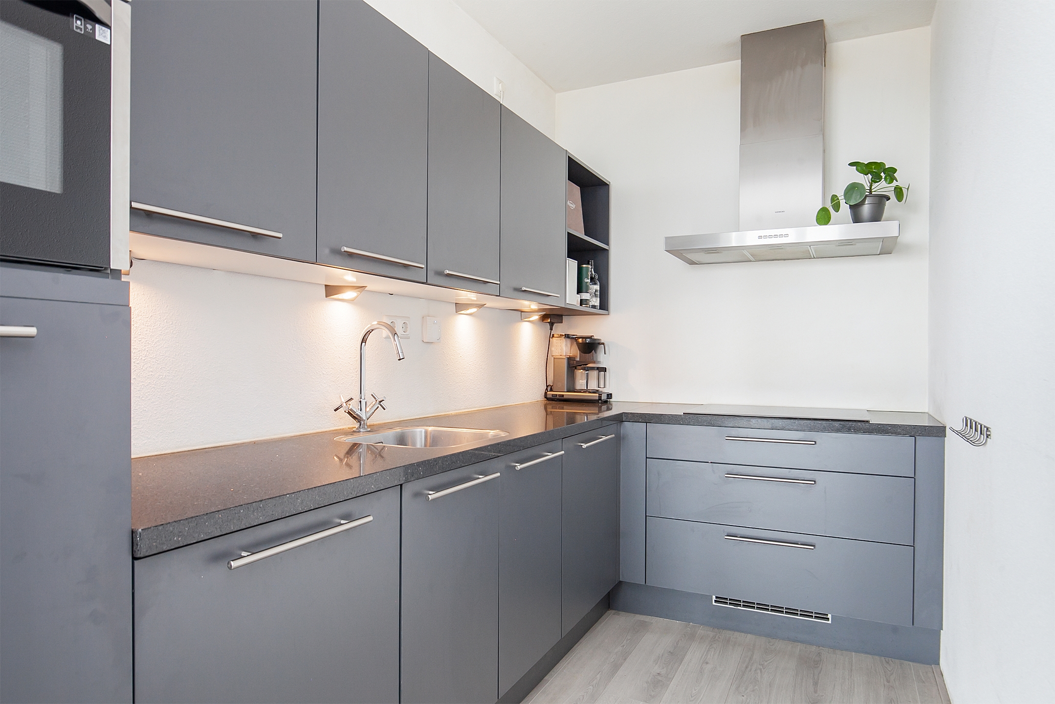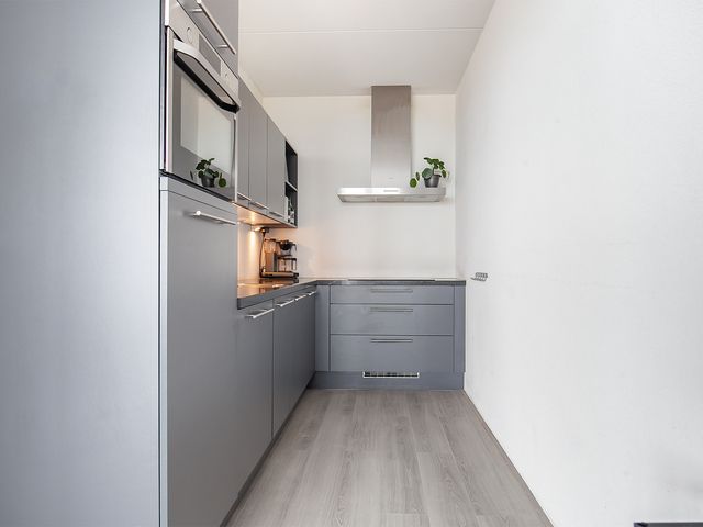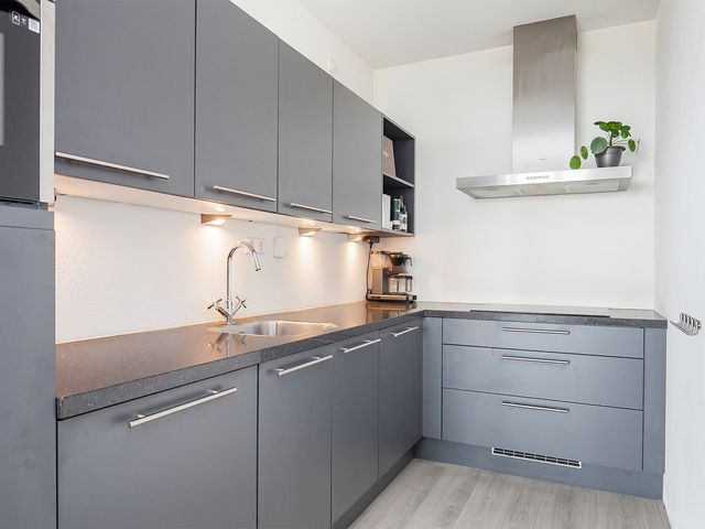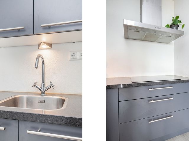 De open-keuken is voorzien van diverse onder- en bovenkasten, een groot natuurstenen werkblad en is uitgerust met de volgende inbouwapparatuur; 4-pits inductie kookplaat, rvs afzuigkap, combi-oven (2022 vervangen), koelkast en vaatwasser. Vanuit de keuken is er toegang tot de bijkeuken/berging.