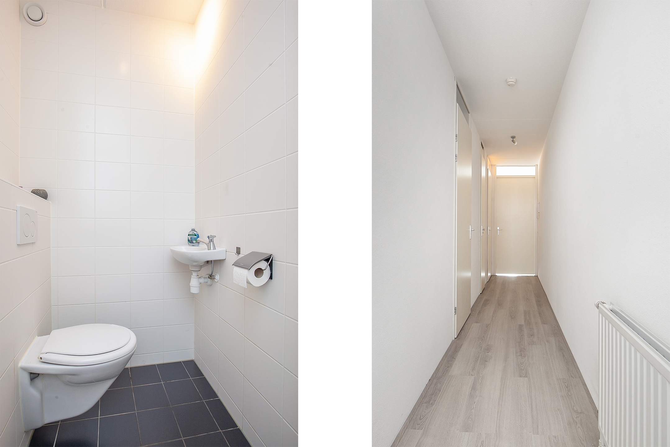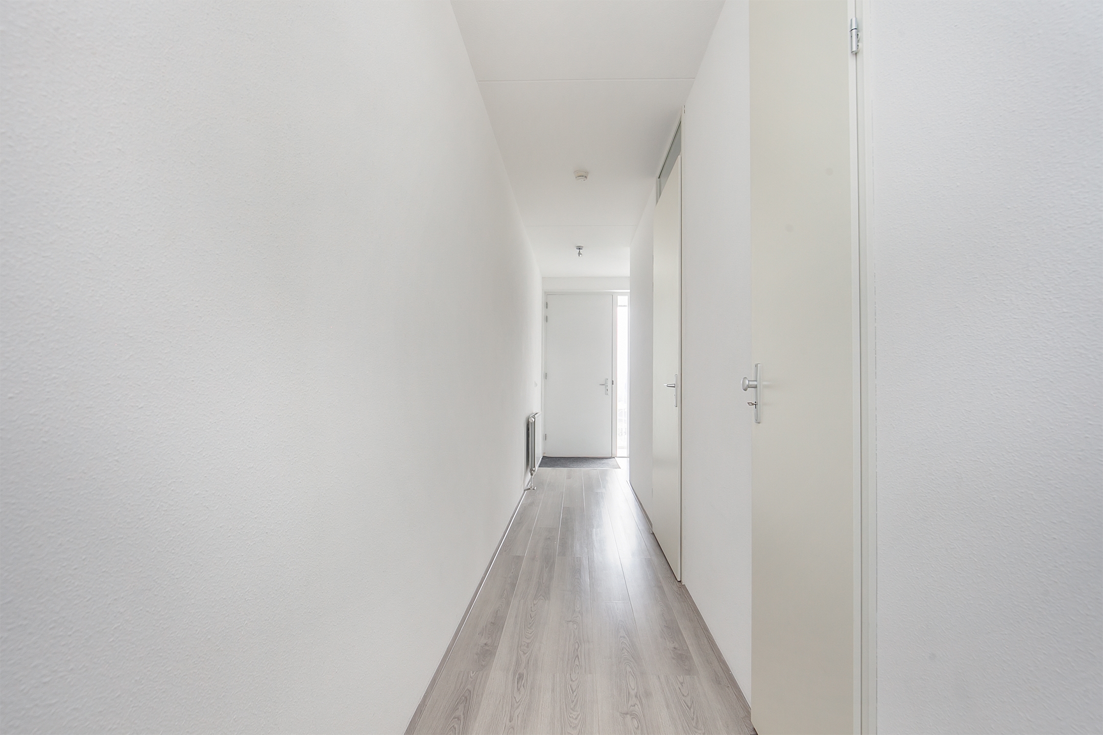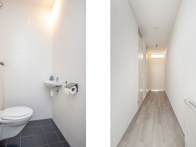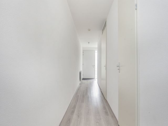 De ruime hal biedt toegang tot de slaapkamer, meterkast, toilet, badkamer en de woonkamer. De wanden zijn voorzien van stucwerk en de vloer is afgewerkt met laminaat.