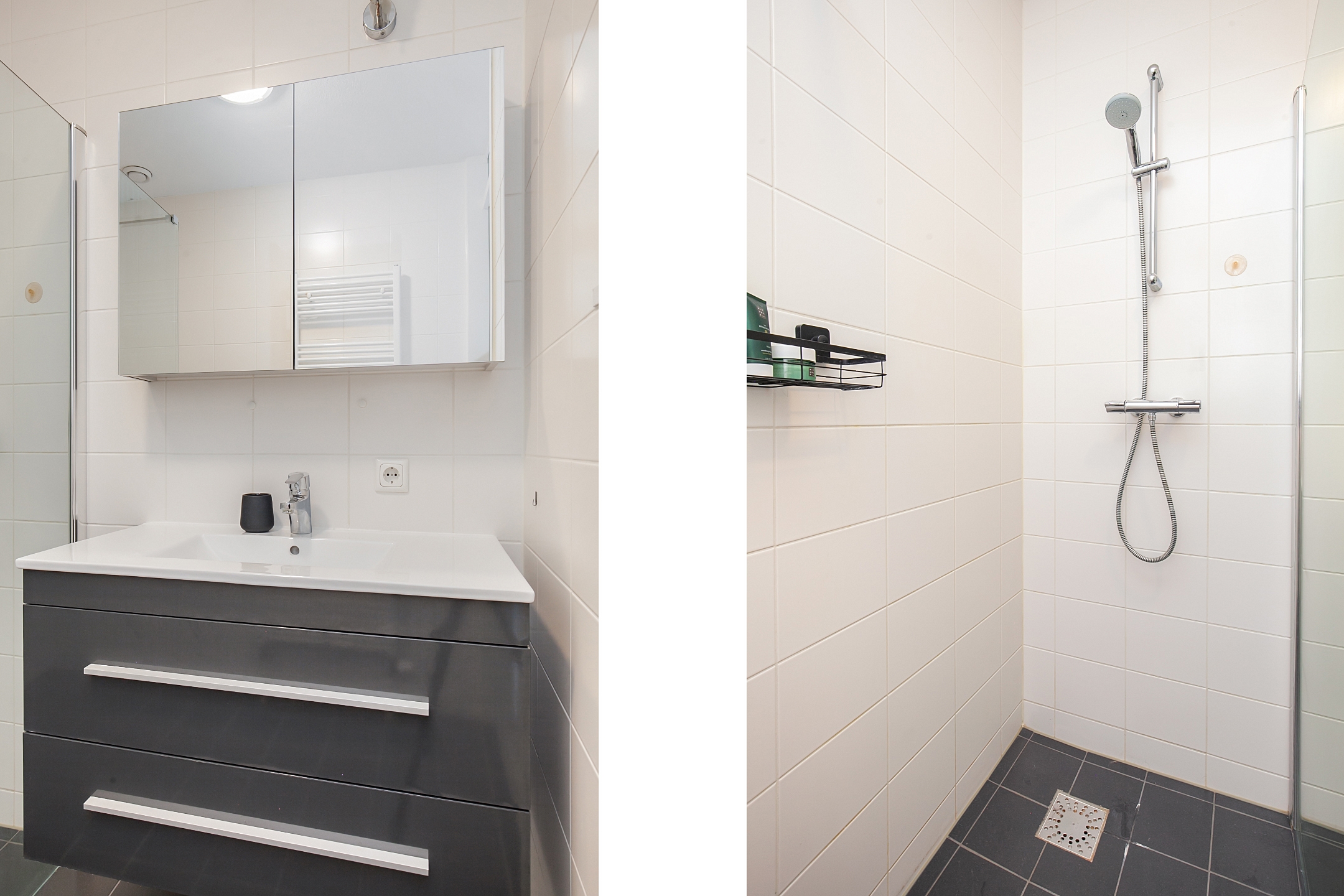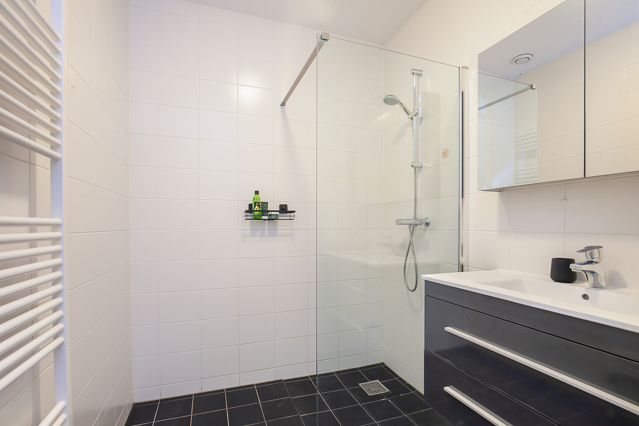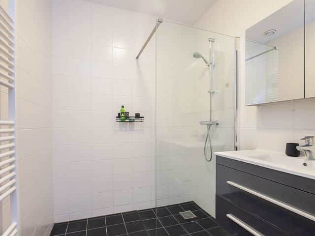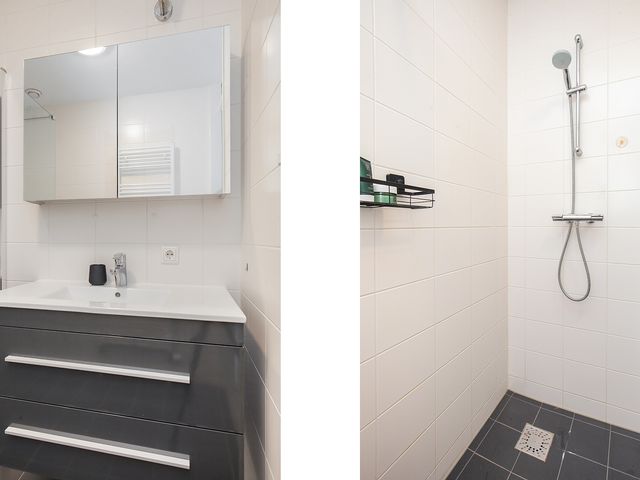 De badkamer is geheel betegeld en is voorzien van een inloopdouche en een wastafel in een wastafelmeubel met een spiegelkast.