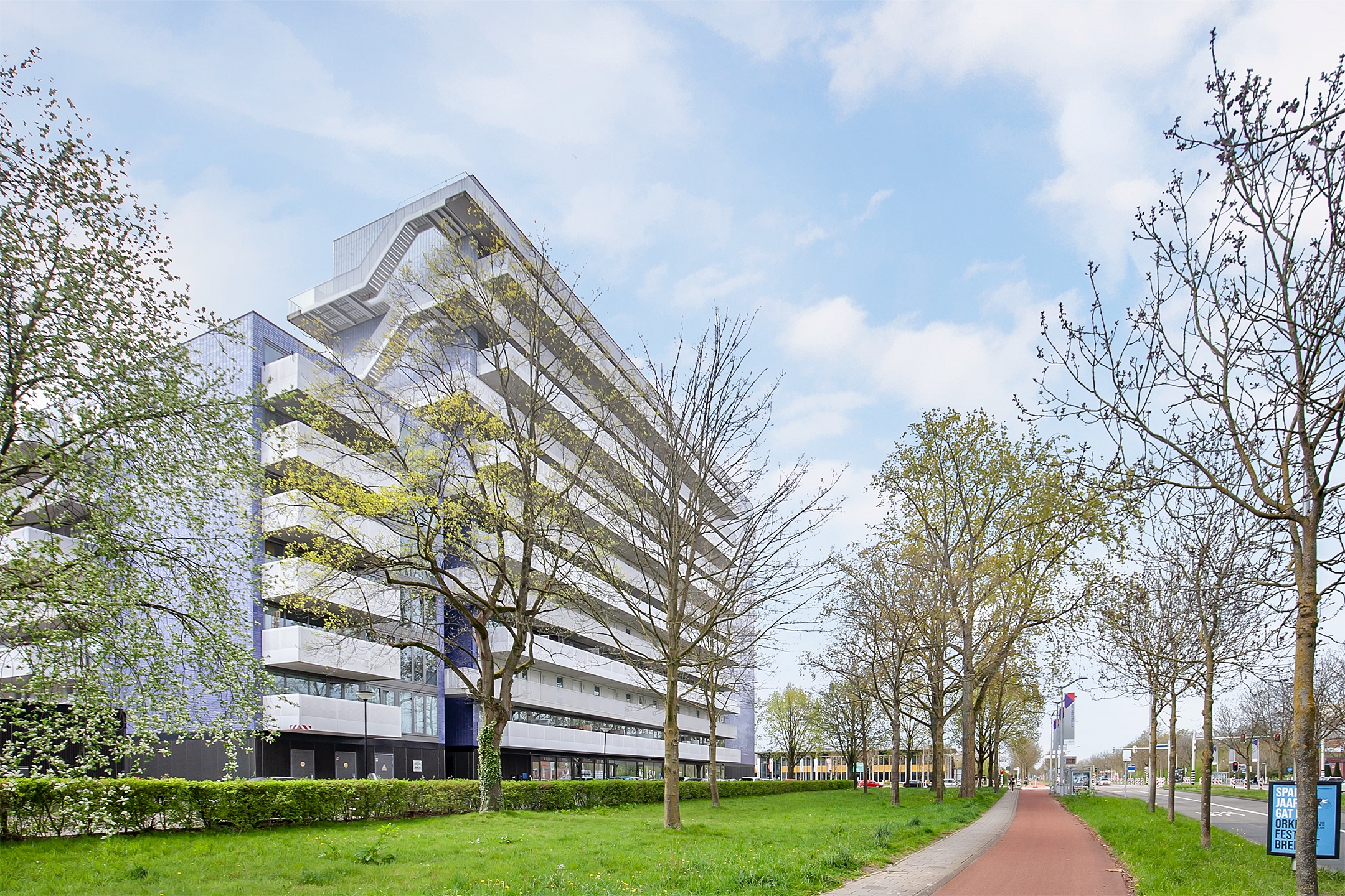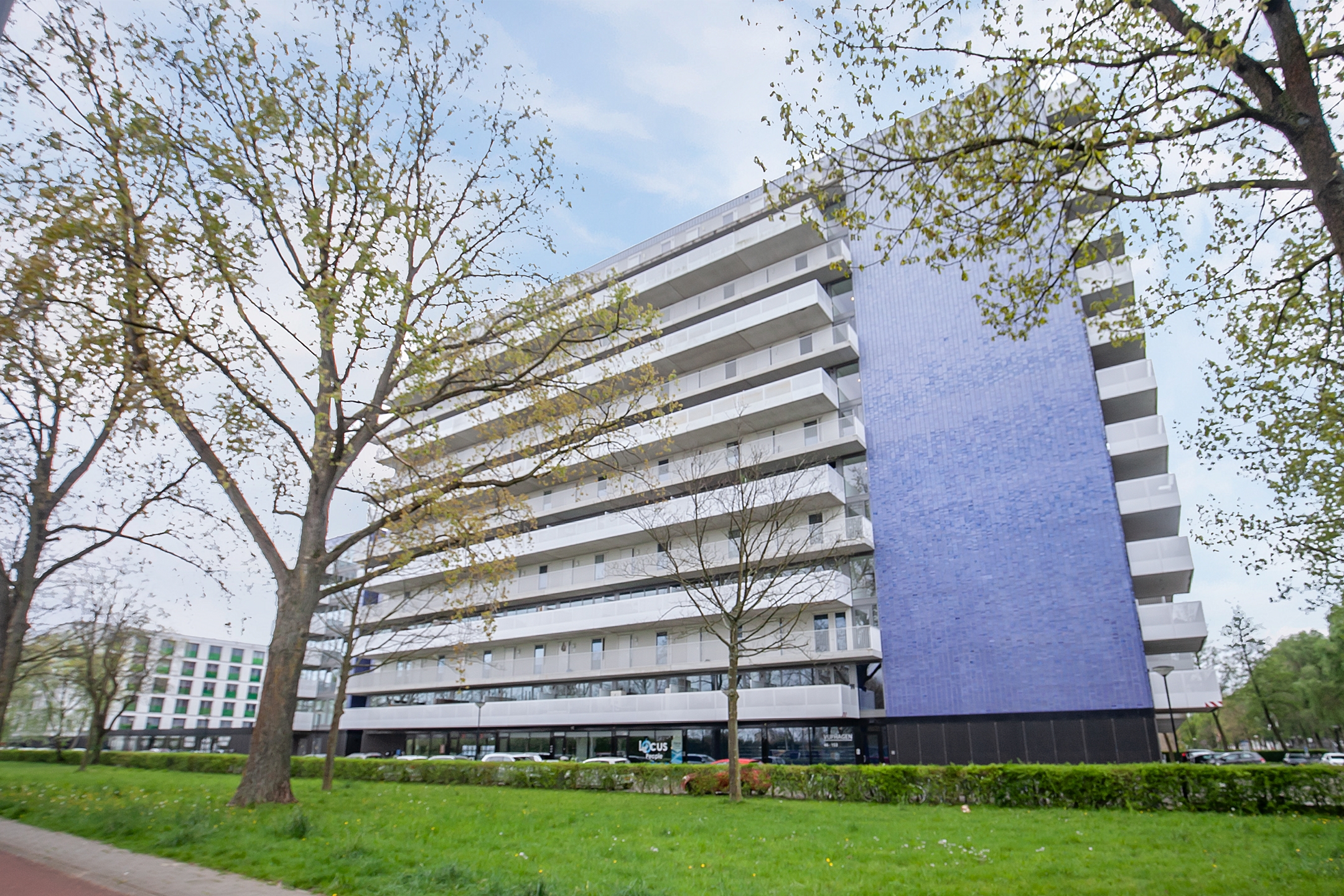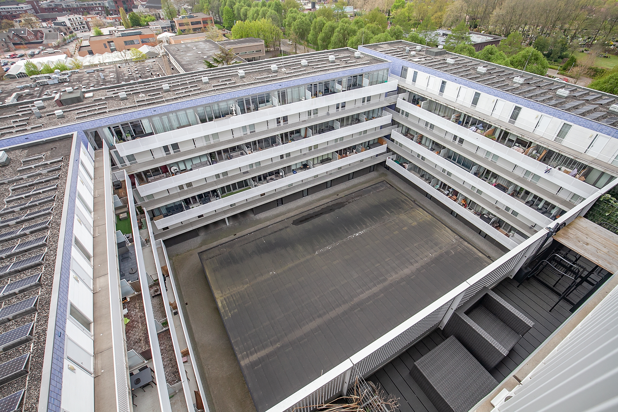 Achter het gebouw ligt een voetbalveldje en op het dak van de parkeergarage zijn loungeplekken gecreëerd.