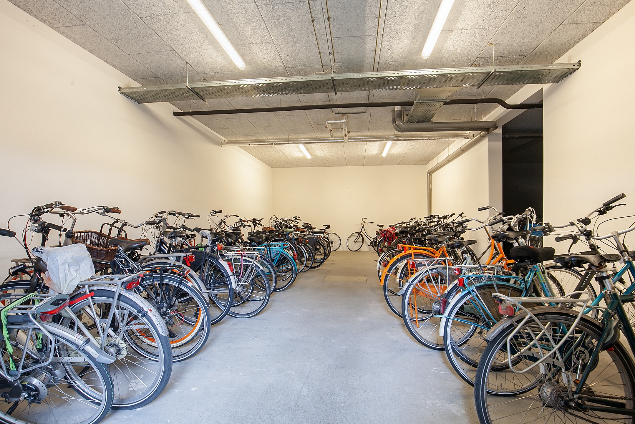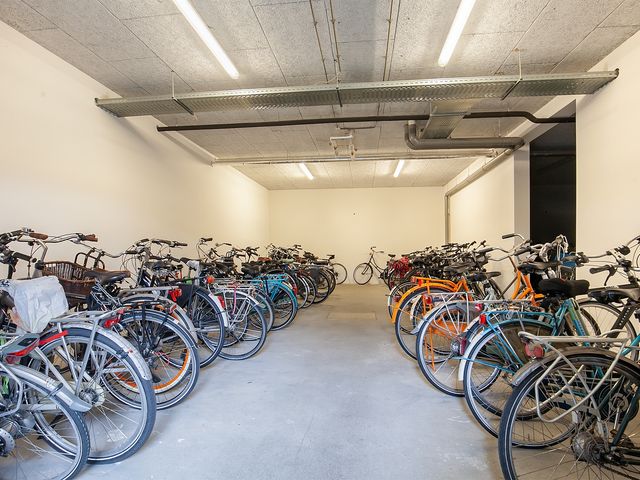 Een afgesloten gezamenlijke fietsenberging op de begane grond.