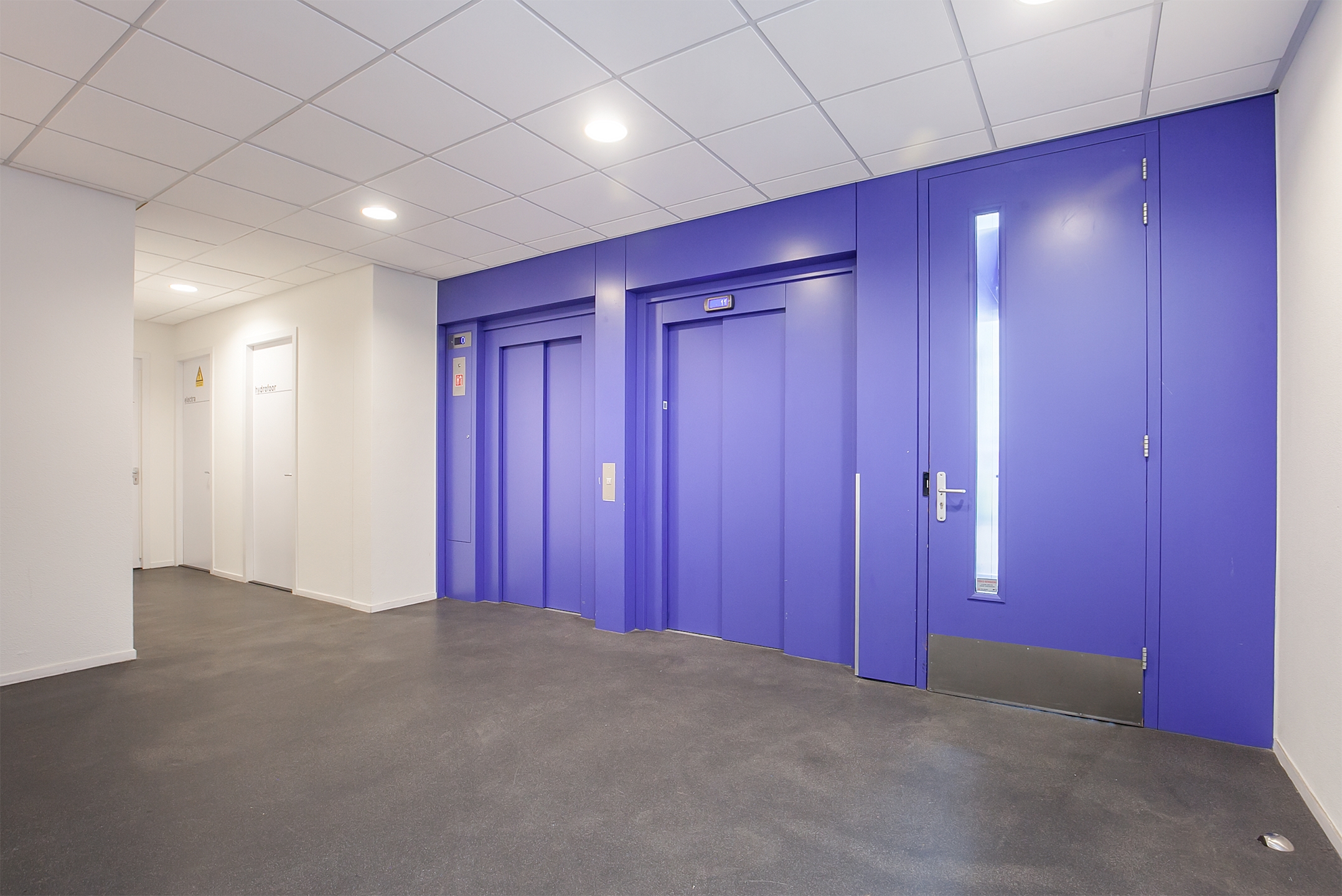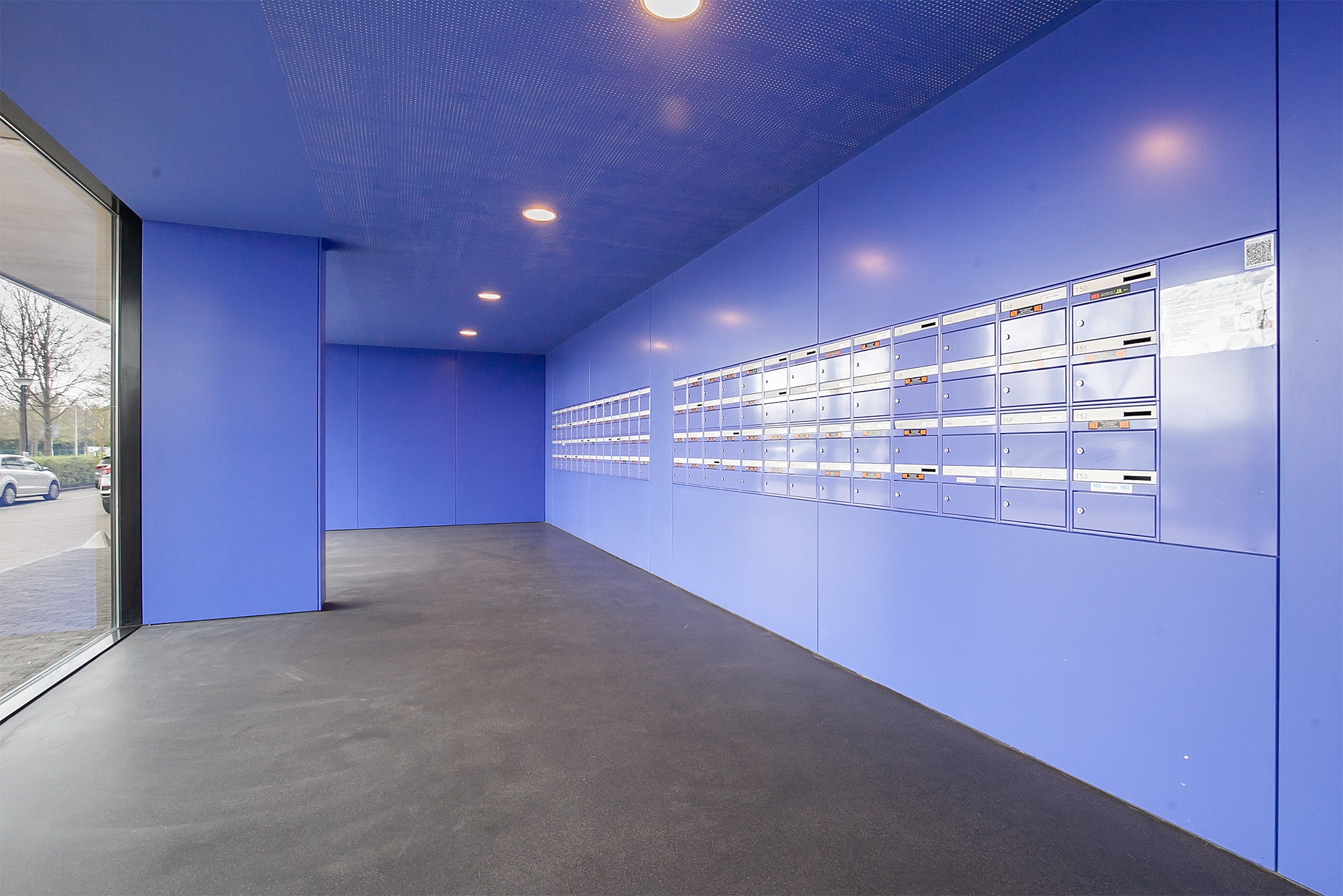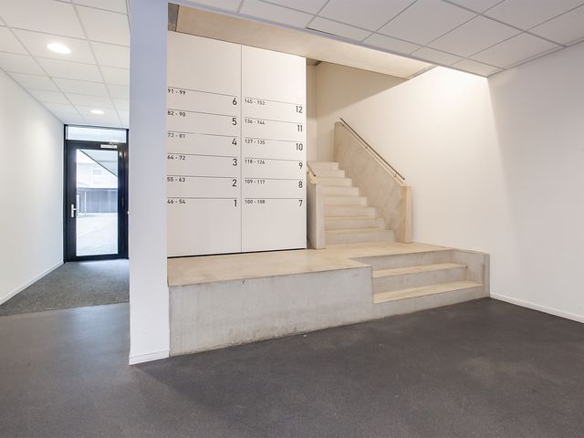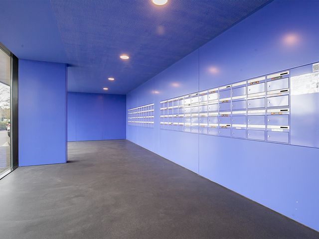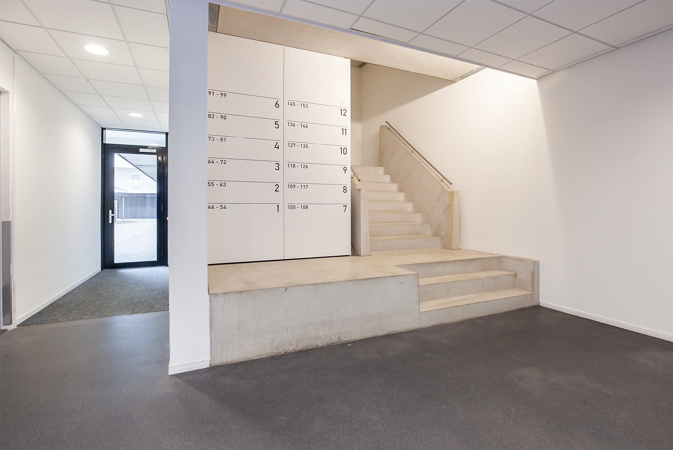 Centrale hal met een bellentableau en intercominstallatie, de brievenbussen, toegang tot de liften en het trappenhuis.