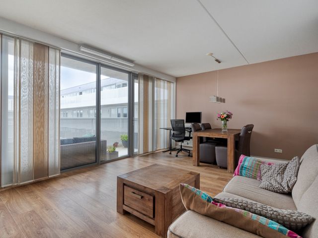 Zodra je de woonkamer binnenkomt, trekken de royale ramen meteen de aandacht. Ze laten veel daglicht binnen en creëren een aangename sfeer. Via de loopdeur stap je zo het ruime balkon op. De woonkamer is modern afgewerkt met een laminaatvloer en glad gestucte wanden.