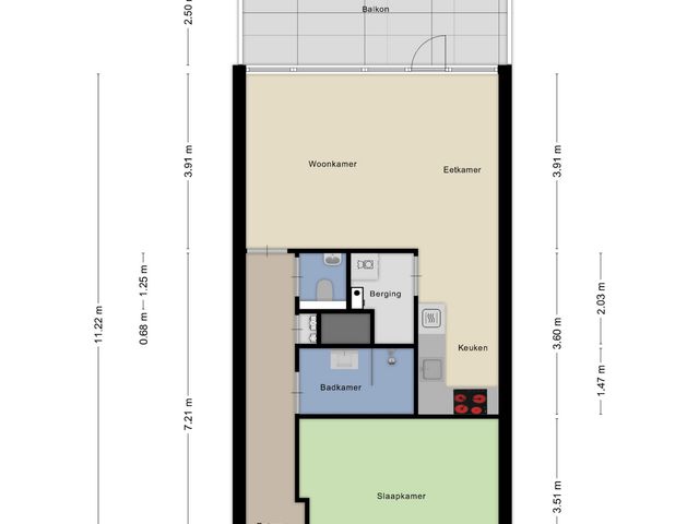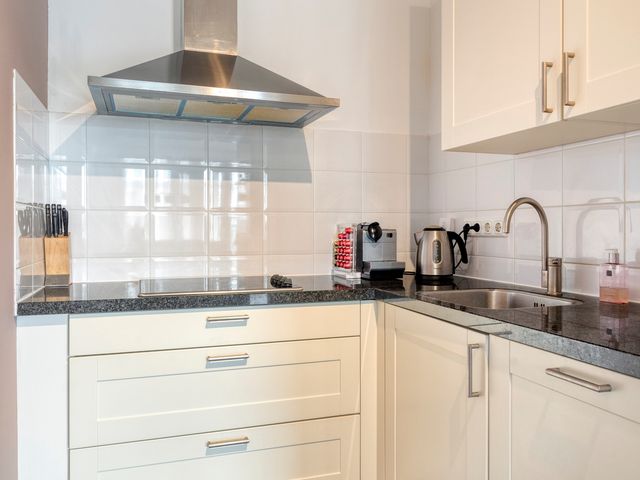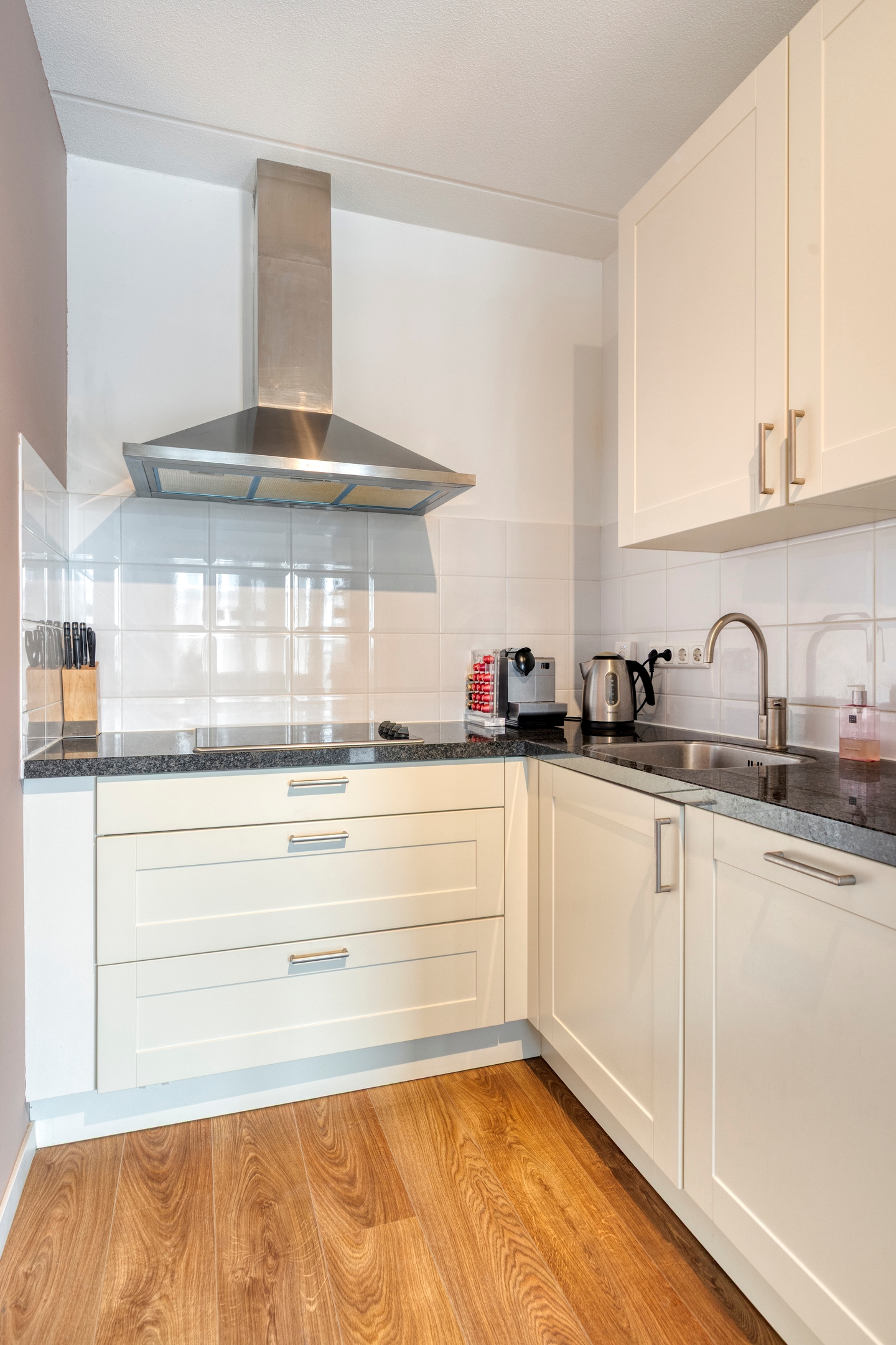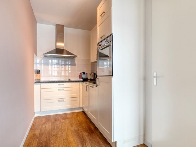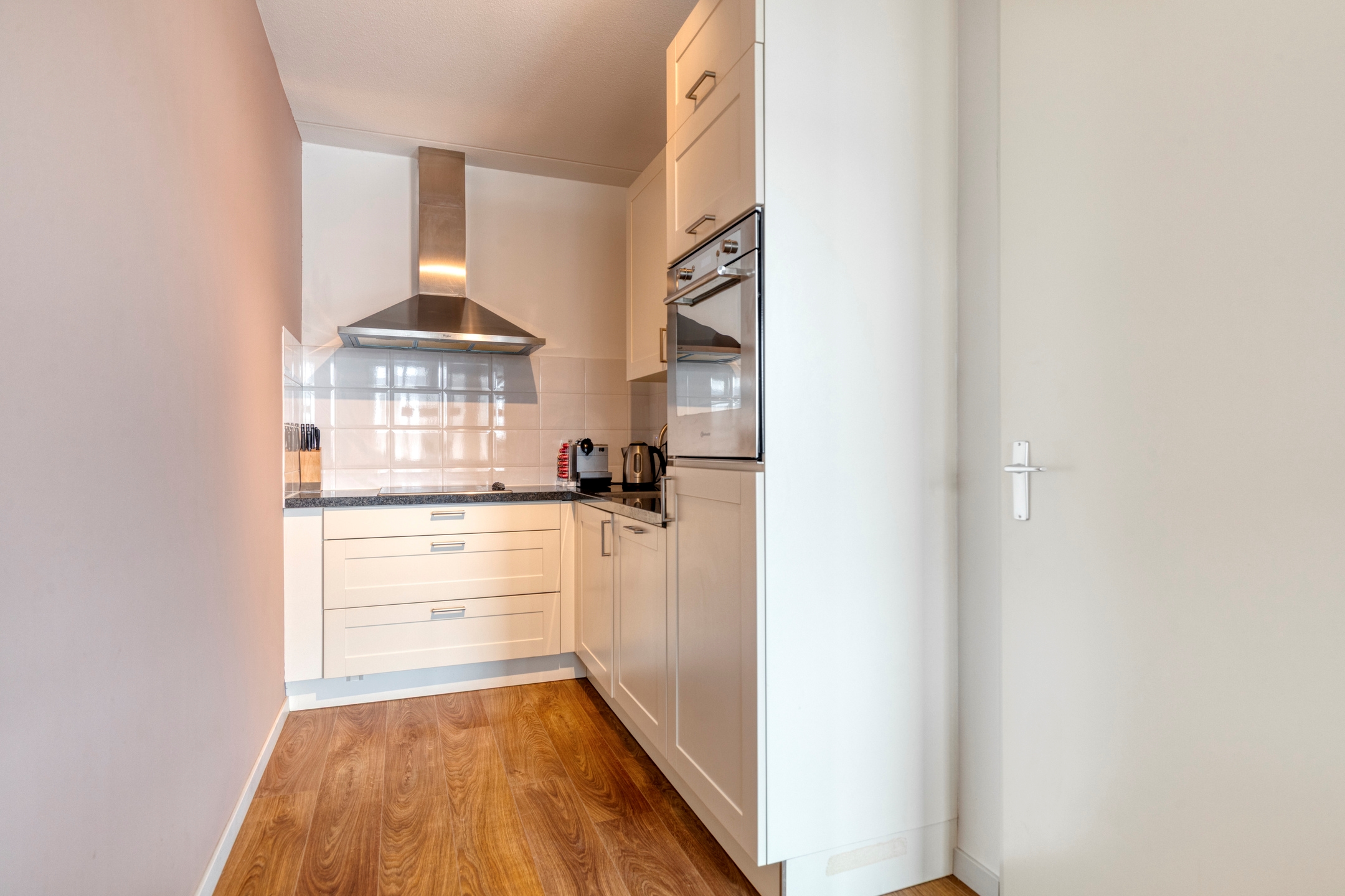 De open keuken beschikt over diverse onder- en bovenkasten en lades en is uitgerust met inbouwapparatuur zoals een 4-pits elektrische kookplaat, rvs-afzuigkap, oven, inbouwkoelkast en vaatwasser. Vanuit de keuken is de berging bereikbaar.
