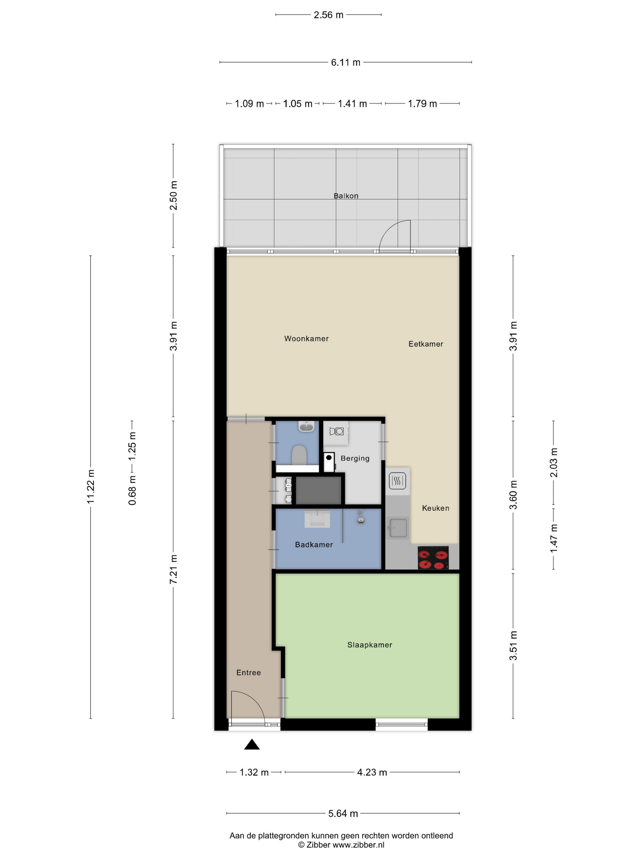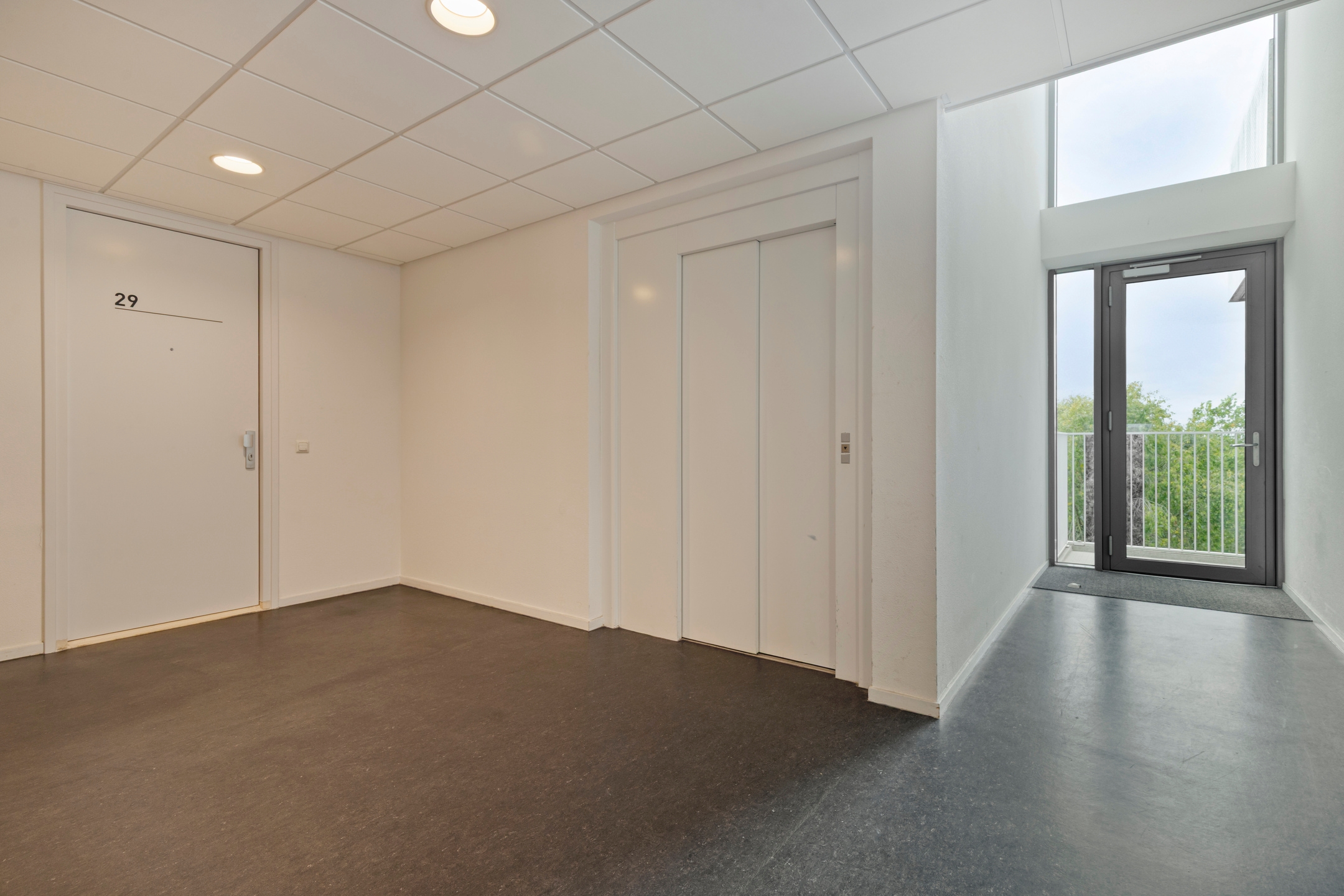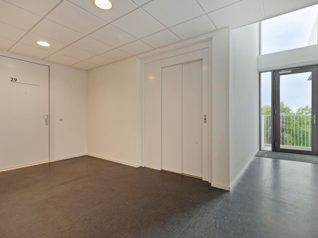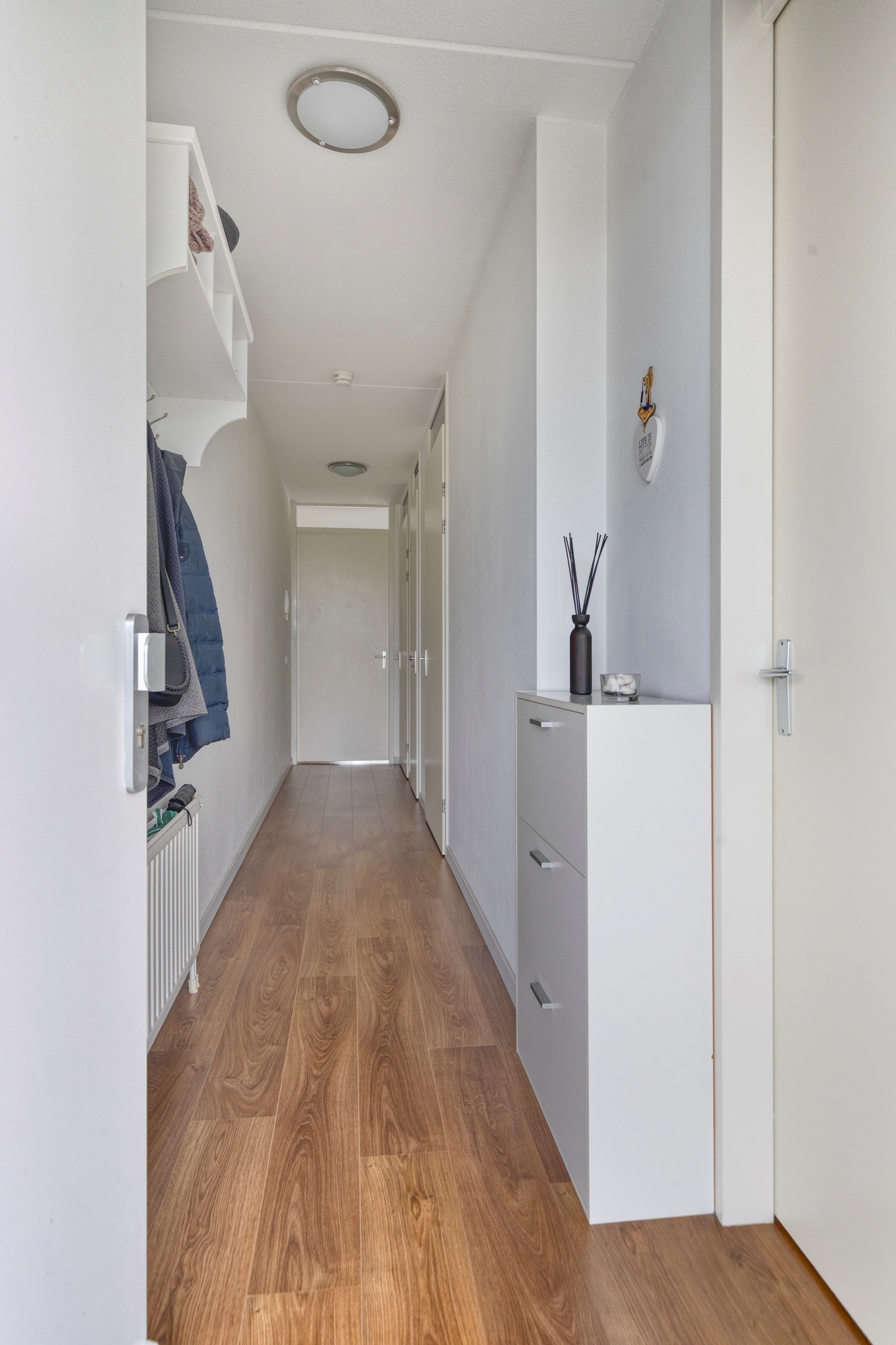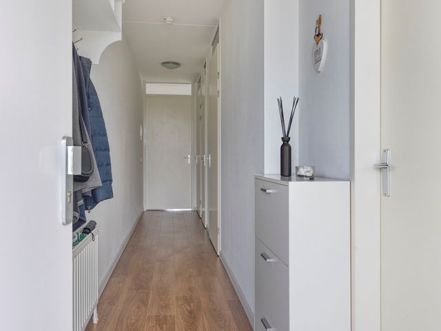 Bij binnenkomst kom je in de ruime hal, die fungeert als centraal vertrek en toegang biedt tot de slaapkamer, meterkast, het toilet en de woonkamer. De nette wandafwerking en de laminaatvloer zorgen direct voor een verzorgde uitstraling.
