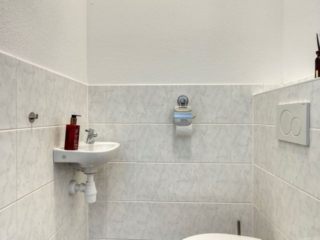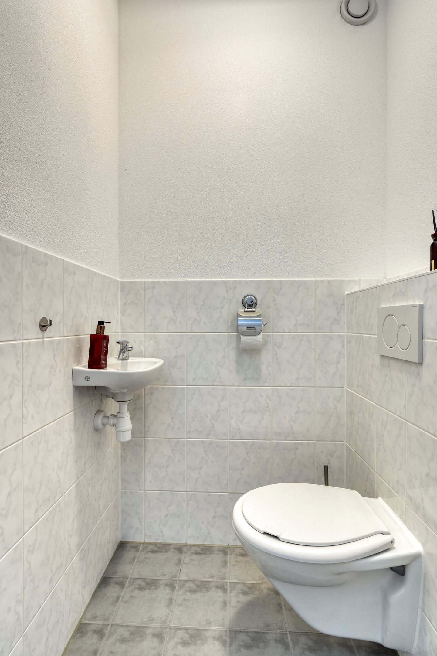 Het toilet is deels betegeld en voorzien van een wandcloset en fonteintje.