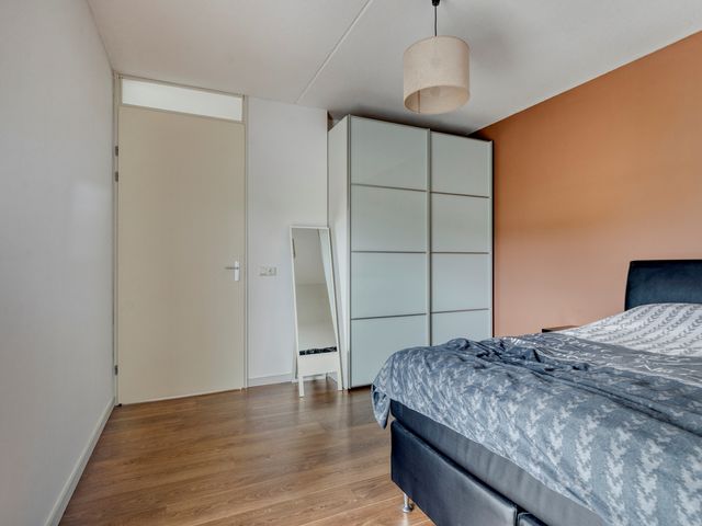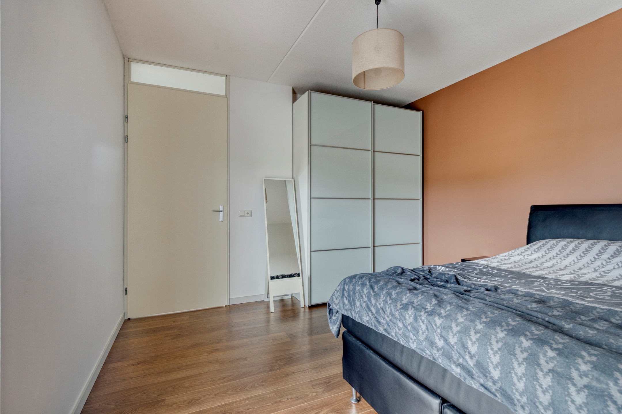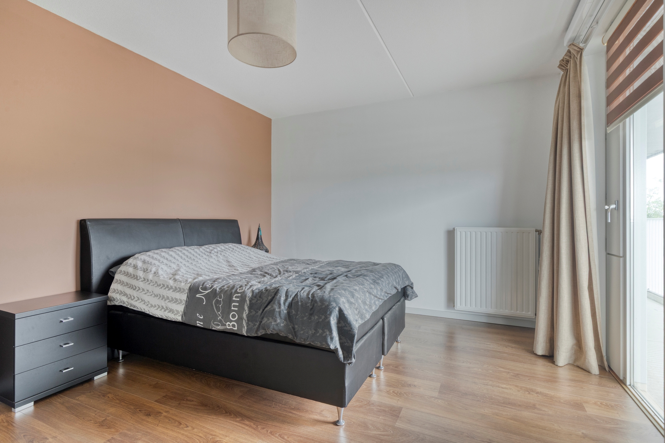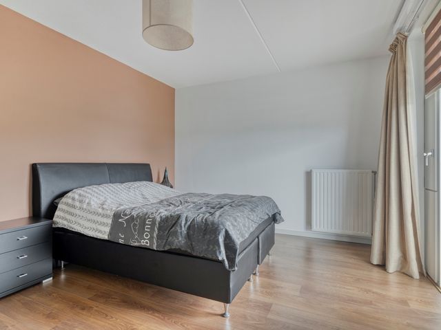 De slaapkamer is royaal van opzet en licht door de grote raampartij. Strak stucwerk en een laminaatvloer maken de kamer verzorgd en uitnodigend.