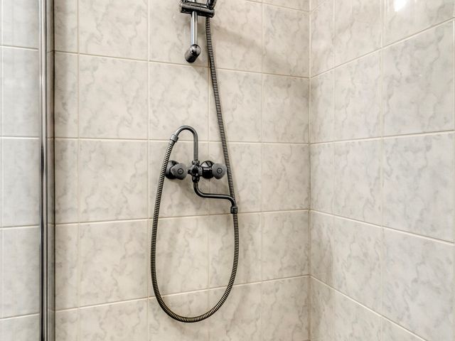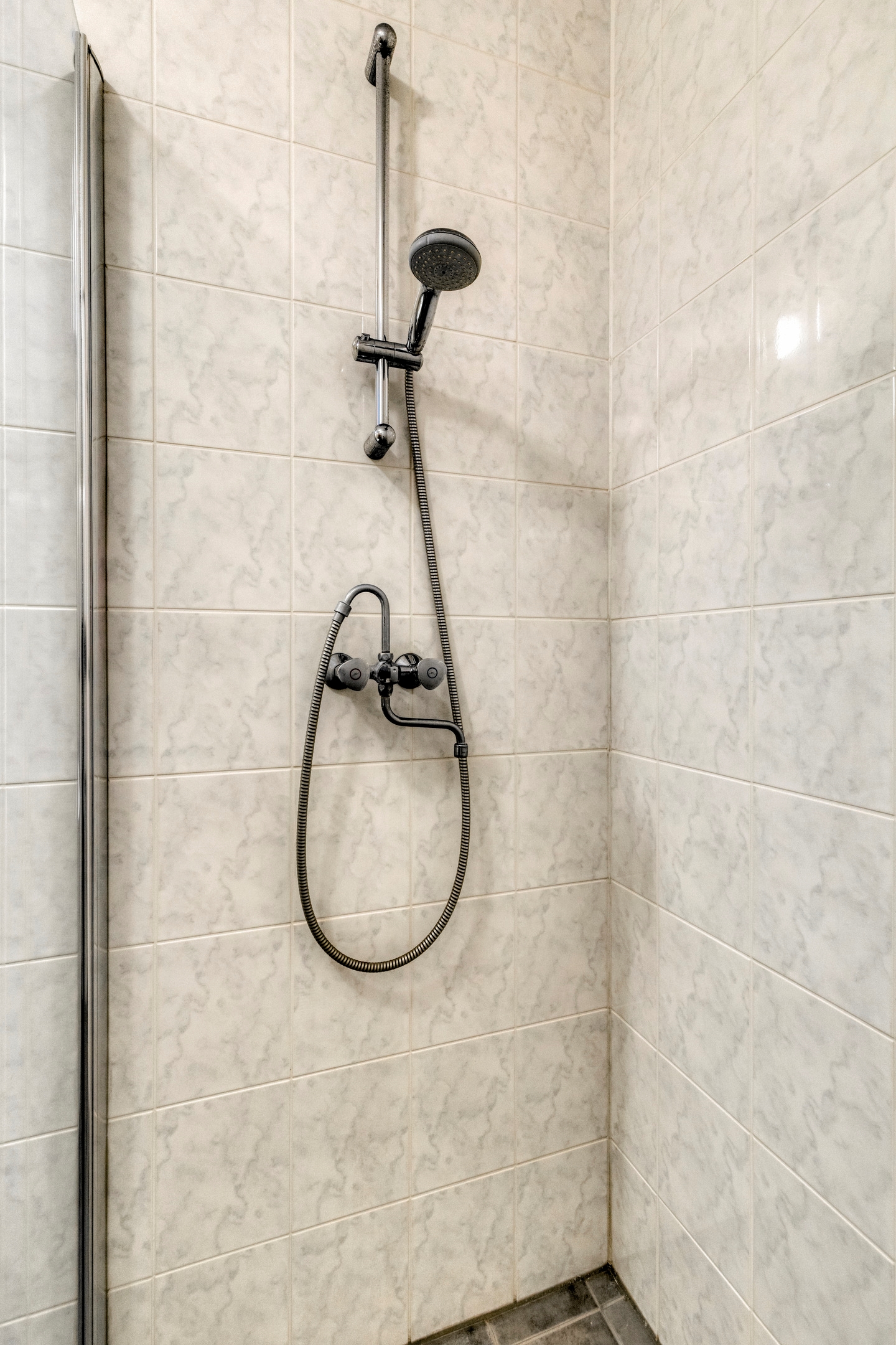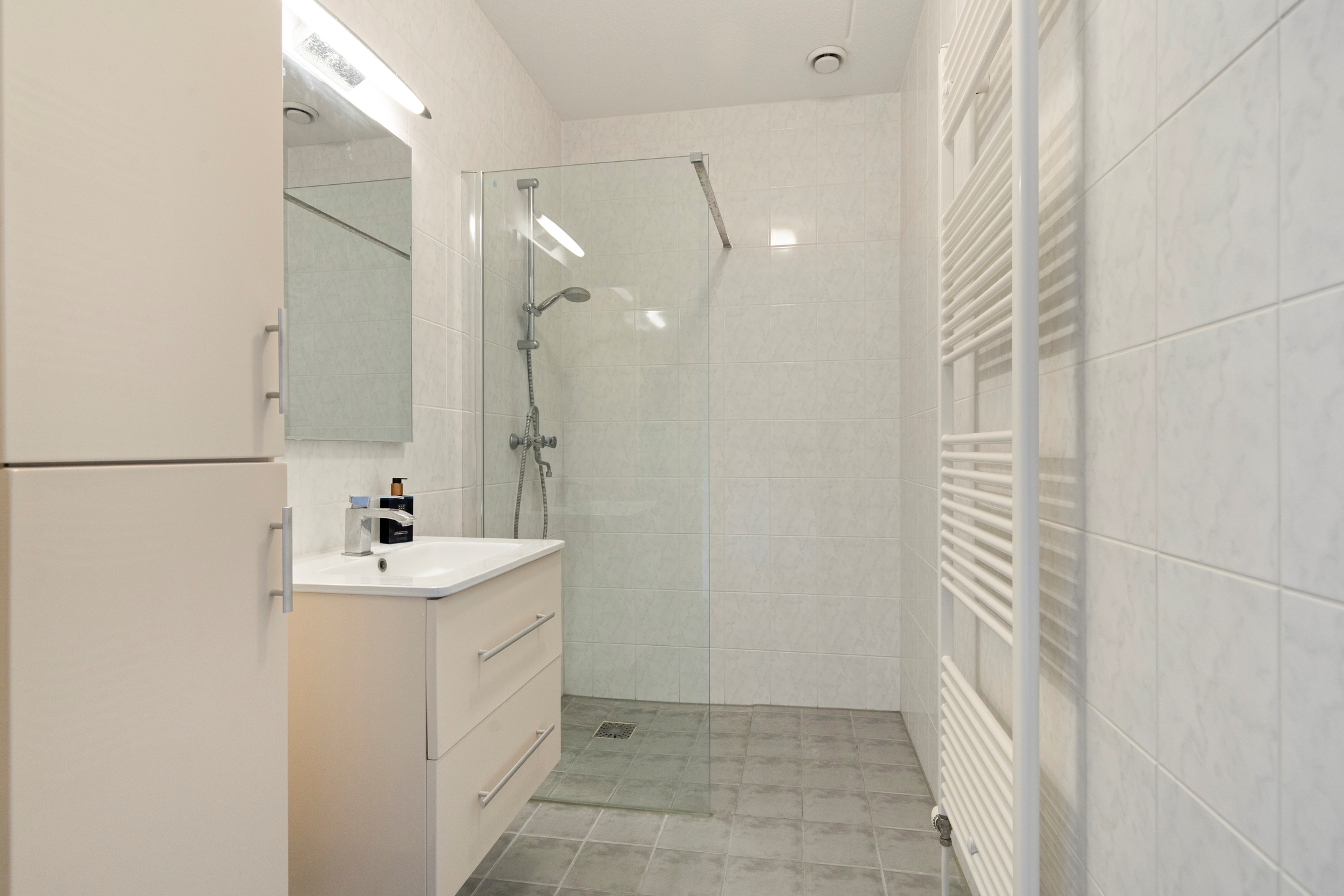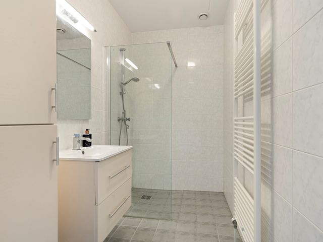 De badkamer is geheel betegeld en voorzien van een inloopdouche en een wastafel met badkamermeubel.