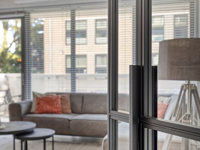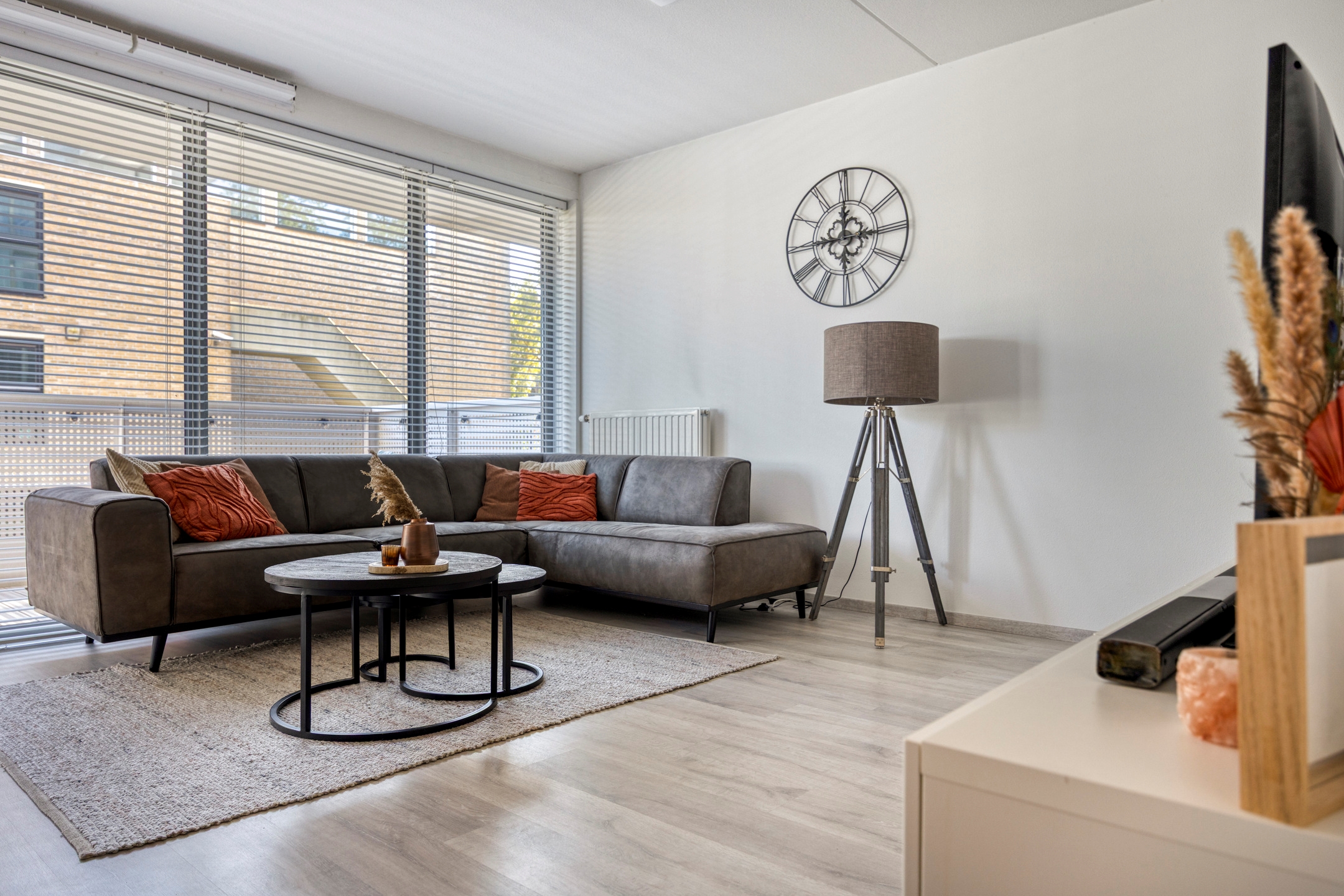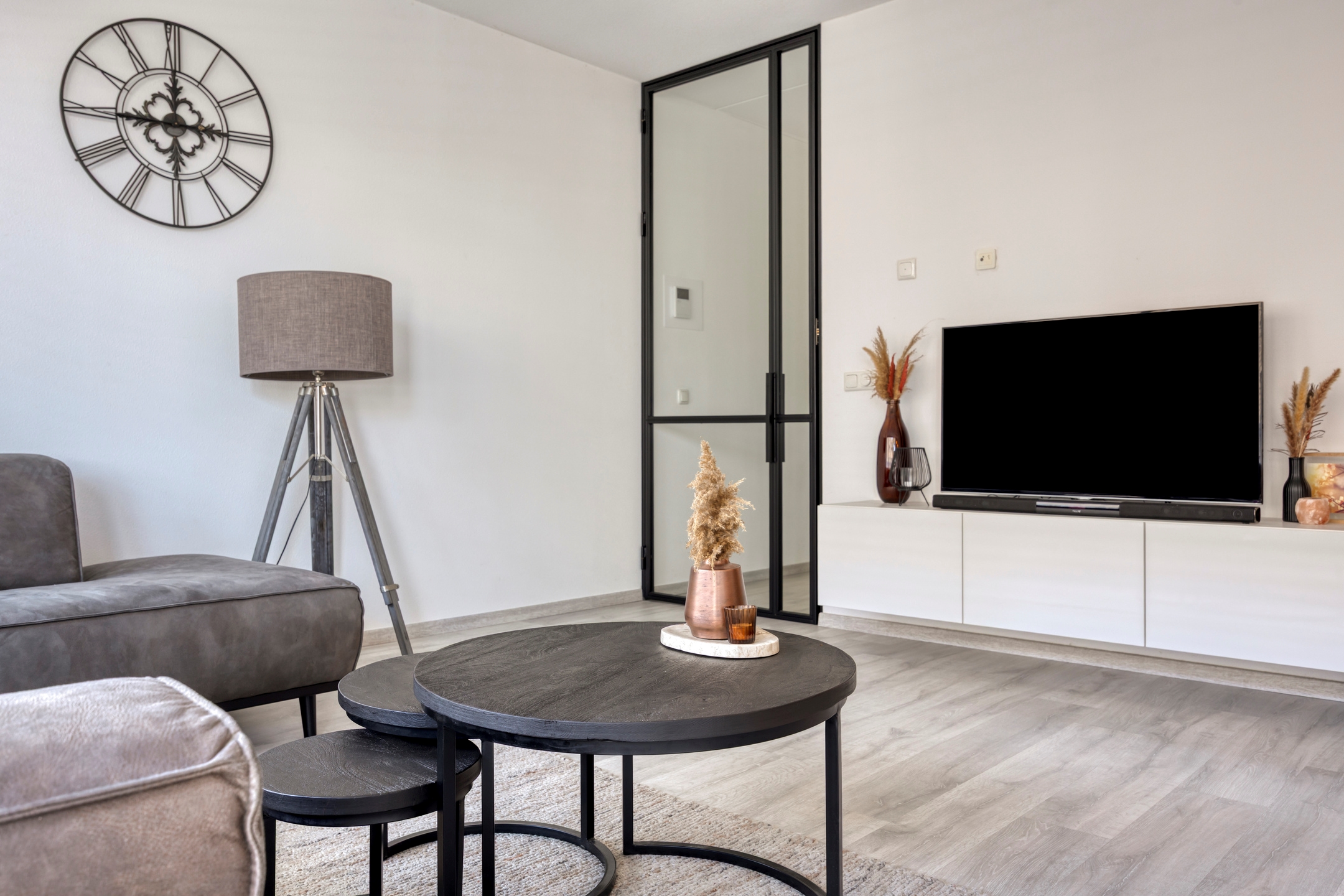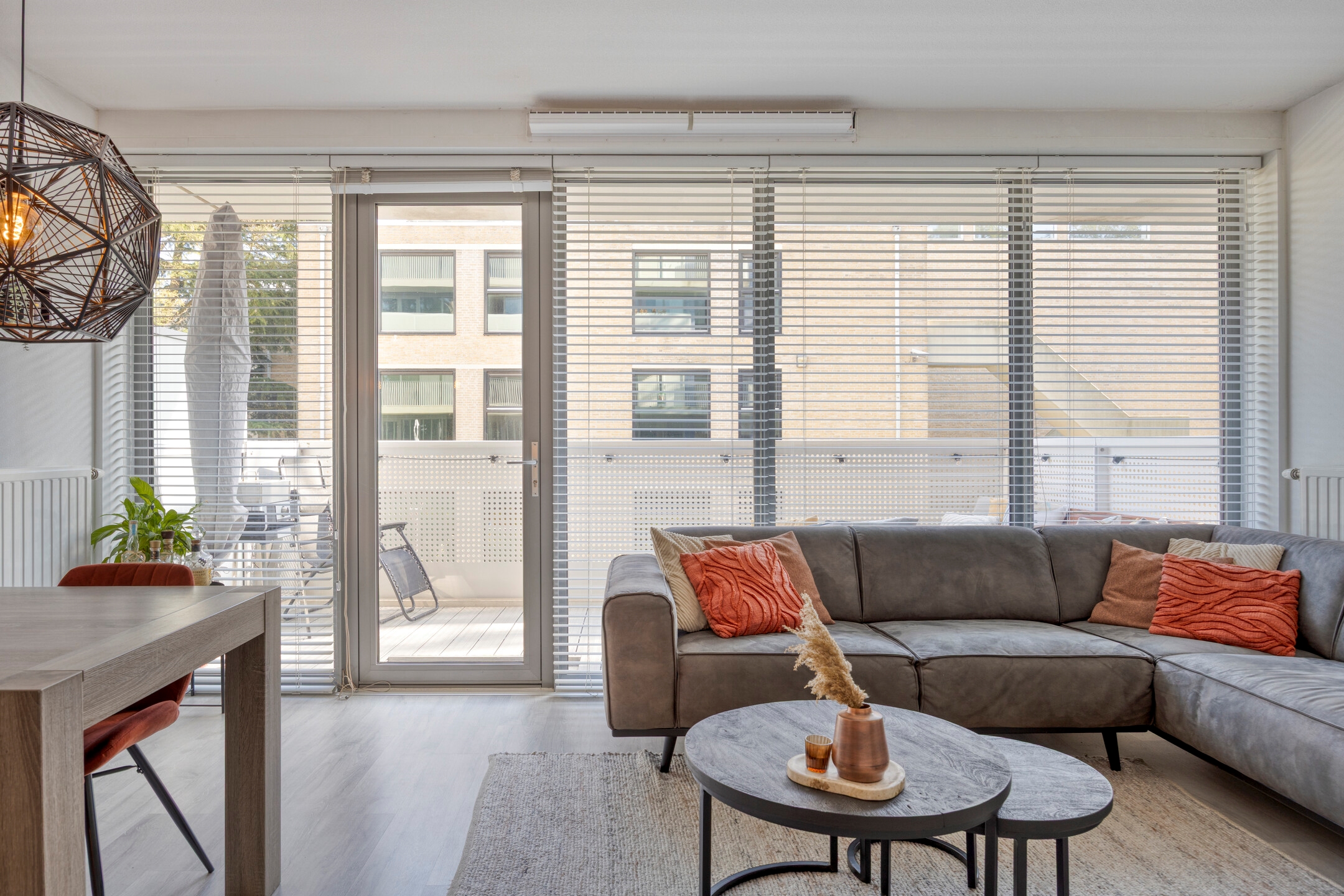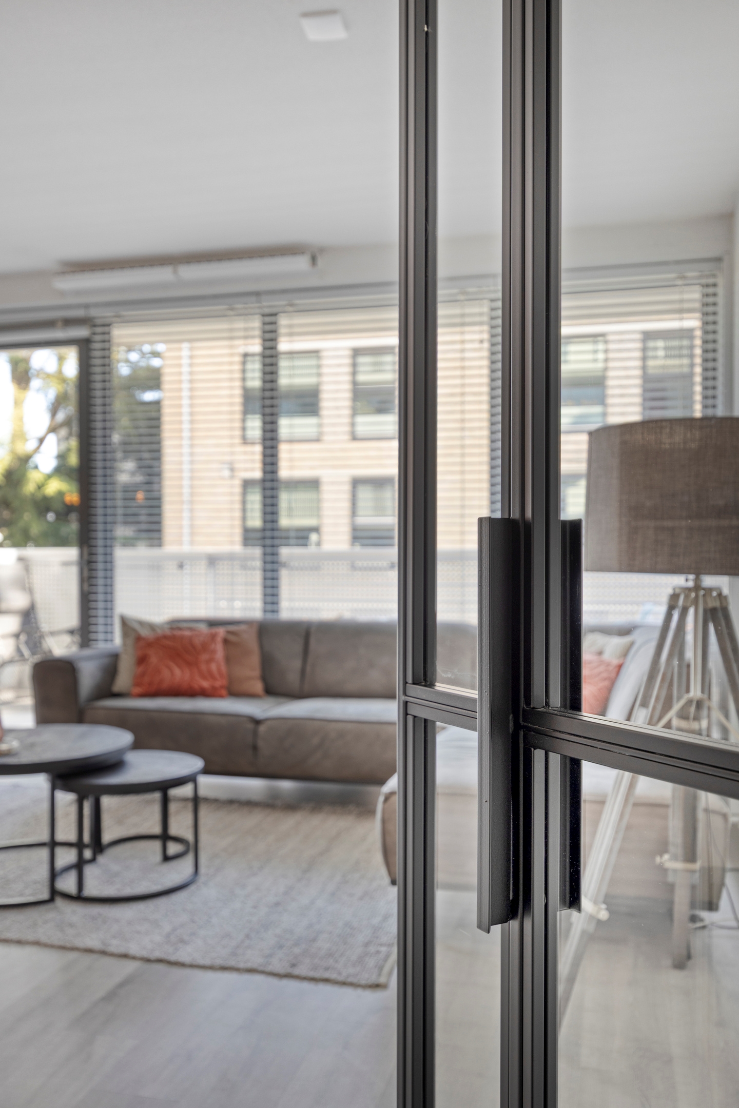 Vanuit de hal leid een moderne stalen deur je naar de lichte woonkamer. Dankzij de grote glazen pui geniet de ruimte van volop daglicht en heeft u direct toegang tot het balkon.