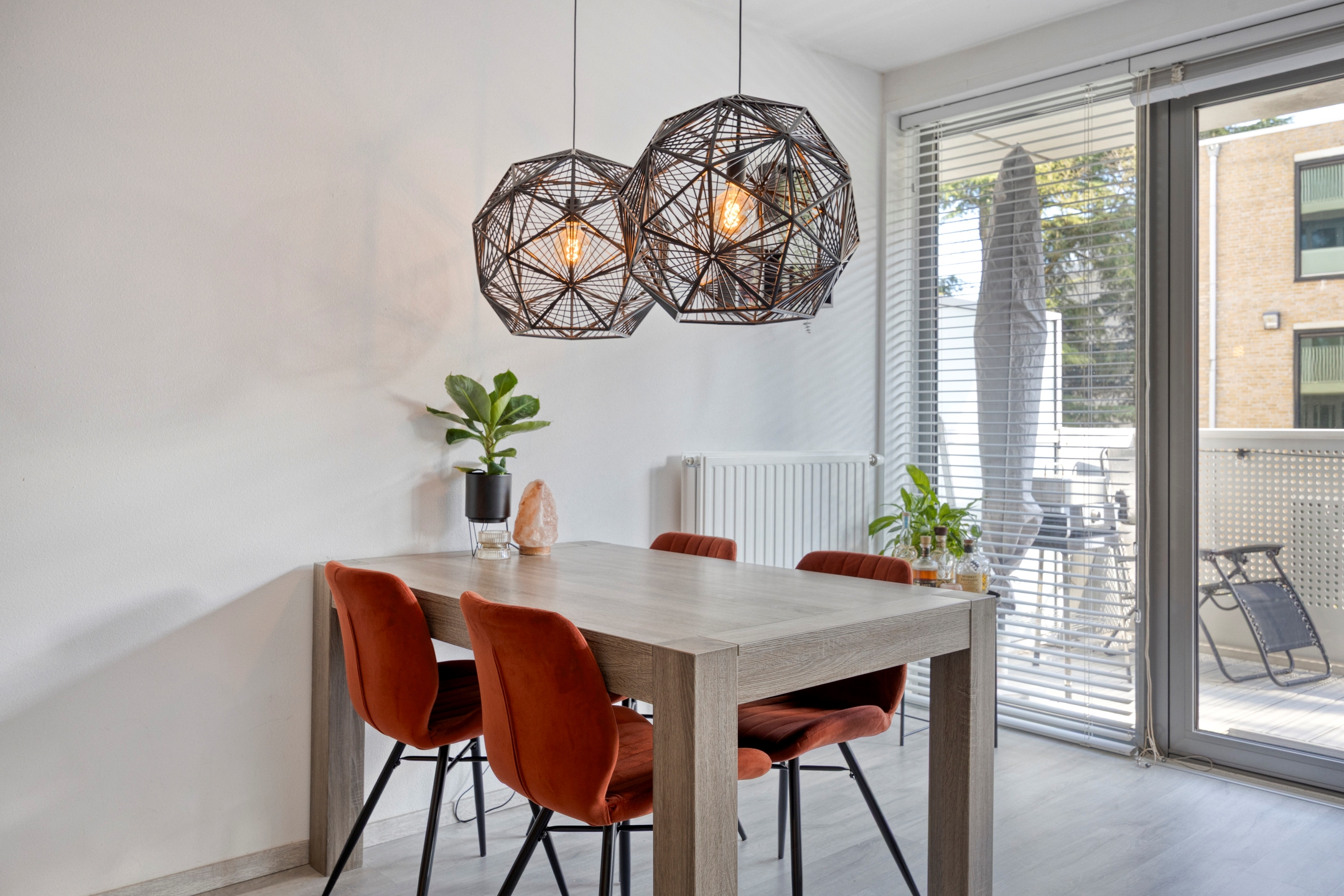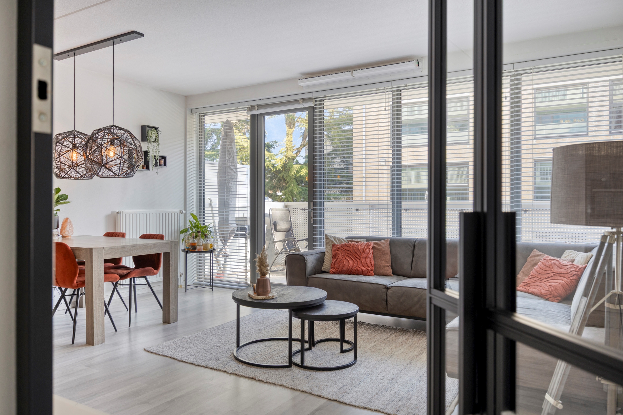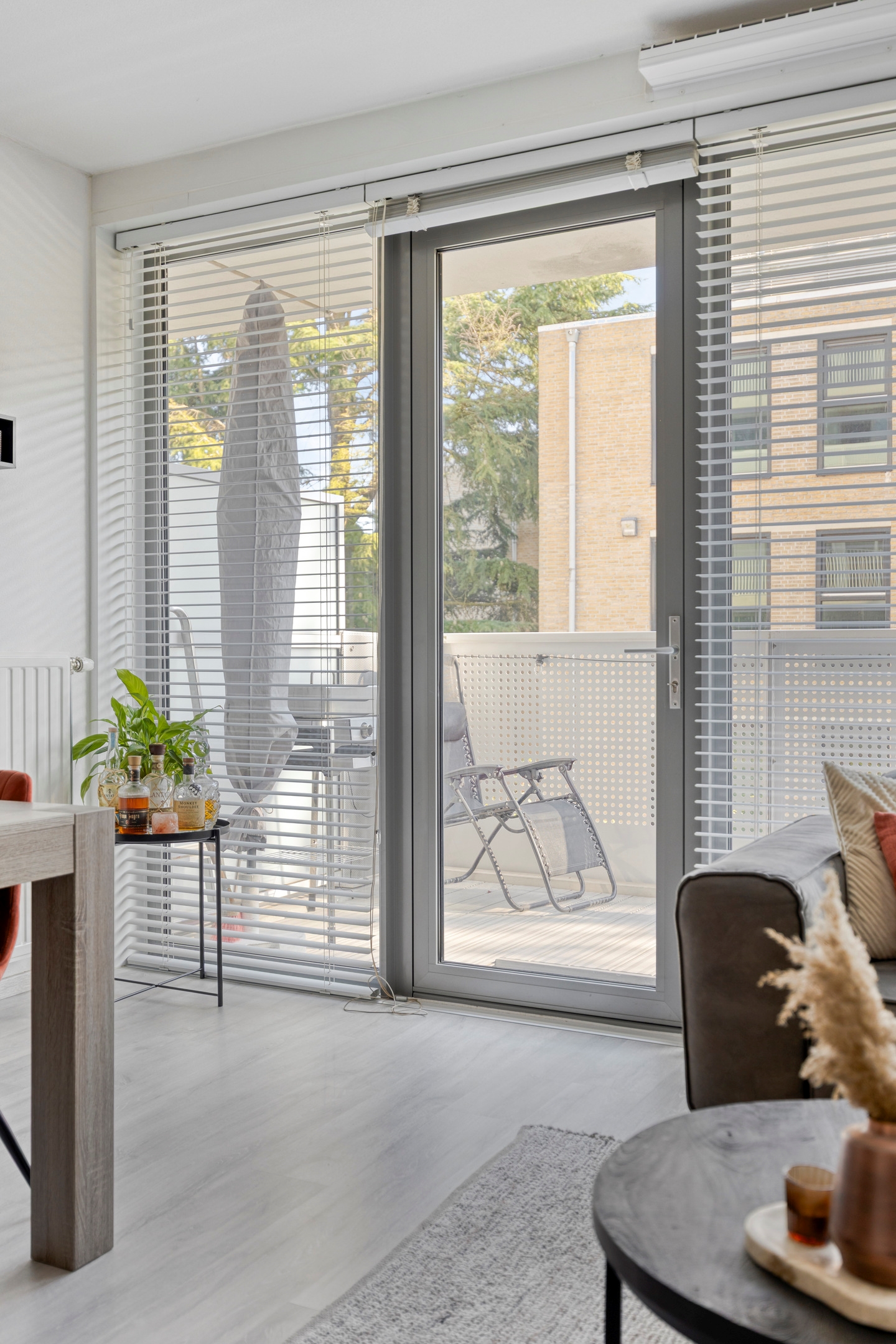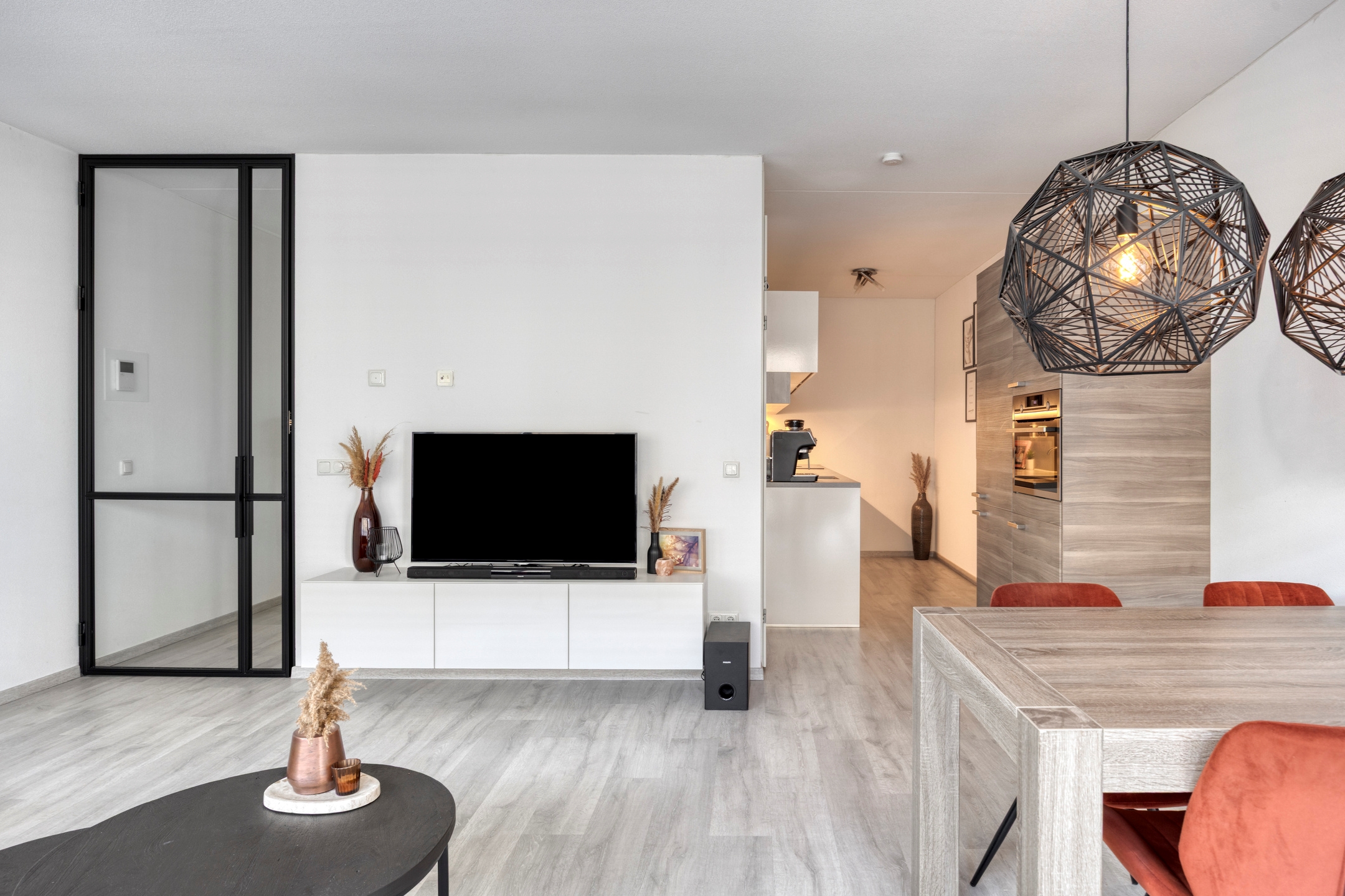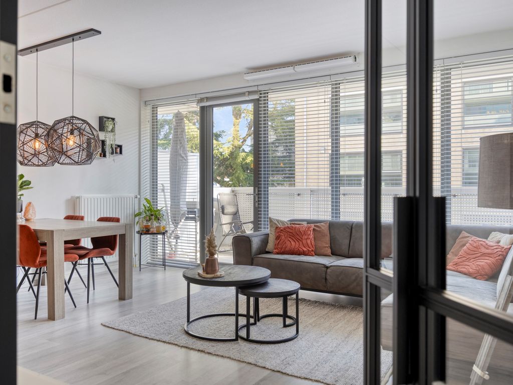 Vanuit de hal leid een moderne stalen deur je naar de lichte woonkamer. Dankzij de grote glazen pui geniet de ruimte van volop daglicht en heeft u direct toegang tot het balkon.