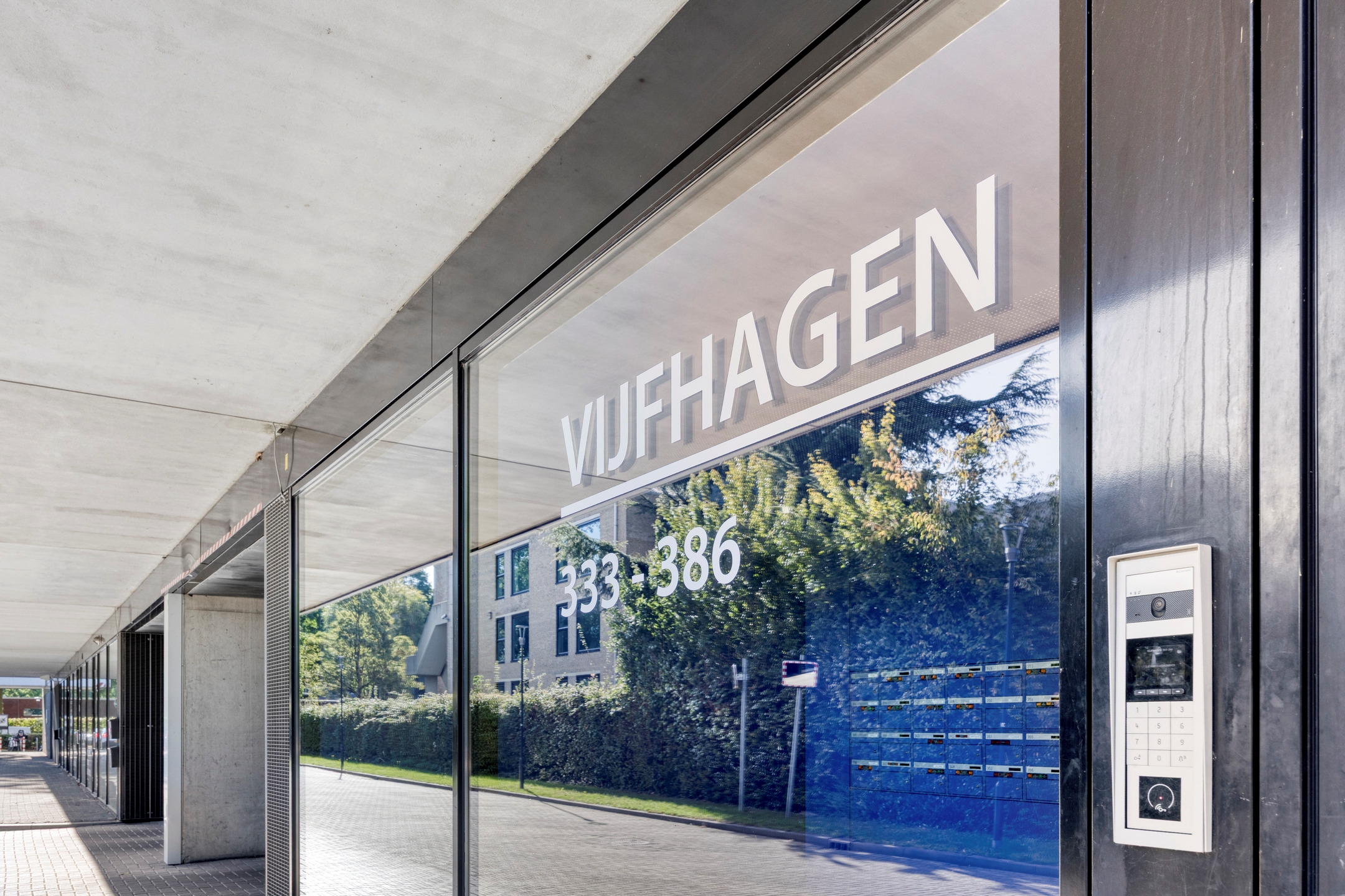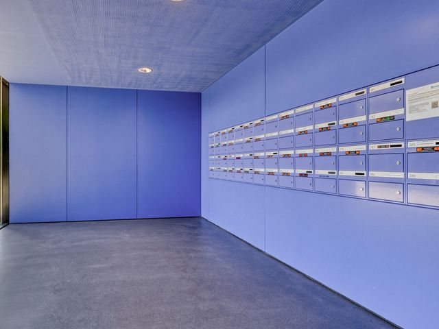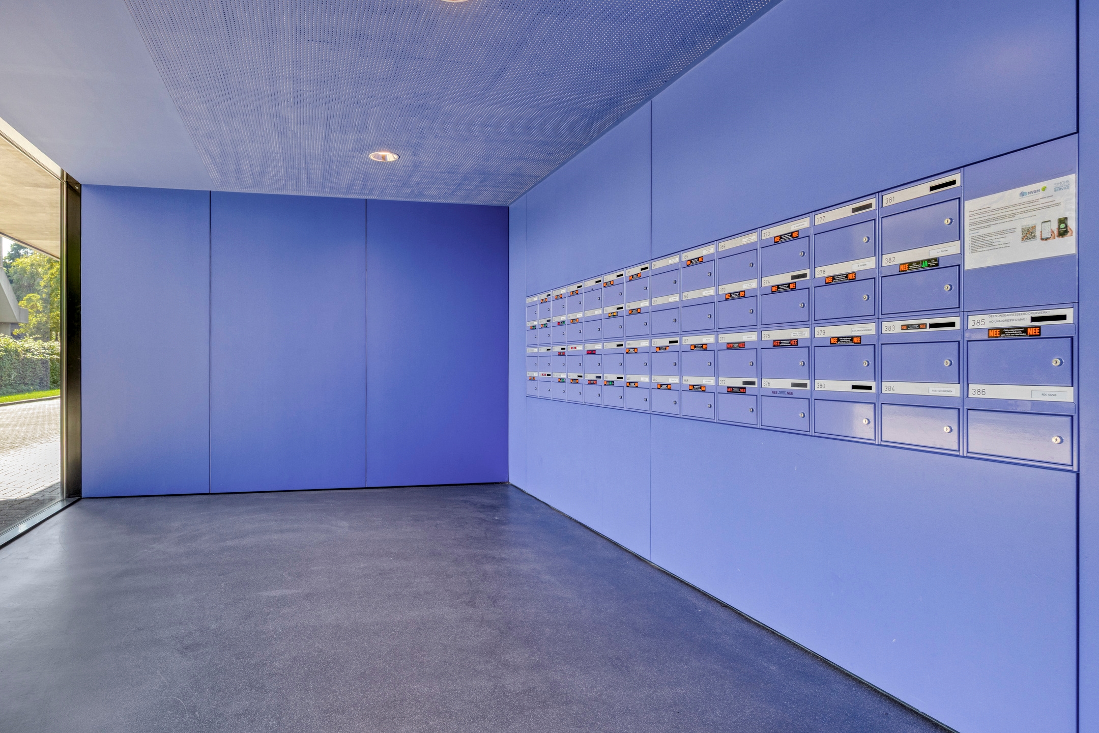 Centrale hal met een bellentableau en intercominstallatie, de brievenbussen, toegang tot de liften en het trappenhuis.