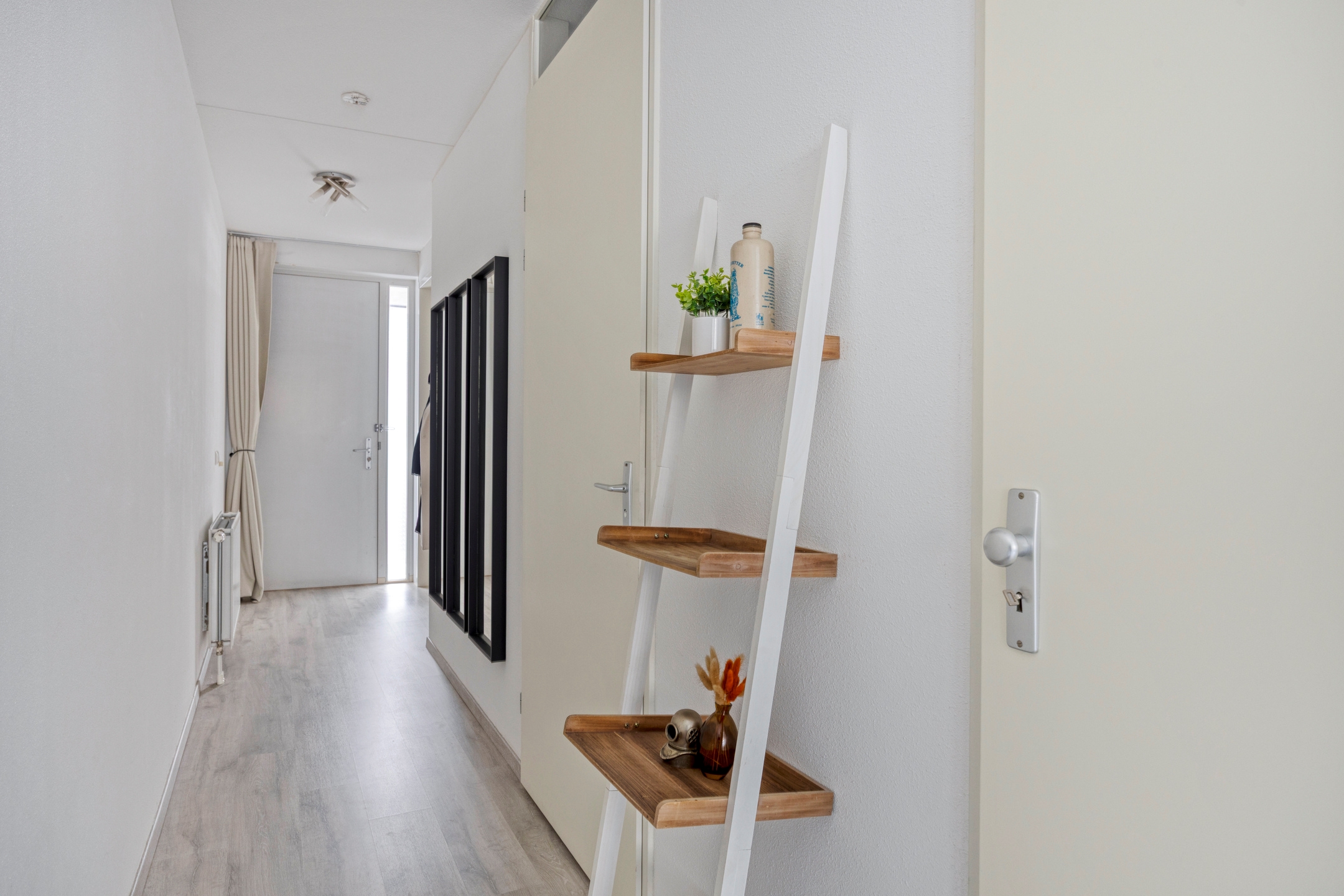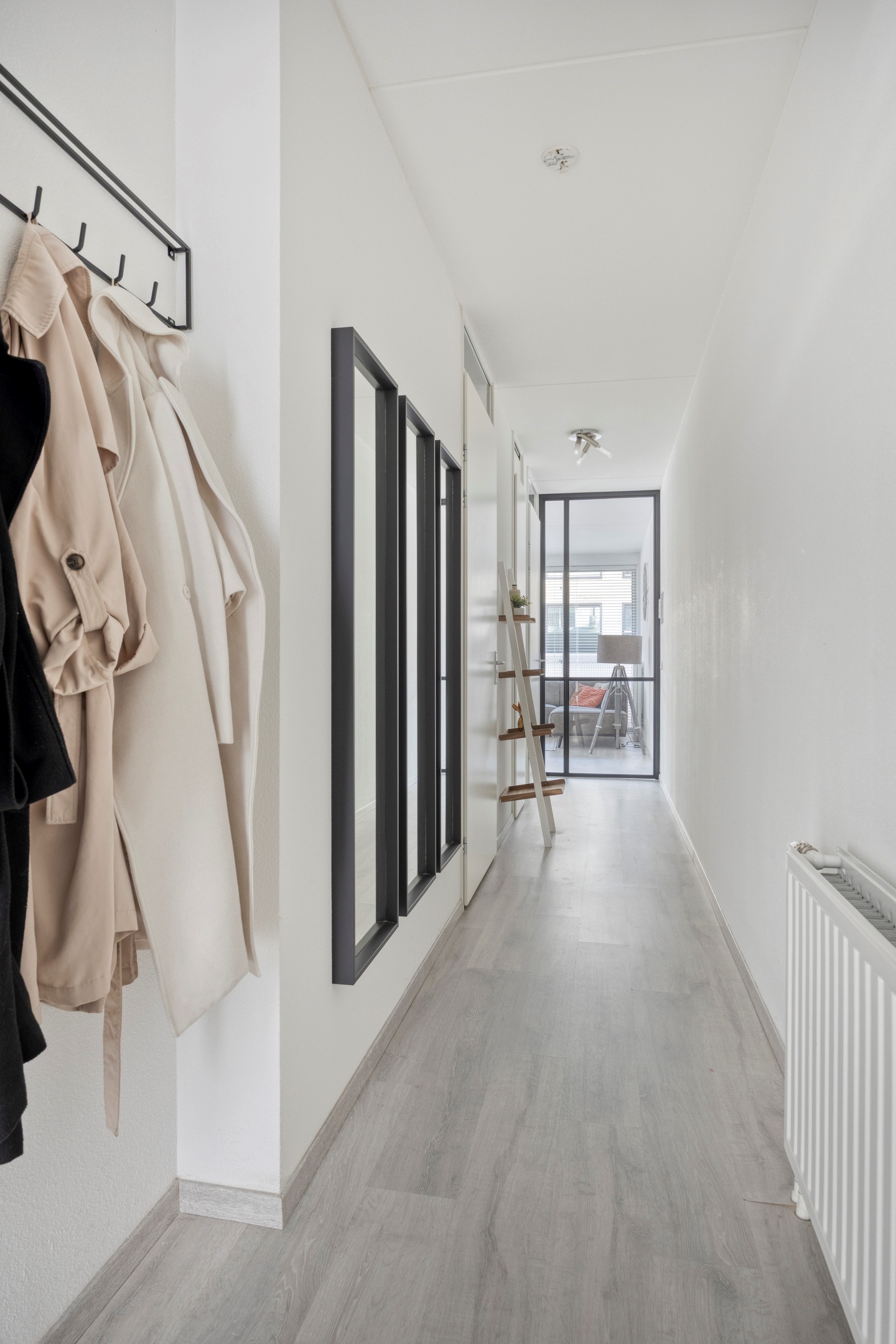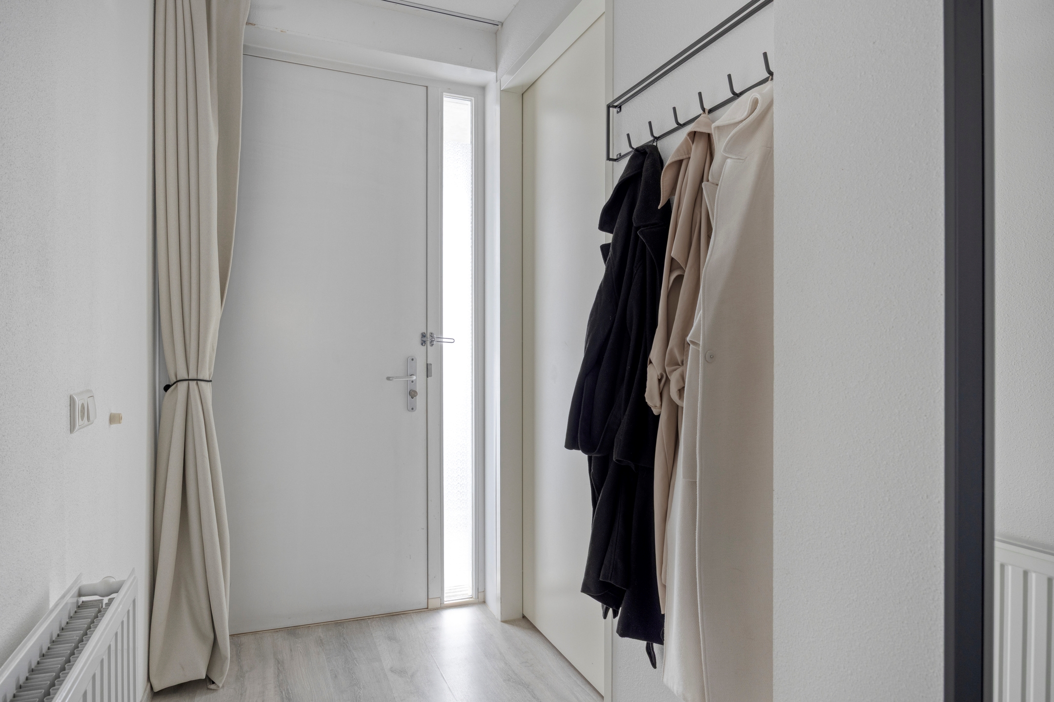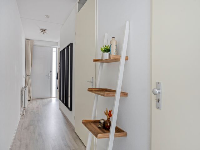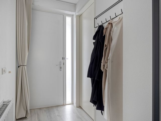 De ruime hal met intercom-videofoon, biedt toegang tot de slaapkamer, badkamer, meterkast, toilet en de woonkamer.