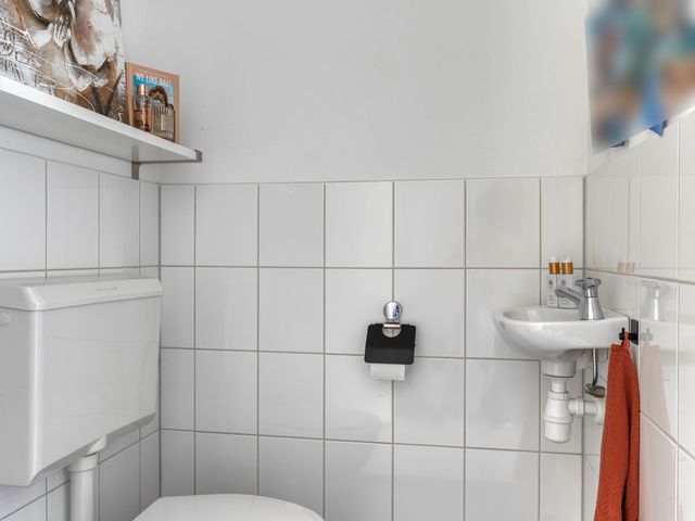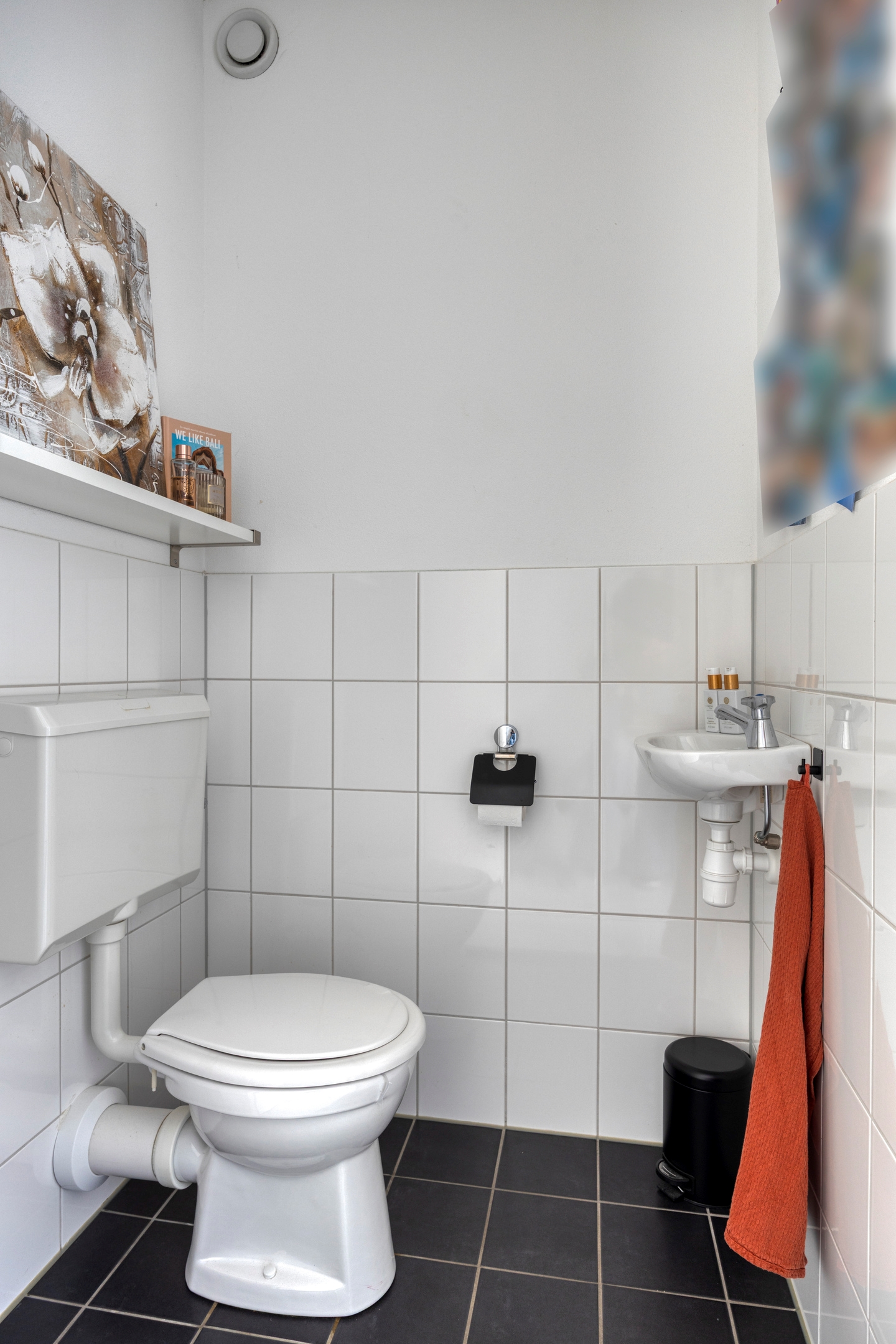De toiletruimte is voorzien van een closet en een fonteintje, de vloer is afgewerkt met donkere vloertegels en de wanden zijn deels betegeld met witte wandtegels.