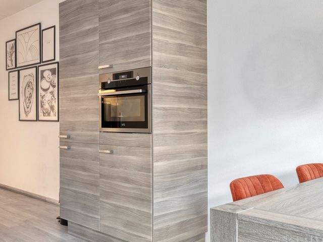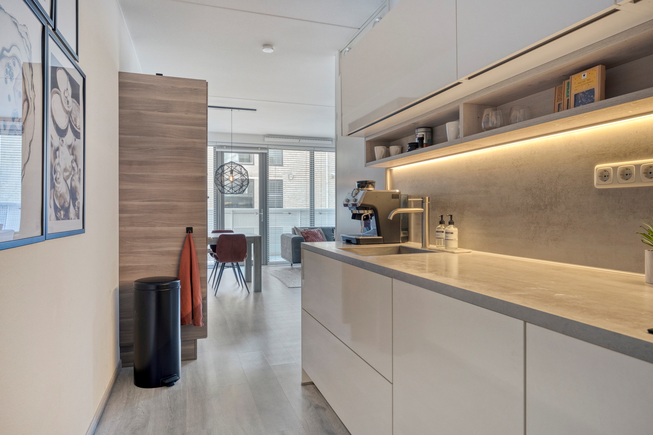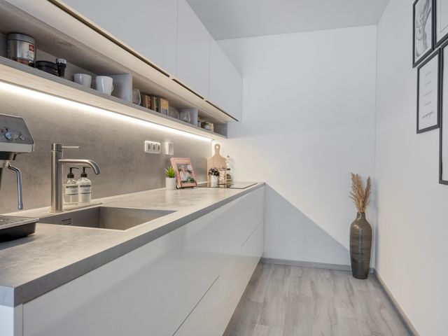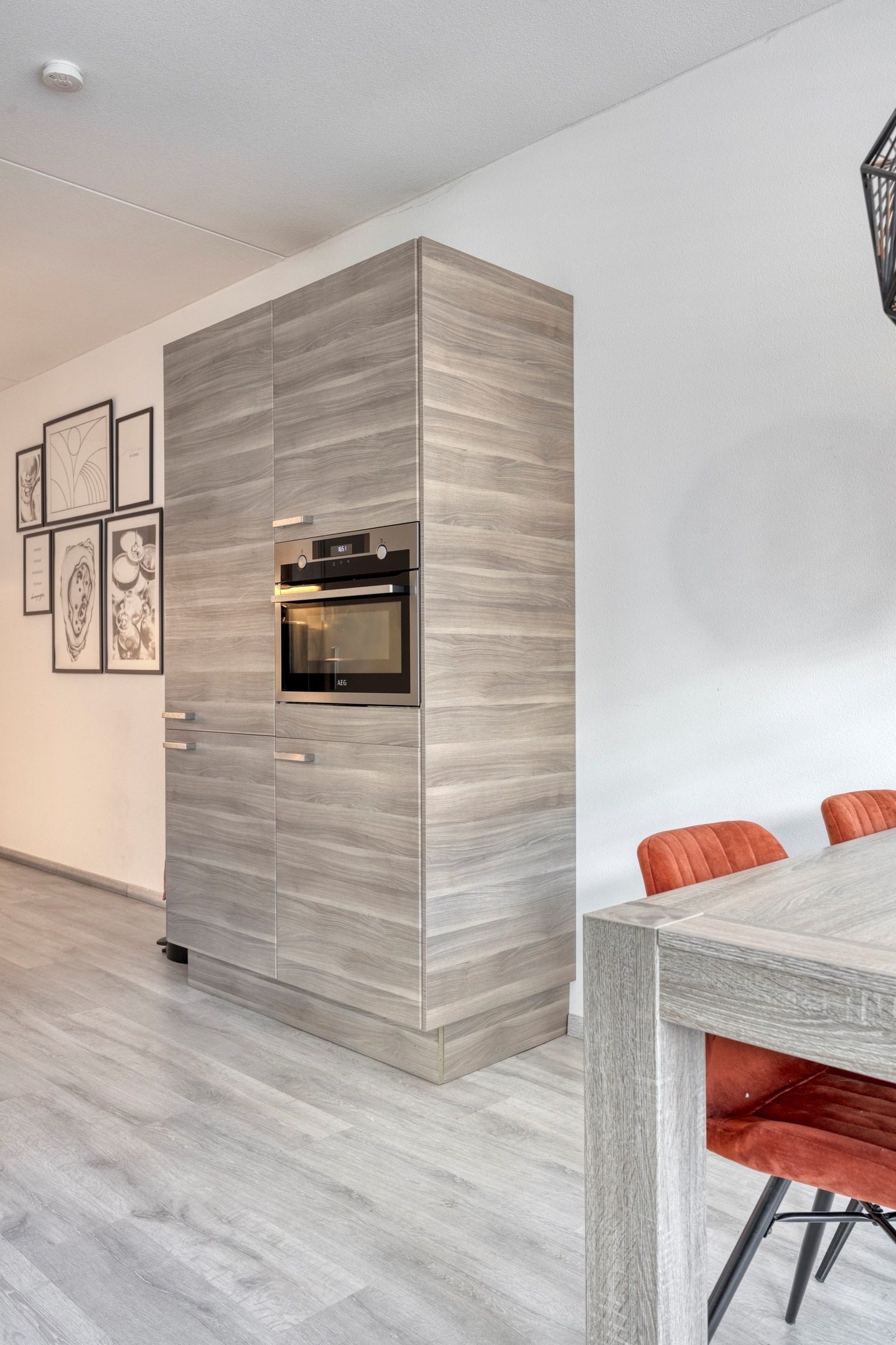 De open keuken is voorzien van onder- en bovenkasten en een vrijstaand keukenmeubel. De keuken is uitgerust met de volgende inbouwapparatuur; 4-pits Bora inductiekookplaat met geïntegreerde afzuiging, combi-oven, koelkast en vaatwasser.