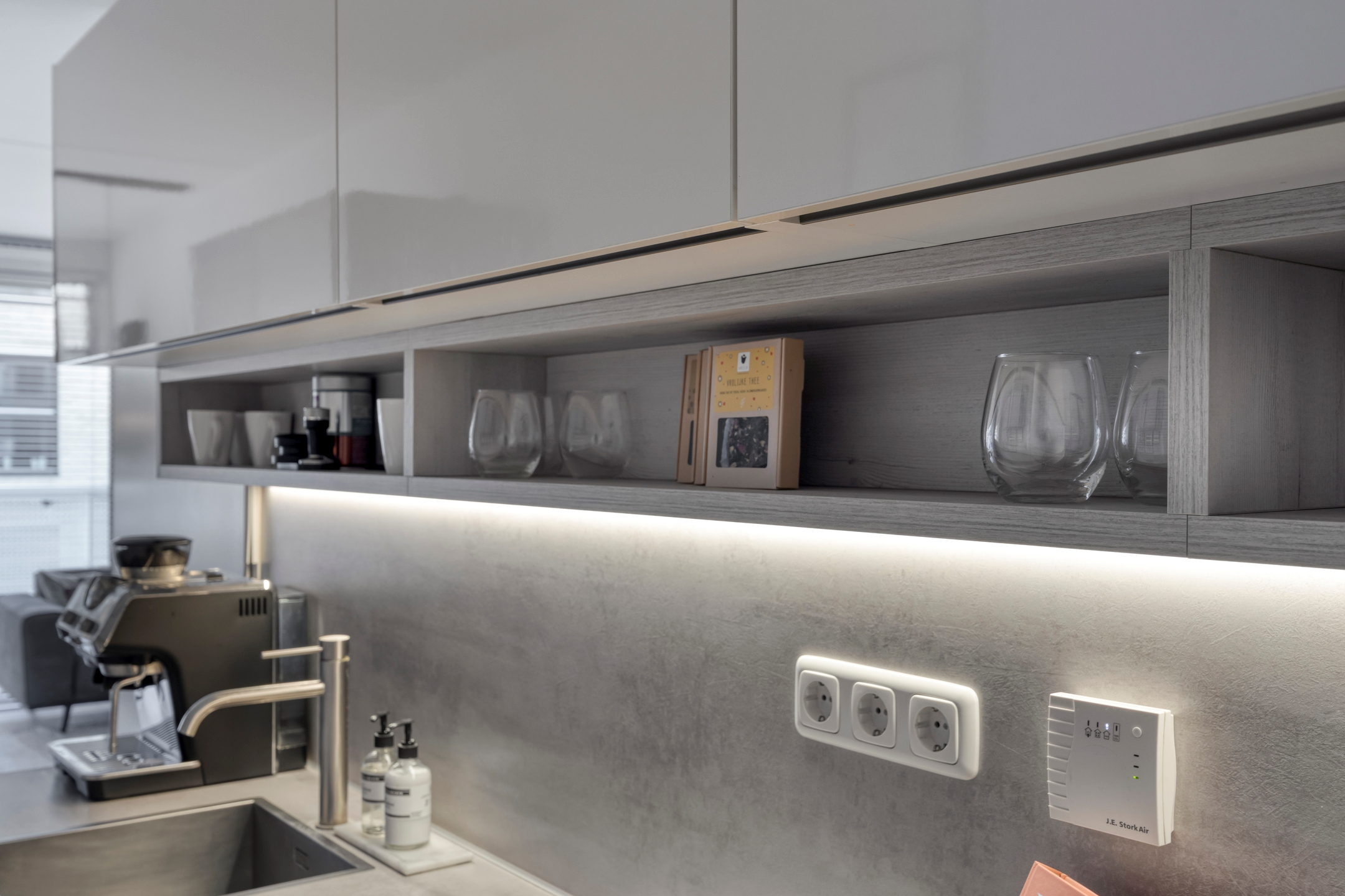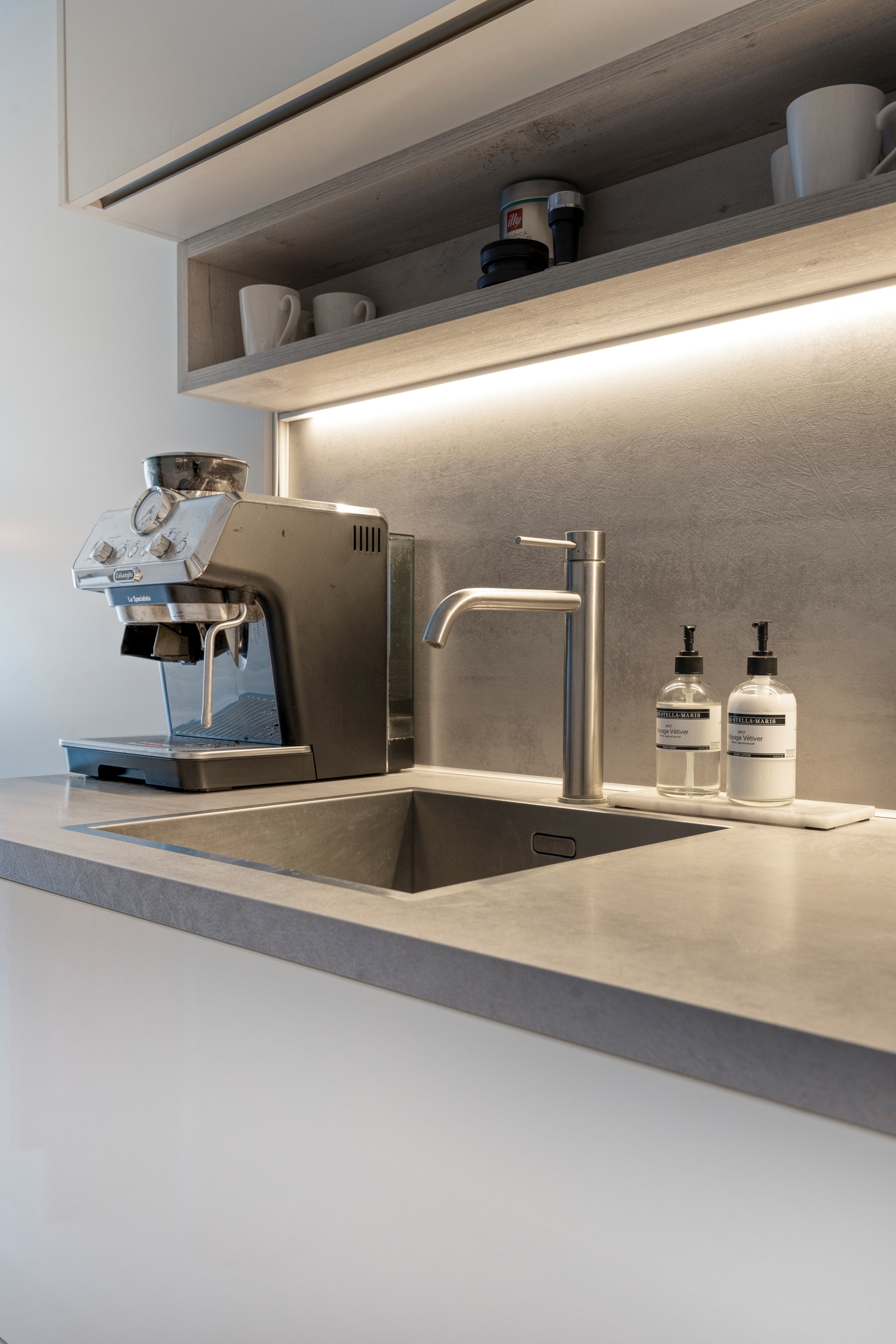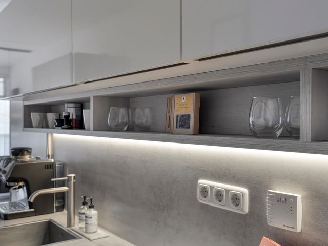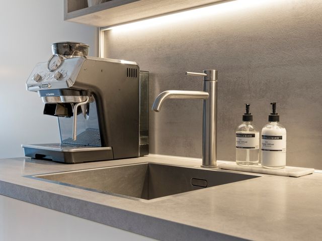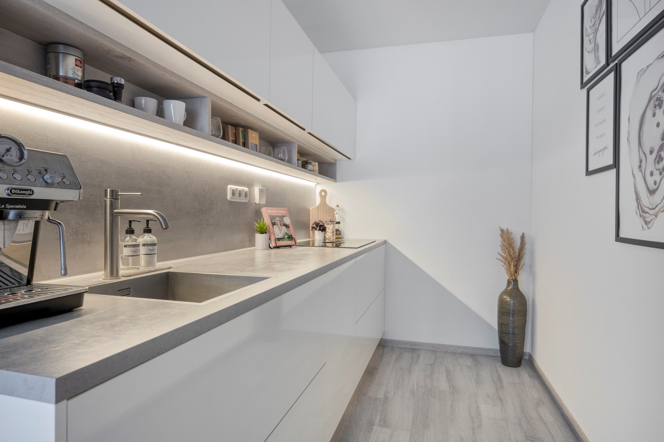 De open keuken is voorzien van onder- en bovenkasten en een vrijstaand keukenmeubel. De keuken is uitgerust met de volgende inbouwapparatuur; 4-pits Bora inductiekookplaat met geïntegreerde afzuiging, combi-oven, koelkast en vaatwasser.