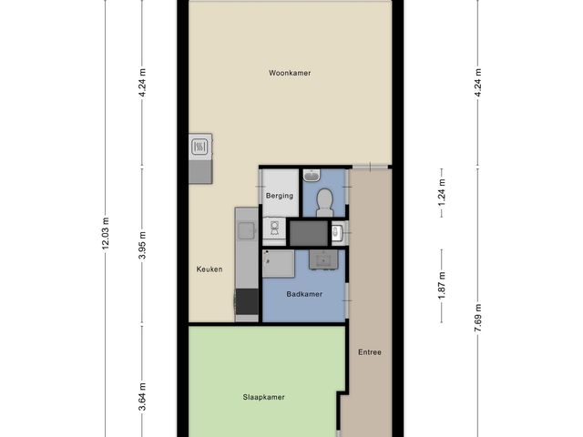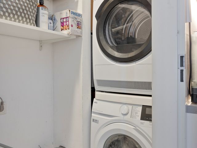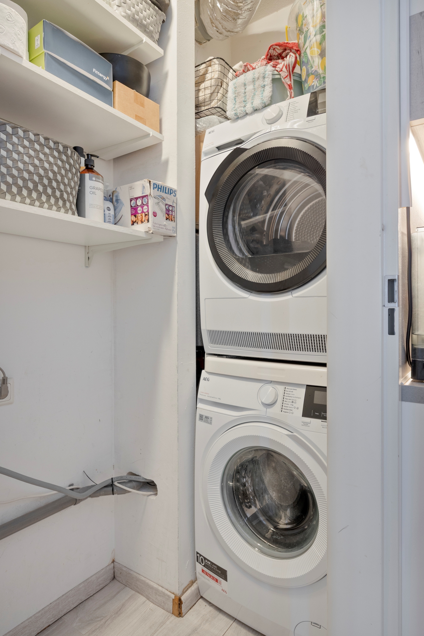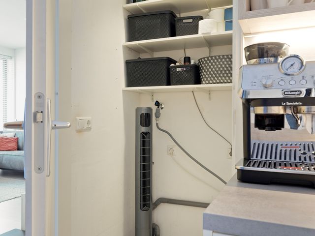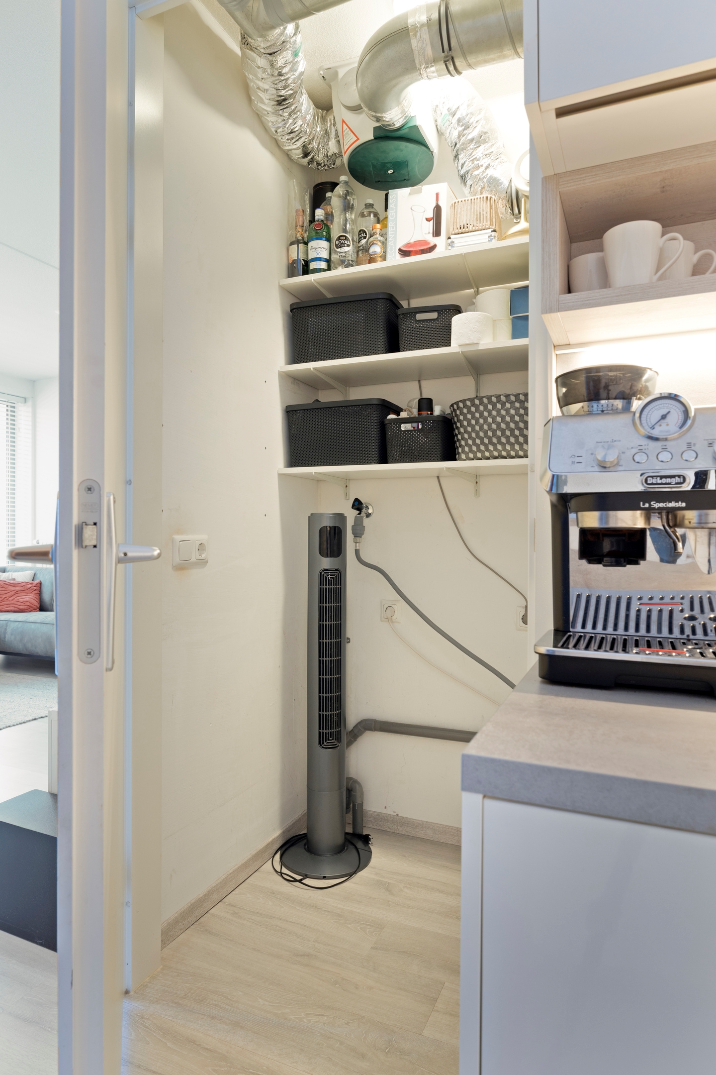 Vanuit de keuken is er toegang tot de vaste kast. In deze kast is voldoende opbergruimte en daarnaast is er een wasmachine-/drogeraansluiting aanwezig.