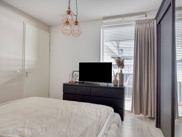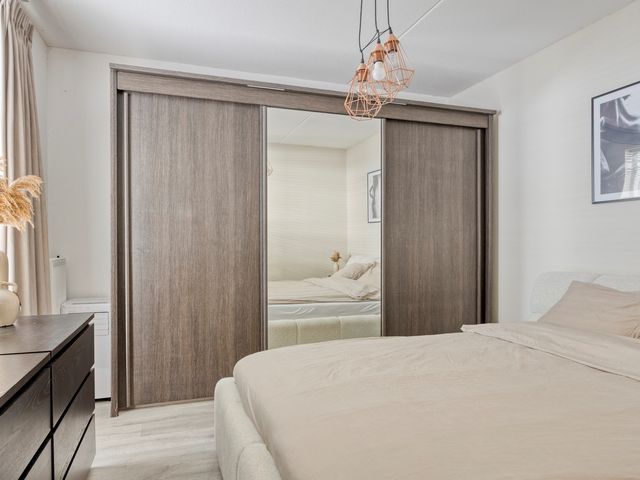 Vanuit de entree betreedt je de ruime en lichte slaapkamer. Deze slaapkamer is voorzien van een laminaatvloer en de wanden zijn voorzien van stucwerk.