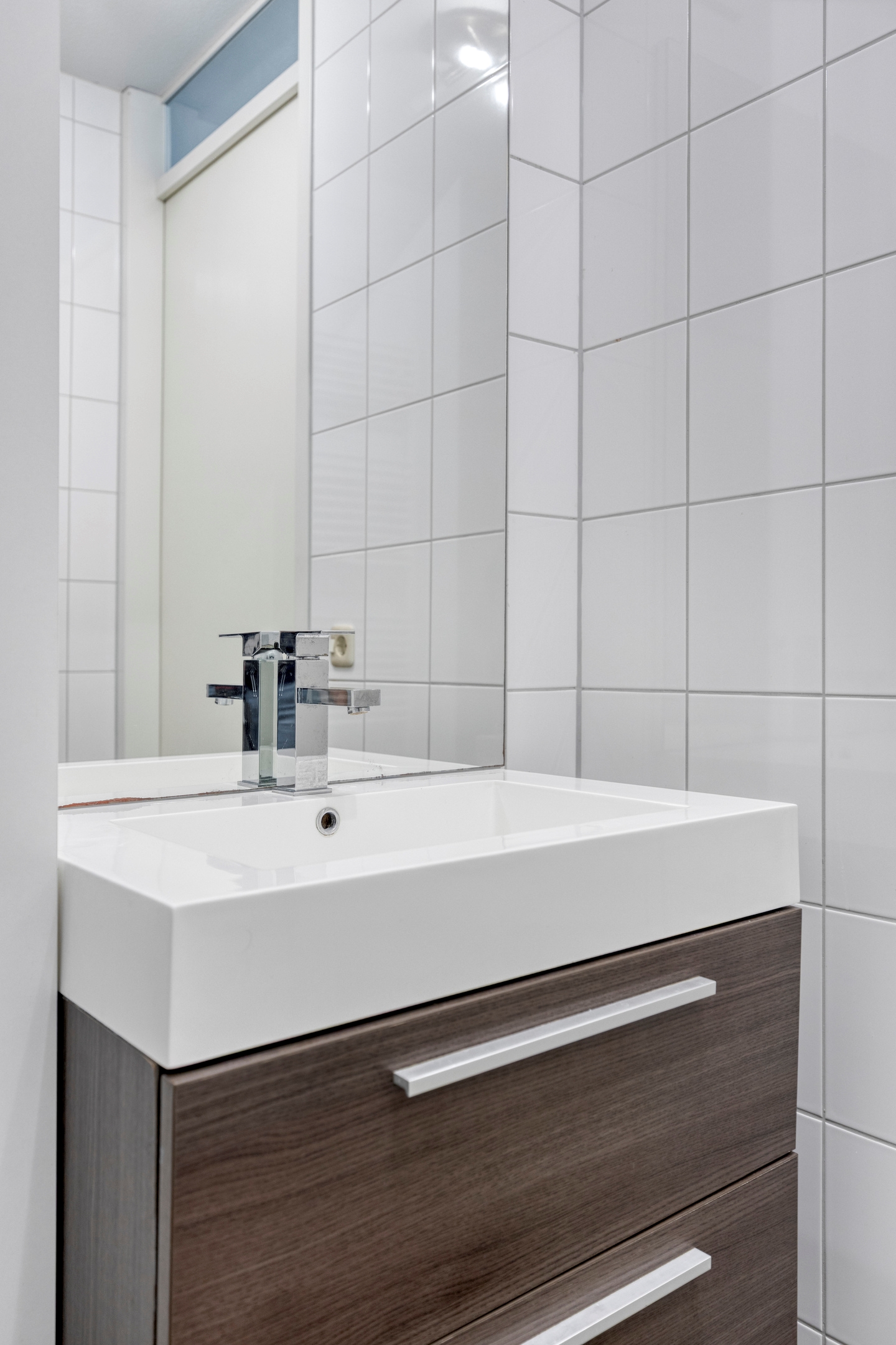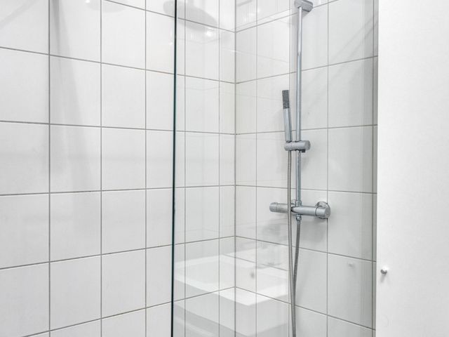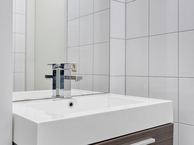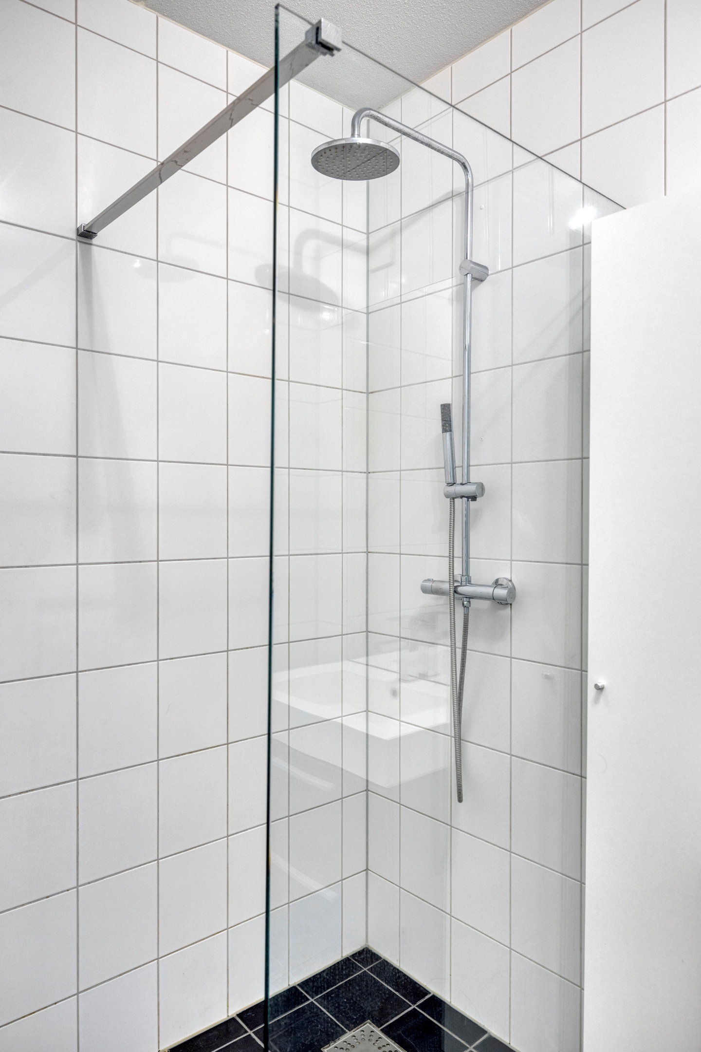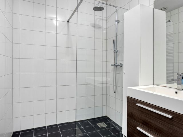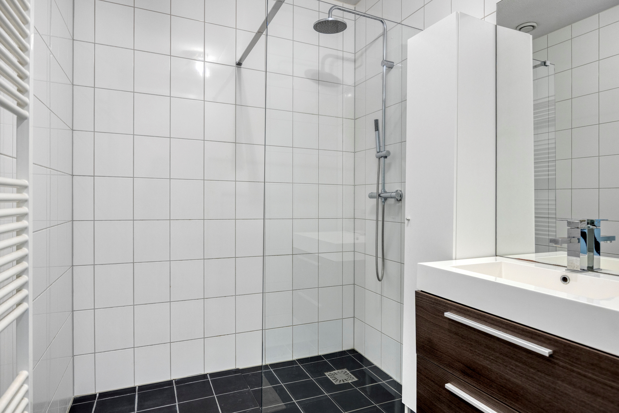 Vanuit de entree is tevens de badkamer te bereiken. Deze nette badkamer is voorzien van een ruime inloopdouche en een wastafel in een badkamermeubel. De badkamer is volledig betegeld.