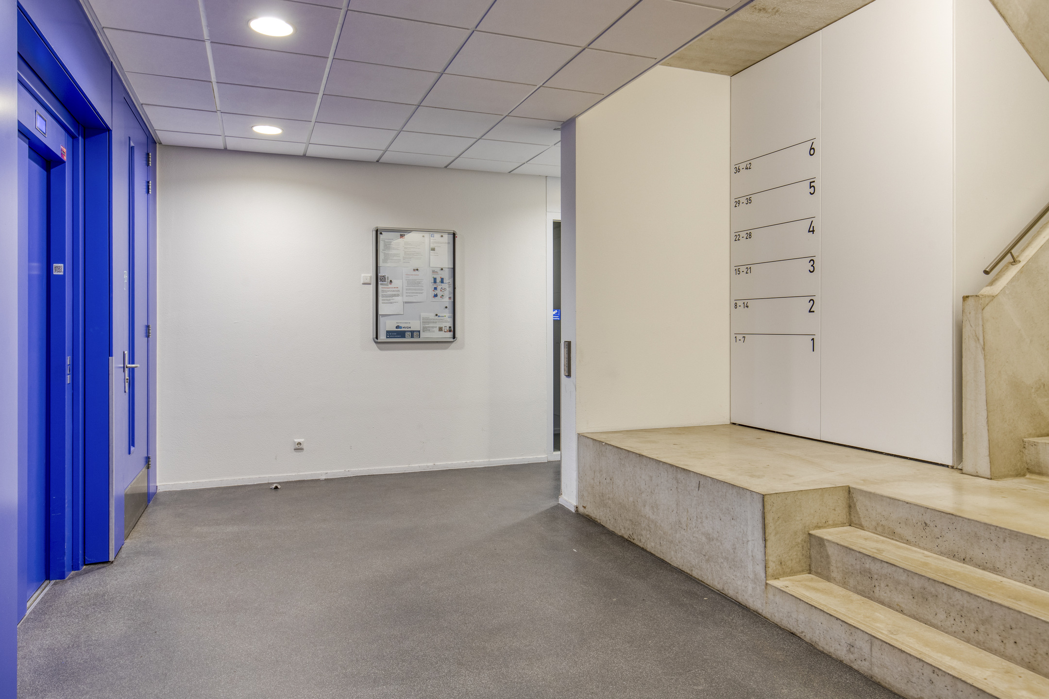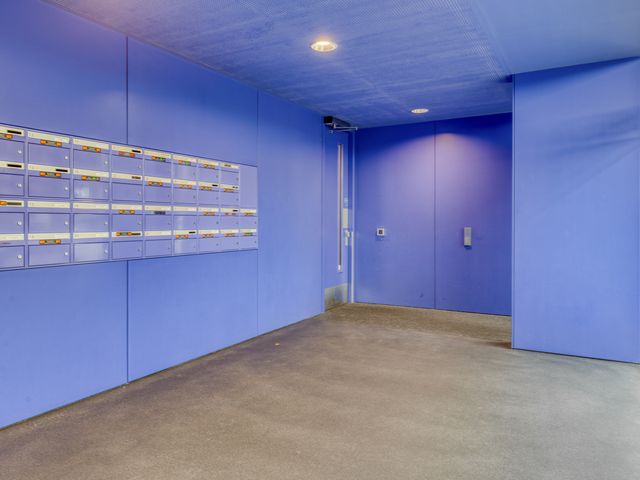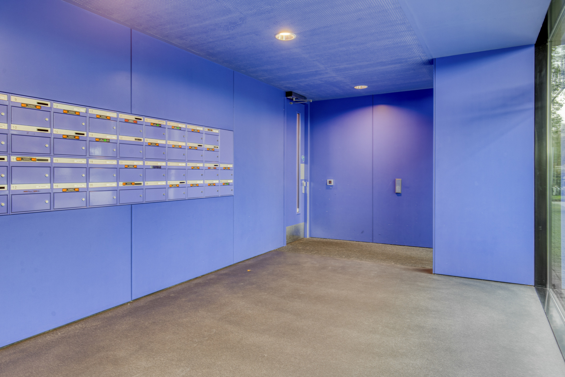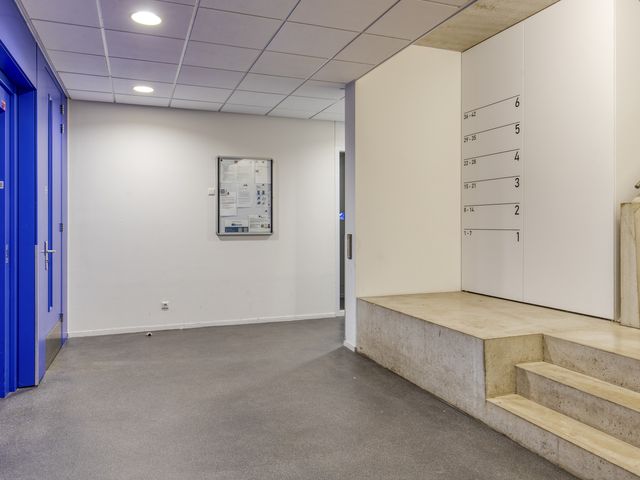 Centrale hal met een bellentableau en video intercominstallatie, de brievenbussen, toegang tot de liften en het trappenhuis.