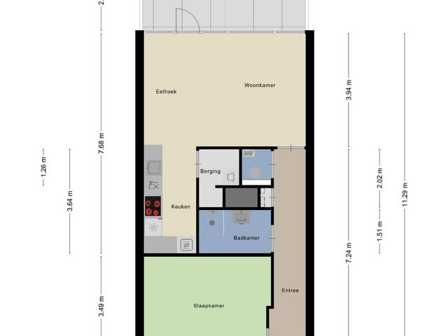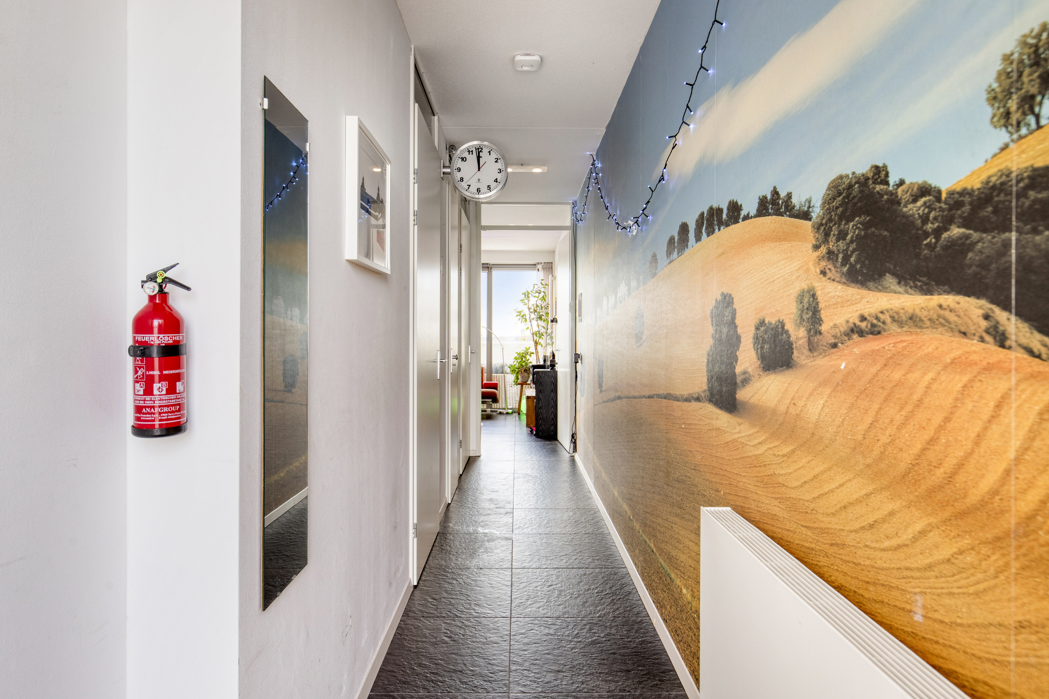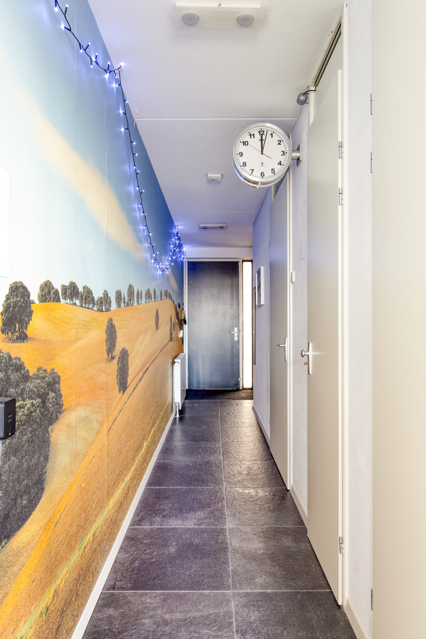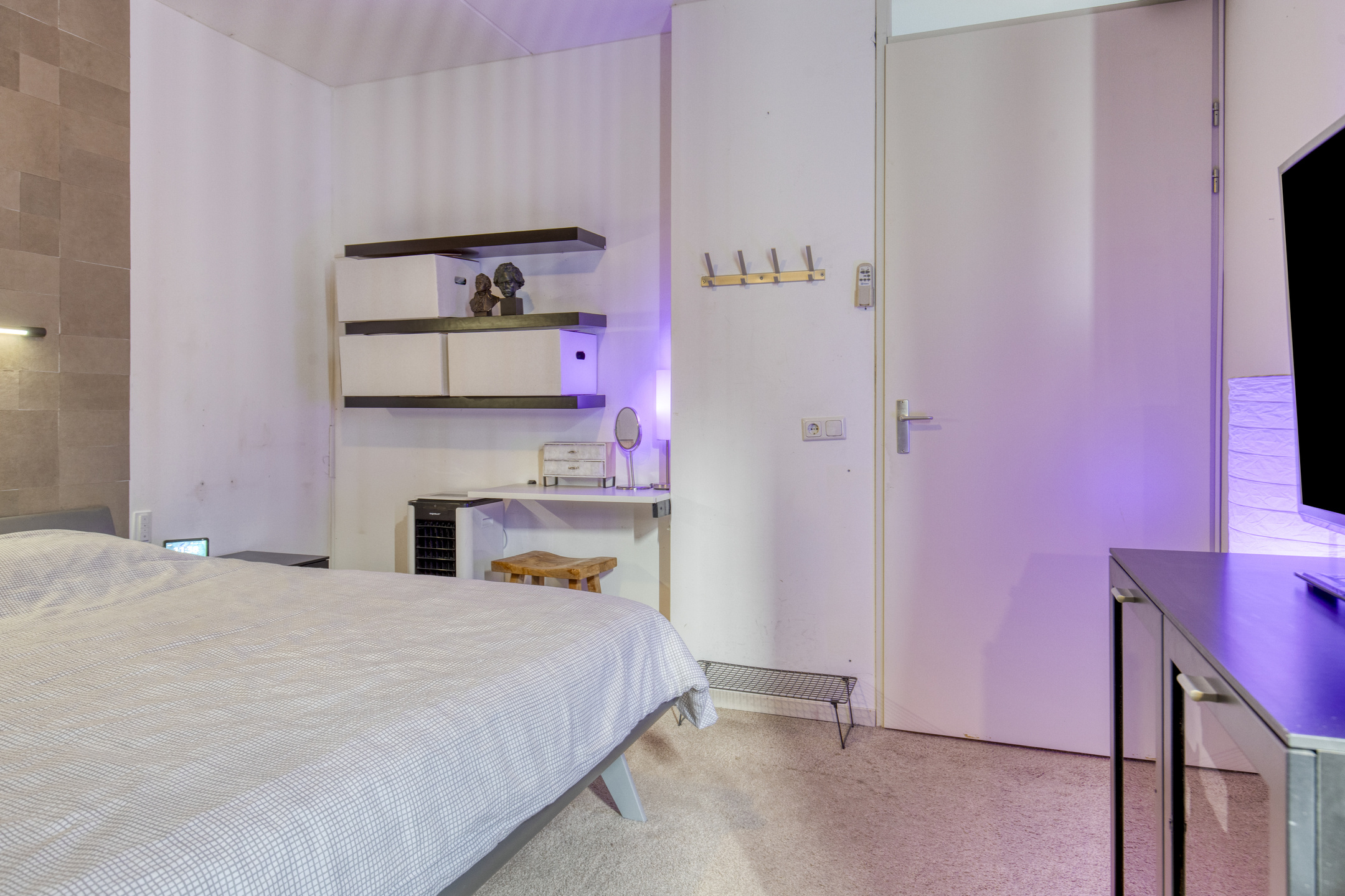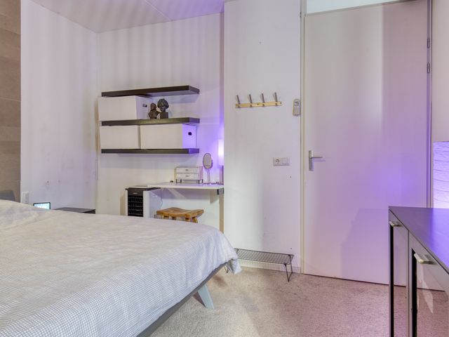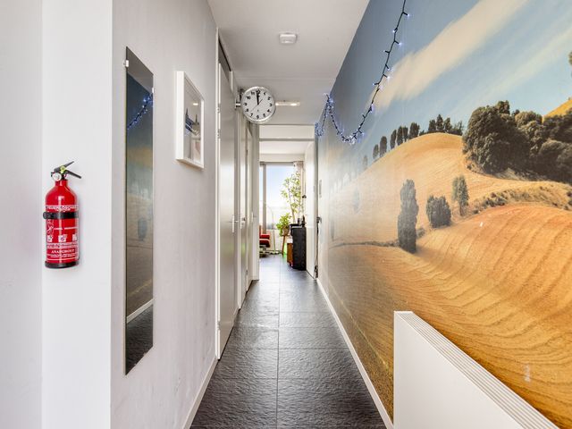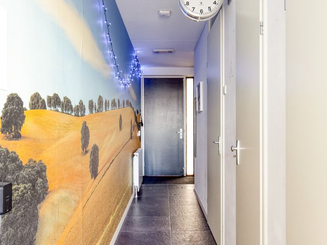 Bij binnenkomst kom je in de hal, die fungeert als centraal vertrek en toegang biedt tot de slaapkamer, badkamer, meterkast, het toilet en de woonkamer. De wand is deels voorzien van behang en de tegelvloer zorgen direct voor een strakke uitstraling.