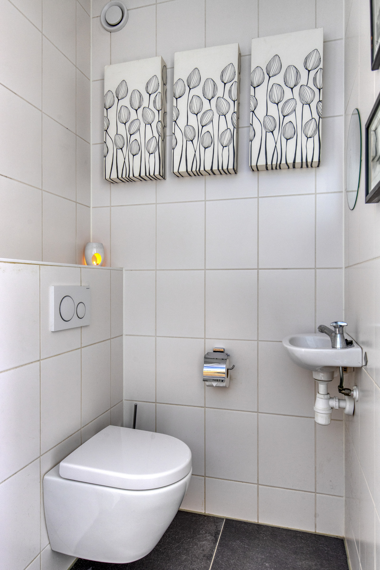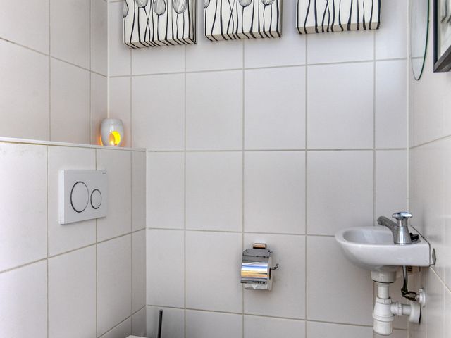 Het toilet is geheel betegeld en voorzien van een wandcloset en fonteintje.