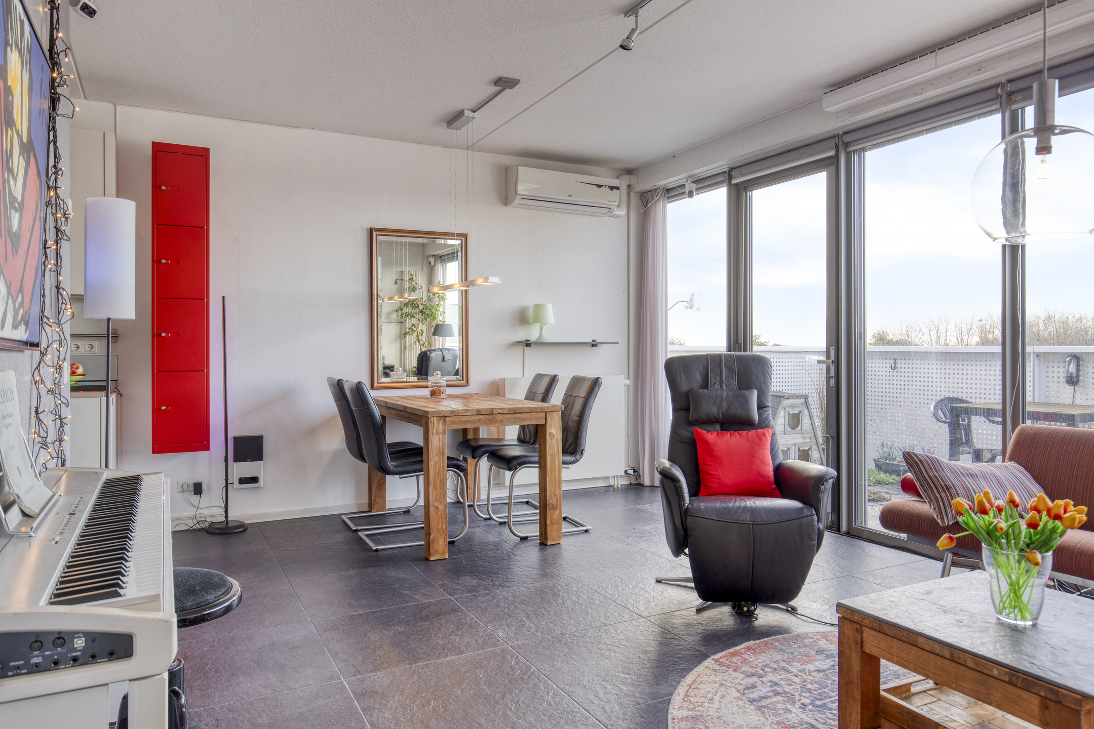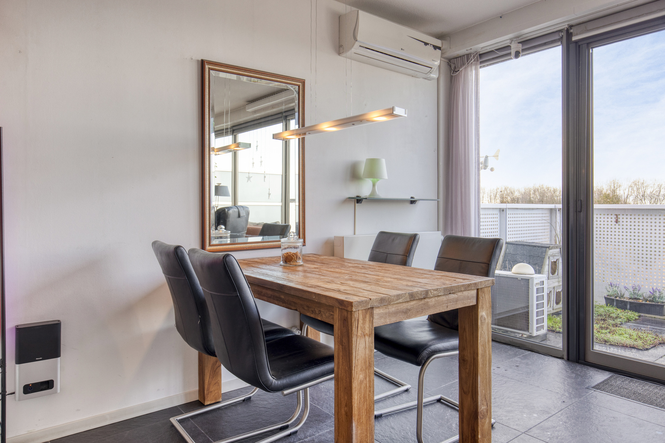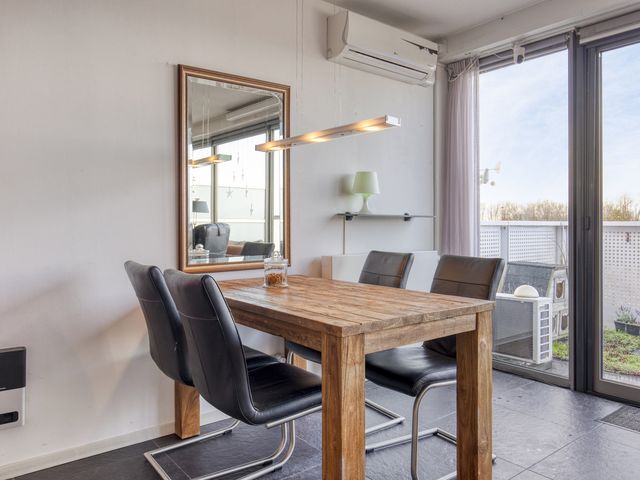 Zodra je de woonkamer binnenkomt, trekken de royale ramen (met elektrische buitenscreens) meteen de aandacht. Ze laten veel daglicht binnen en creëren een aangename sfeer. Via de loopdeur stap je zo het ruime balkon op. De woonkamer is voorzien van airco dat zowel verwarmt als koelt, afgewerkt met een tegelvloer en ook hier zijn de wanden behangen.