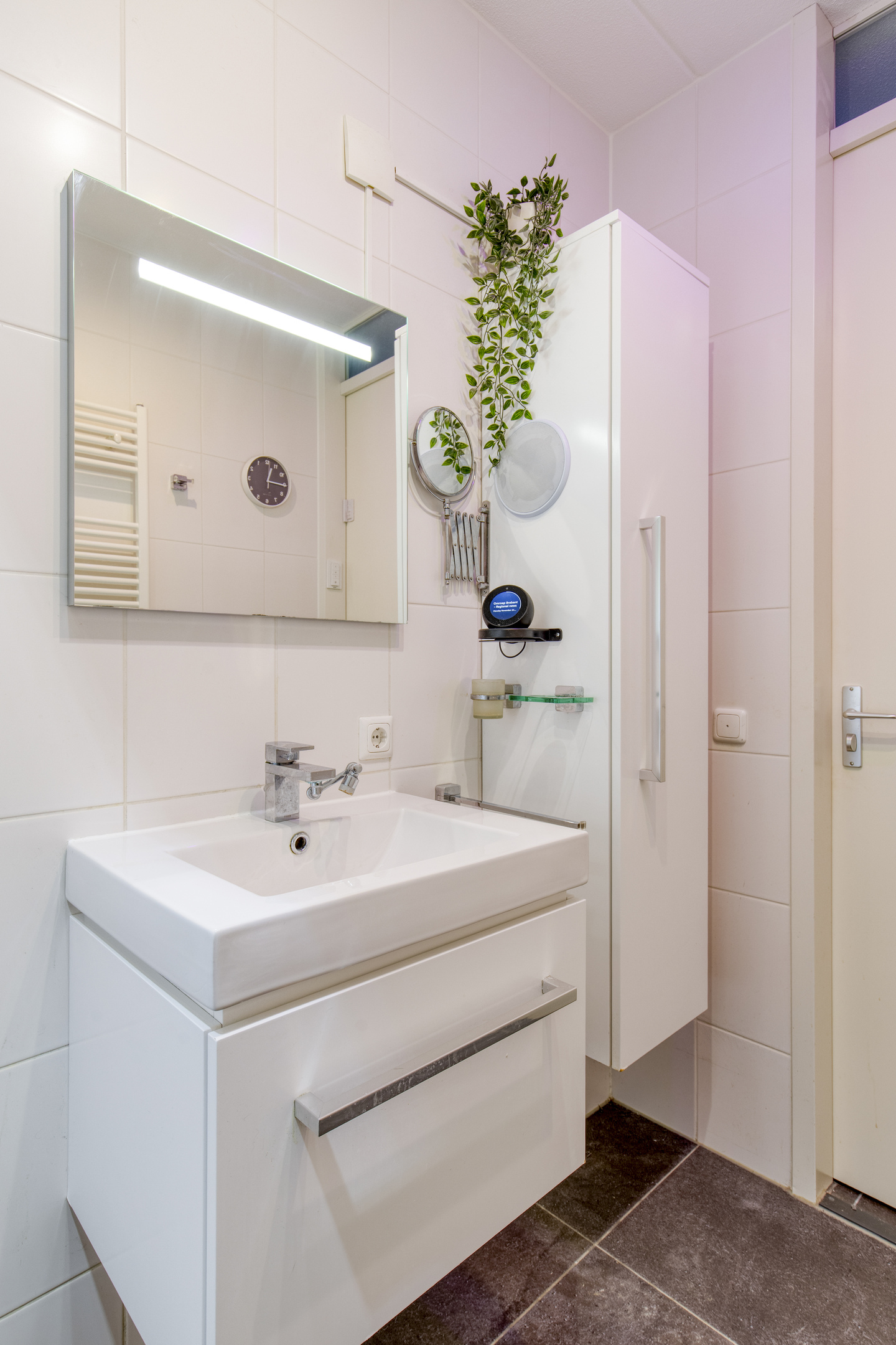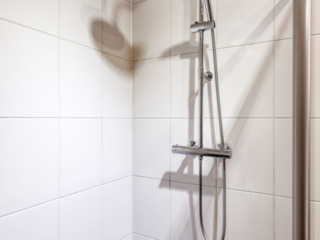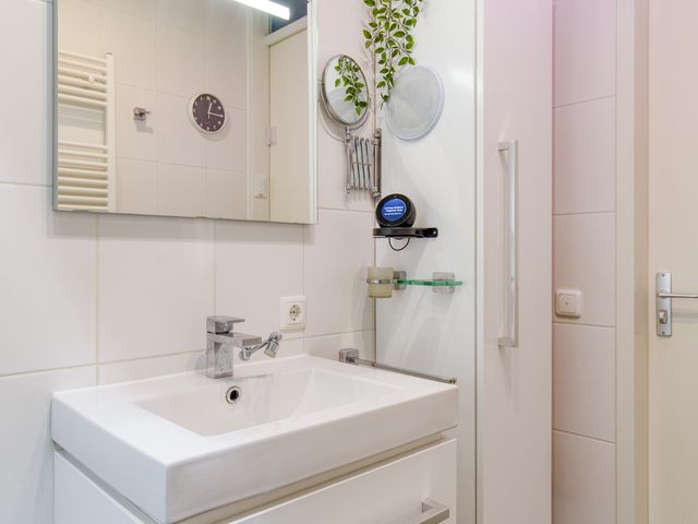De badkamer is geheel betegeld en voorzien van een inloopdouche en een wastafel met badkamermeubel.
