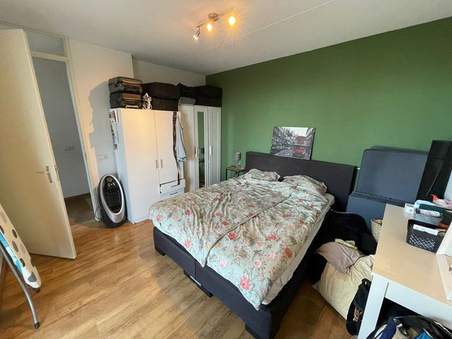 De ruime slaapkamer is voorzien van een laminaatvloer en de wanden zijn gestuct.