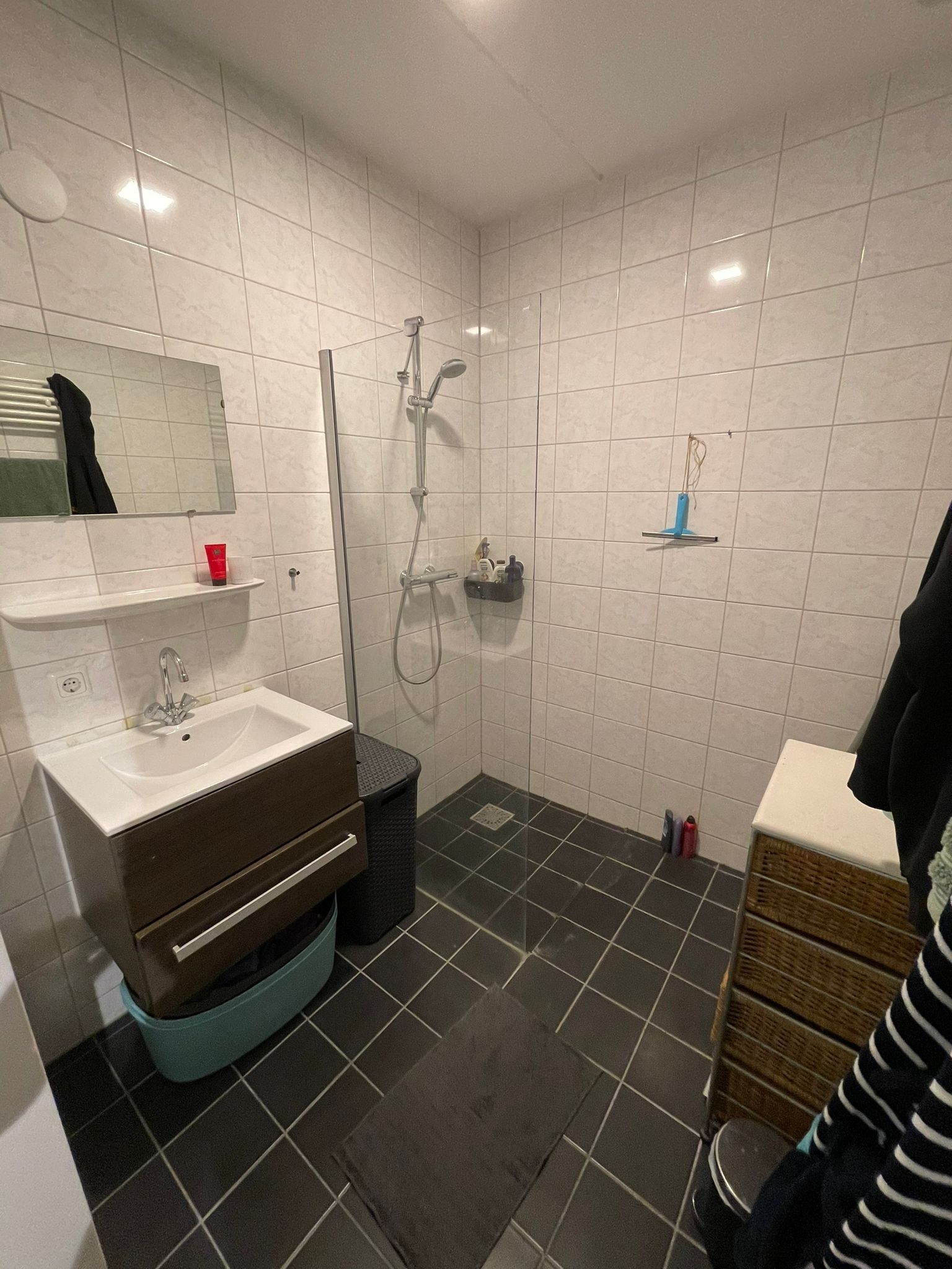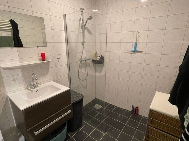 De badkamer is geheel betegeld en is voorzien van een inloopdouche en een wastafel in wastafelmeubel.