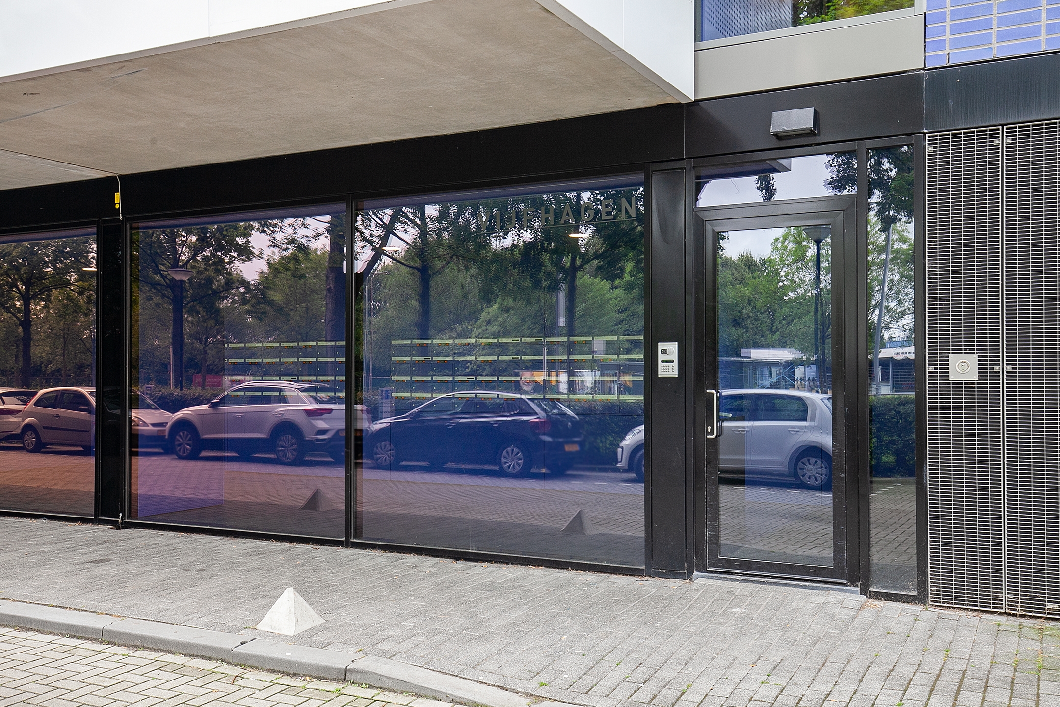 Centrale hal met een bellentableau en intercominstallatie, de brievenbussen, toegang tot de liften en het trappenhuis.
