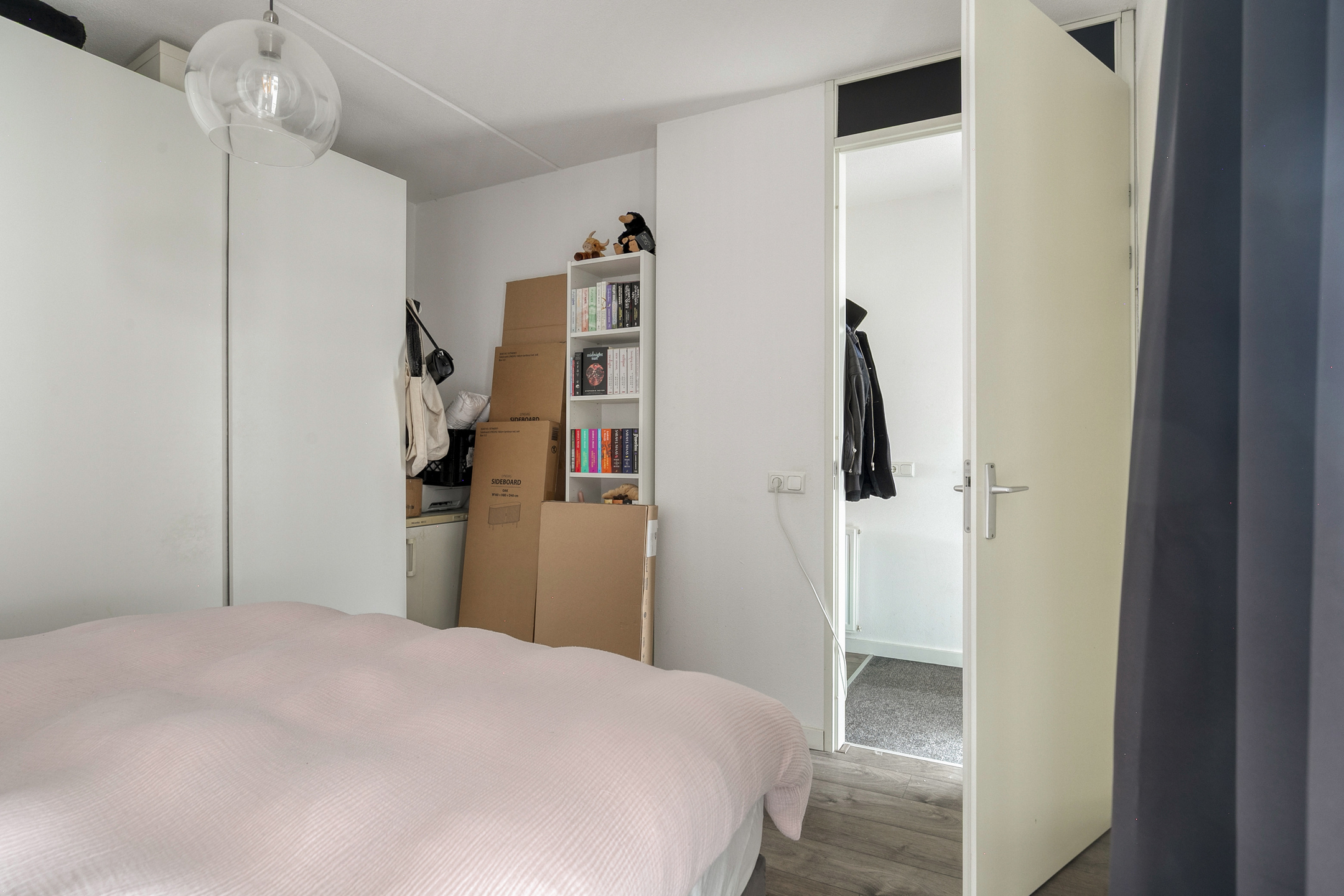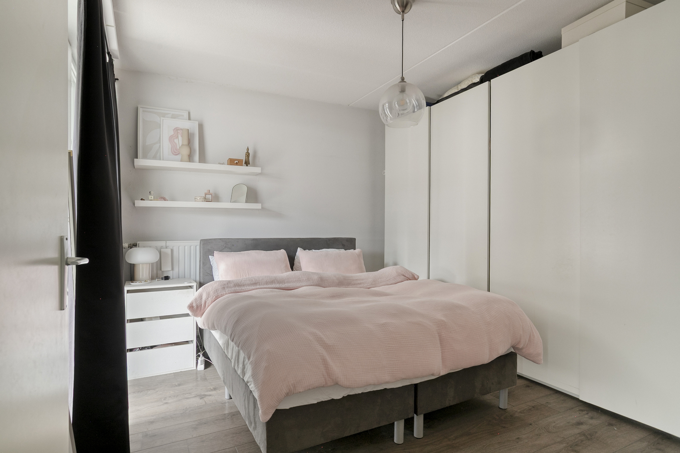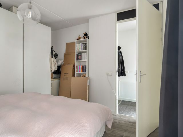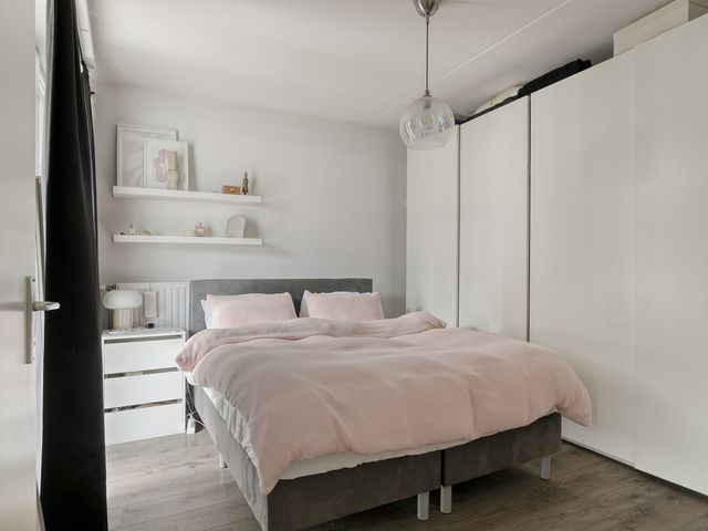 De ruime slaapkamer is gelegen aan de voorzijde van het appartement en is voorzien van een laminaatvloer en de muren zijn gestukt.