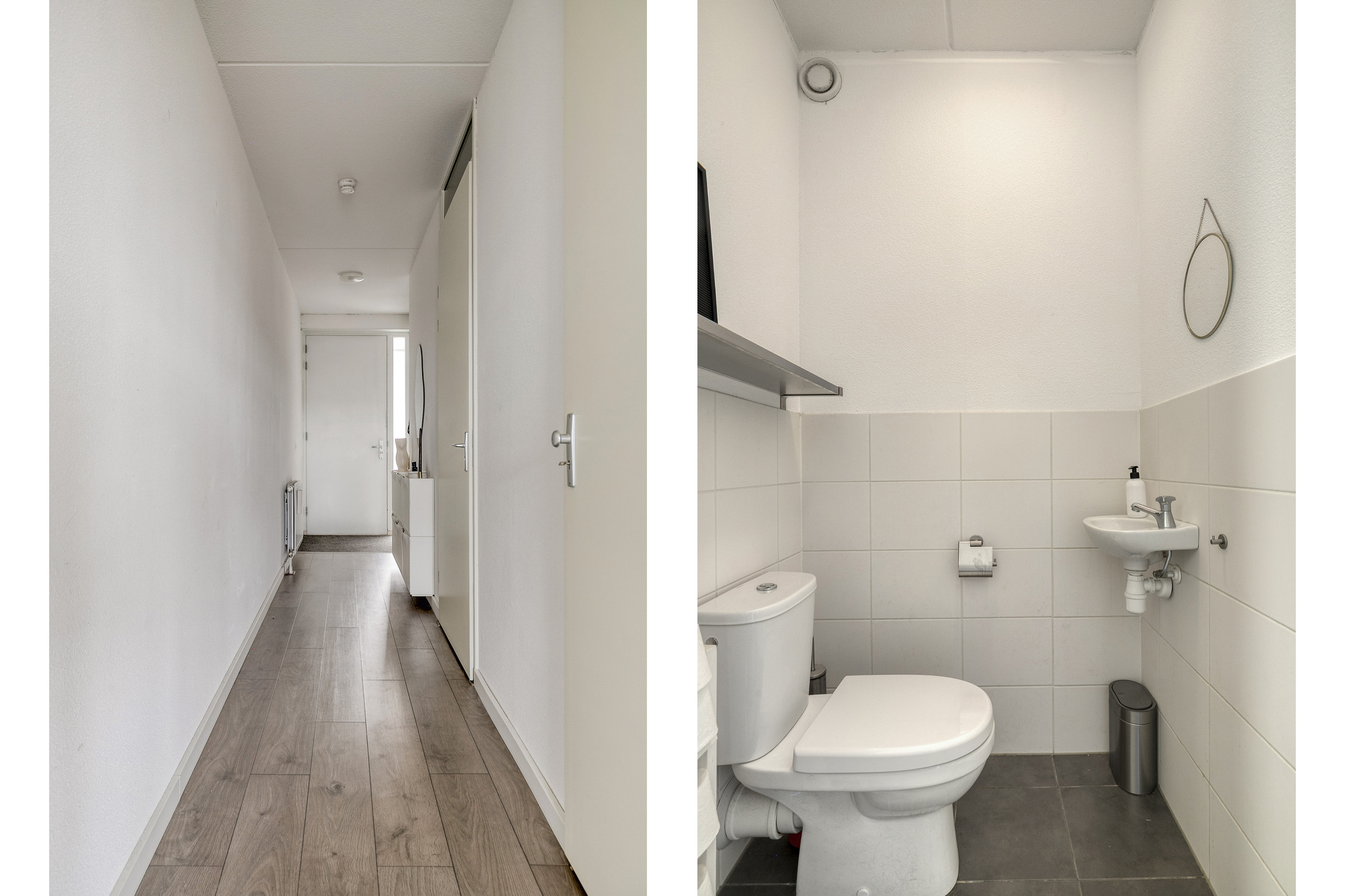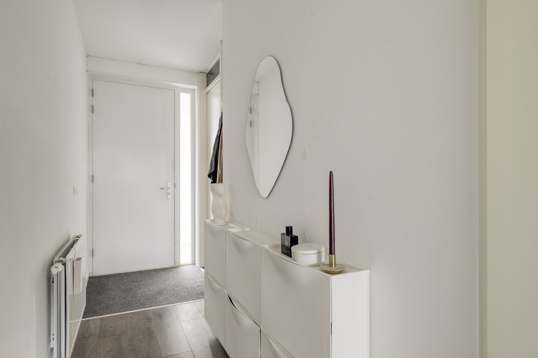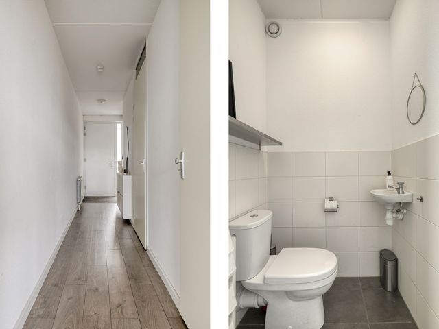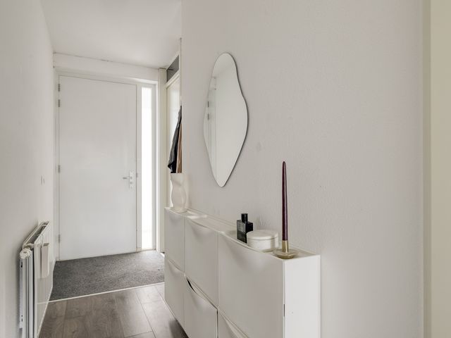 De ruime hal met intercom-videofoon, biedt toegang tot de slaapkamer, badkamer, meterkast, toilet en de woonkamer. De wanden zijn voorzien van stucwerk en de vloer is afgewerkt met laminaat.