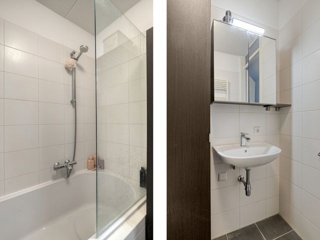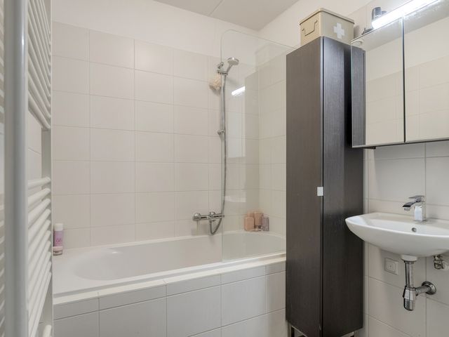 De ruime, nette badkamer is geheel betegeld en is voorzien van een ligbad met douchegedeelte en een wastafel.