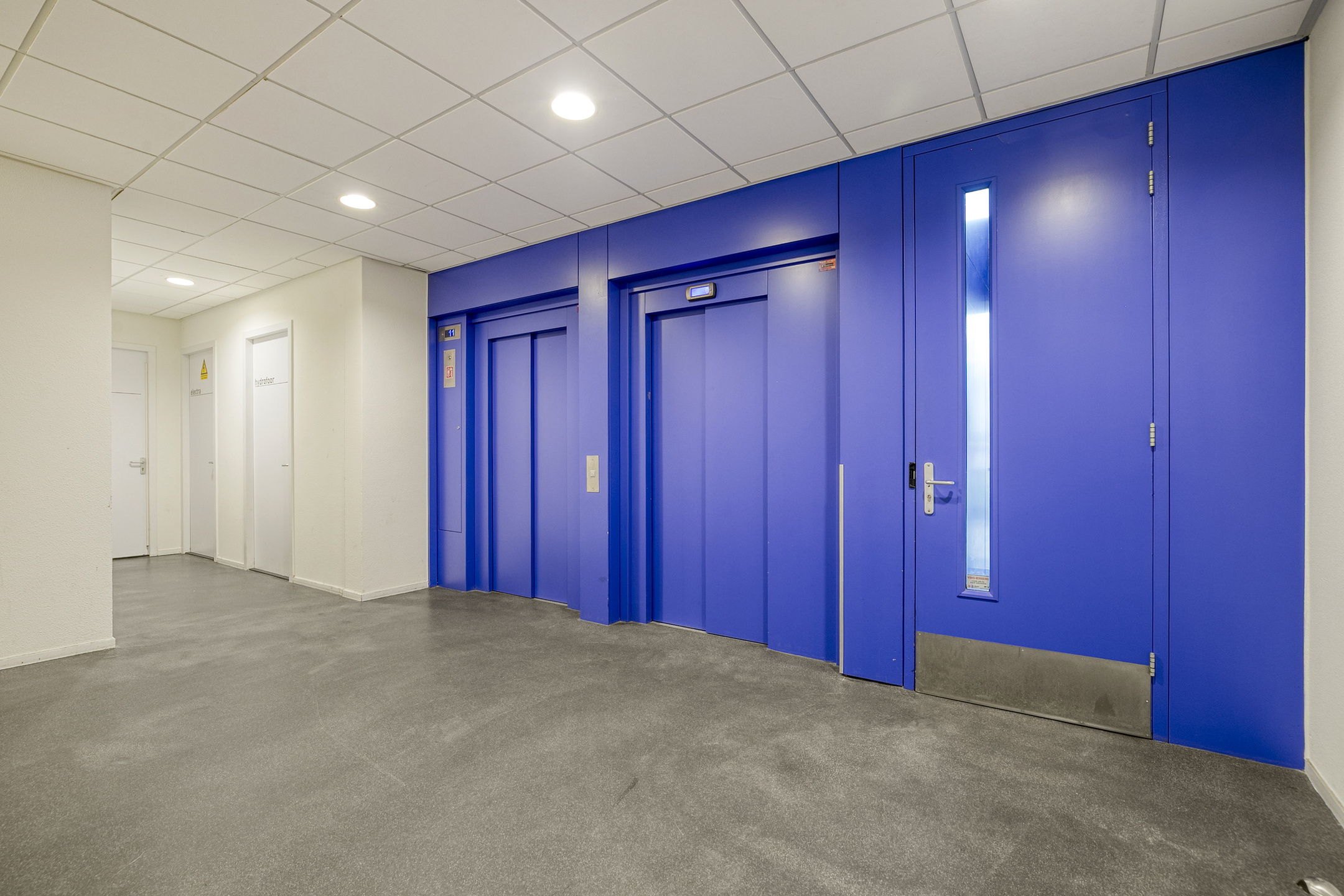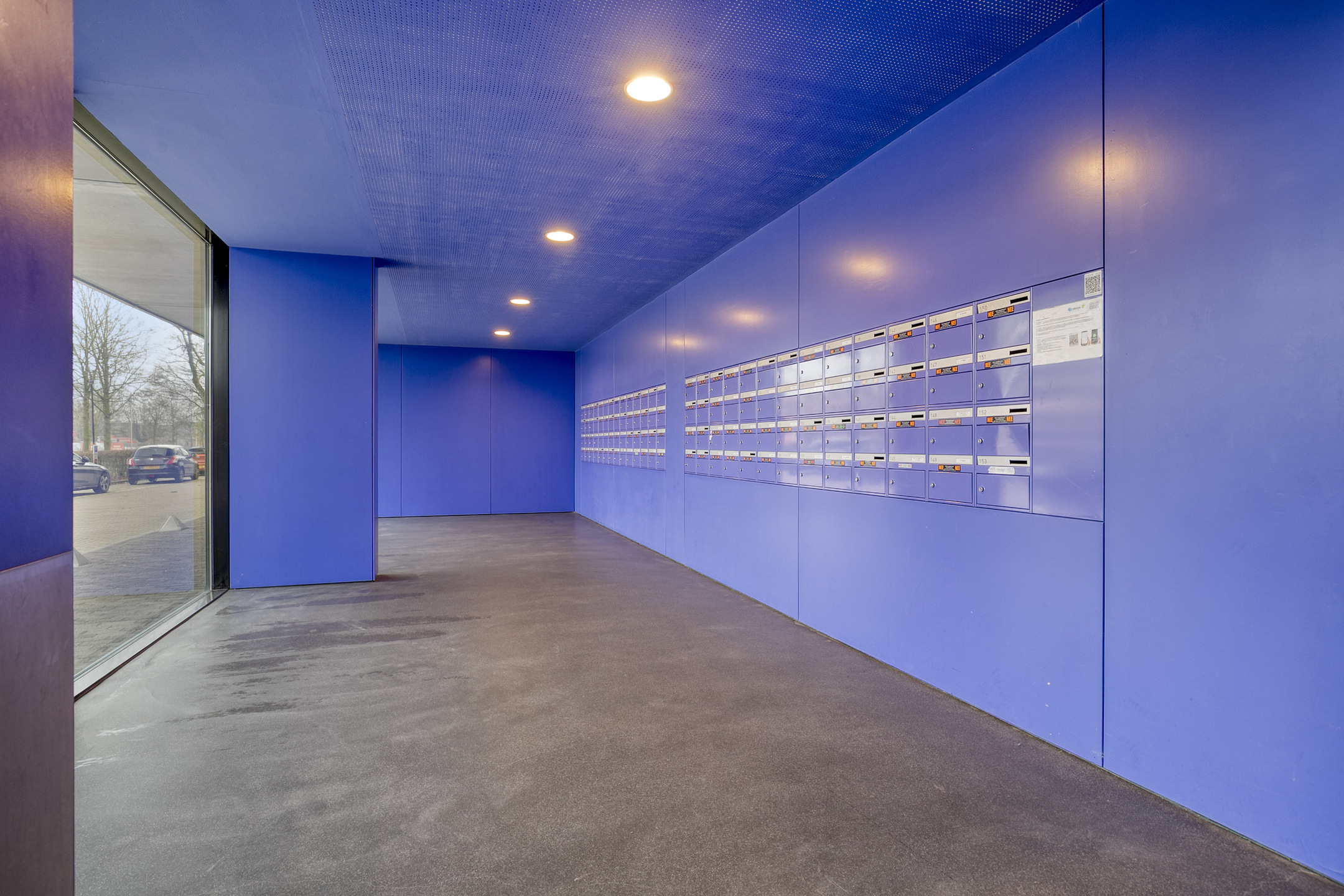 Centrale hal met een bellentableau en intercominstallatie, de brievenbussen, toegang tot de liften en het trappenhuis.