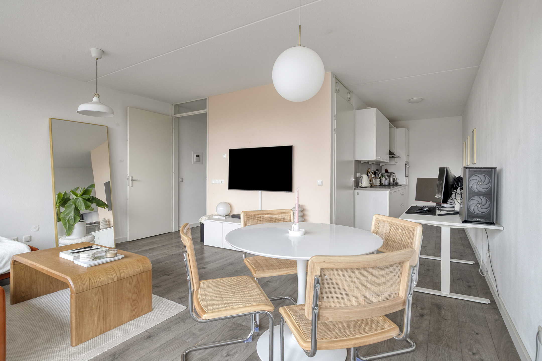 De woonkamer is praktisch in te delen met een comfortabele zitruimte, een eettafel en eventueel een werkplek.