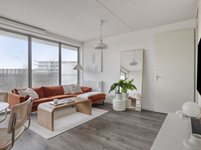 Door de grote glazen pui is dit een mooie lichte woonkamer met toegang tot het ruime balkon. De wanden zijn gestuct en de vloer is voorzien van laminaat.