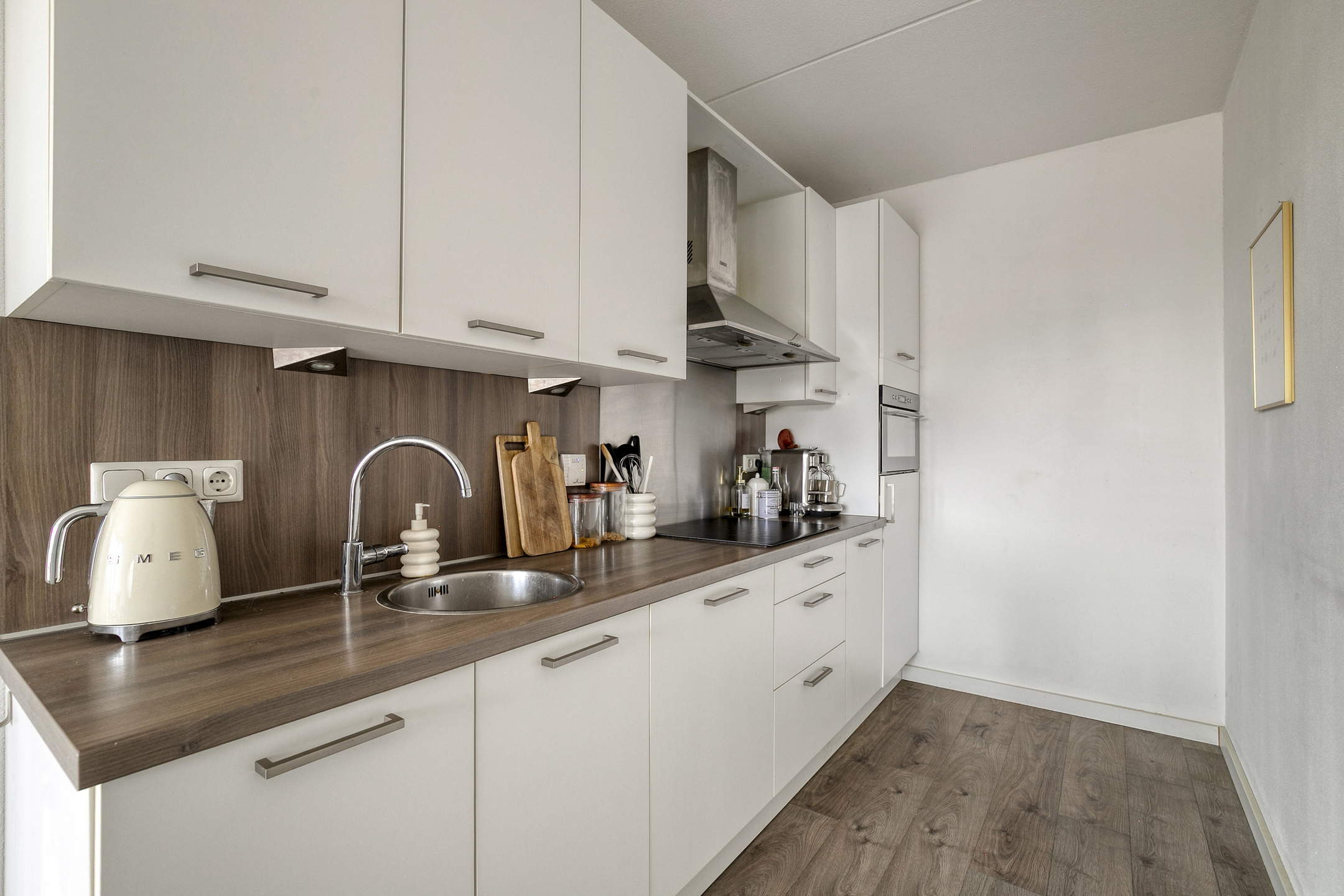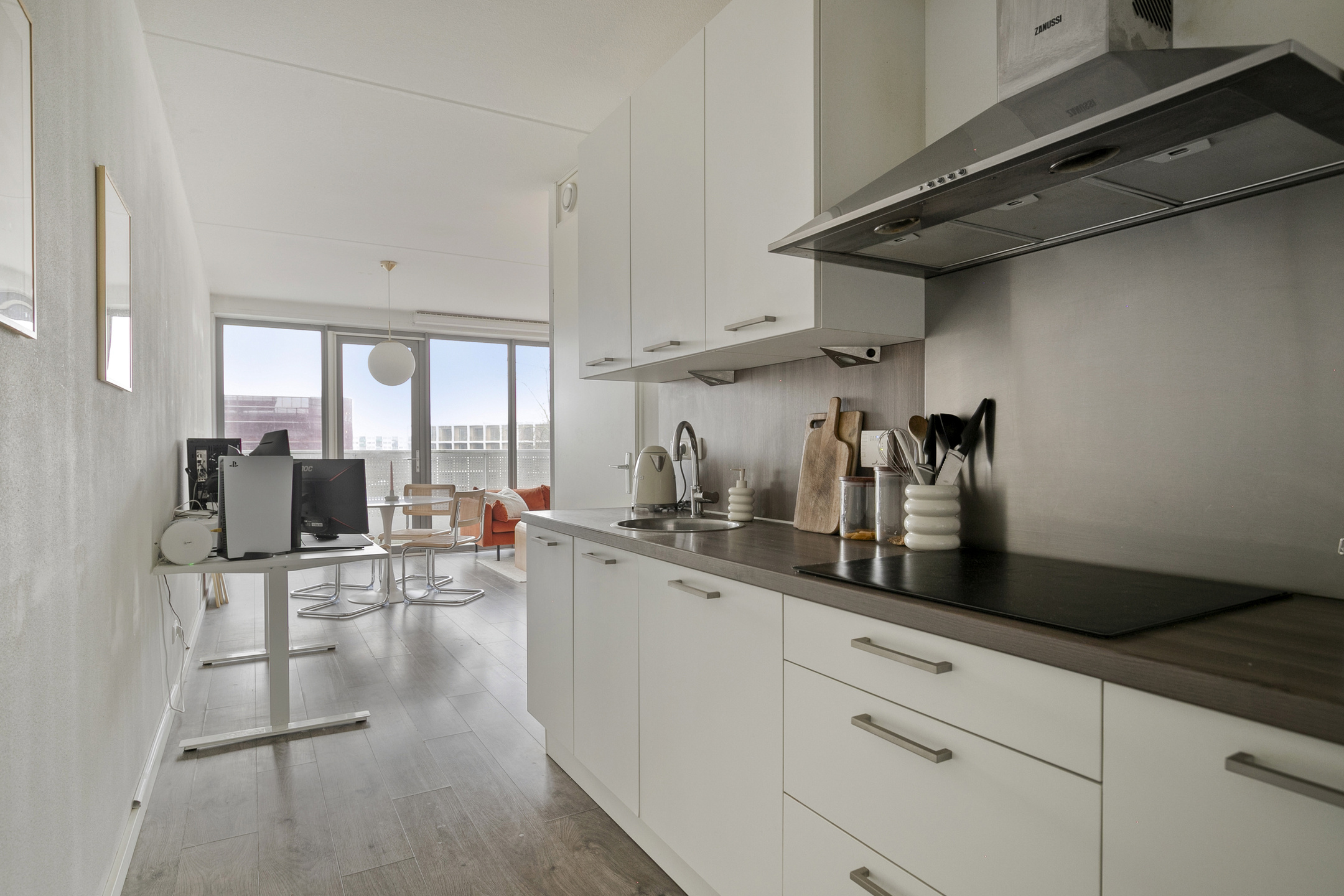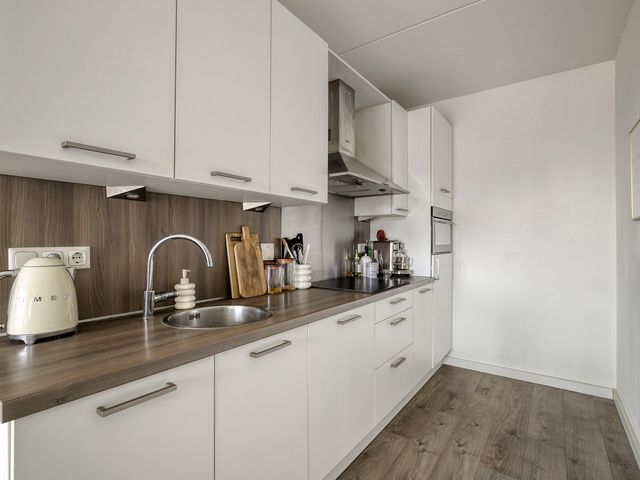 De keuken is uitgerust met de volgende inbouwapparatuur; 4-pits inductiekookplaat, rvs afzuigkap, combi-oven, koelkast en vaatwasser.