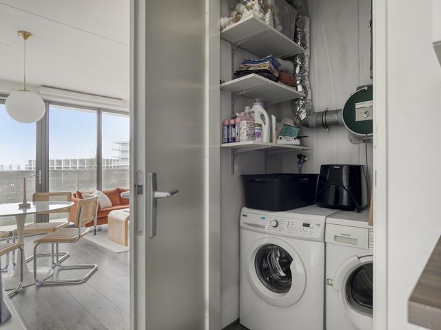 Vanuit de keuken is toegang tot de berging en is voorzien van een wasmachine-aansluiting, de warmte-terugwin-installatie en bergruimte.