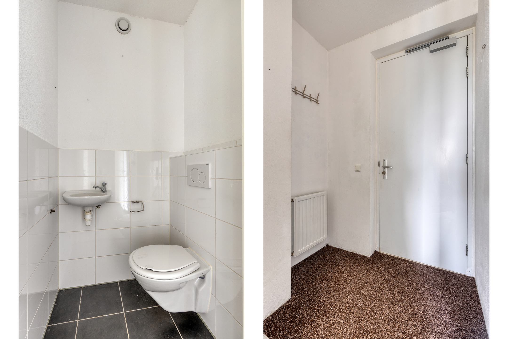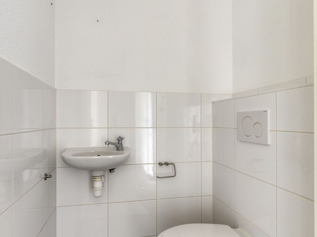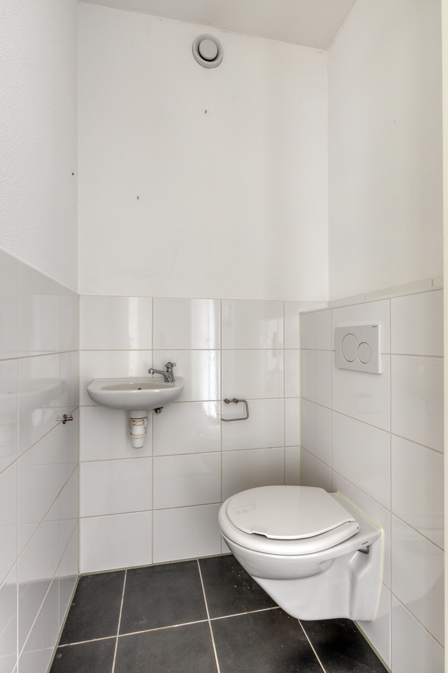 De toiletruimte is voorzien van een wandcloset en een fonteintje, de vloer is afgewerkt met vloertegels en de wanden zijn deels betegeld.