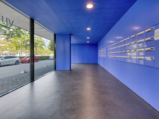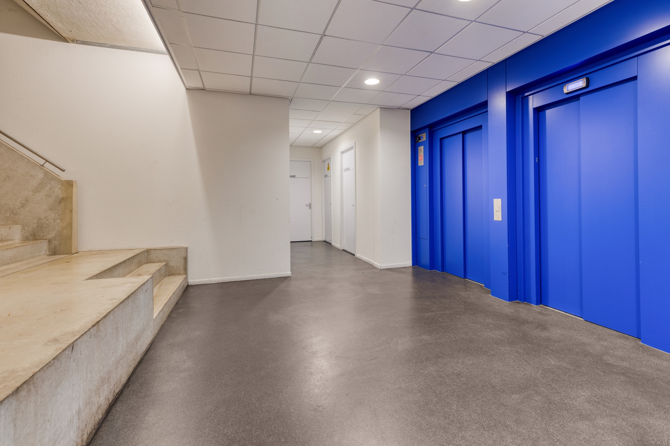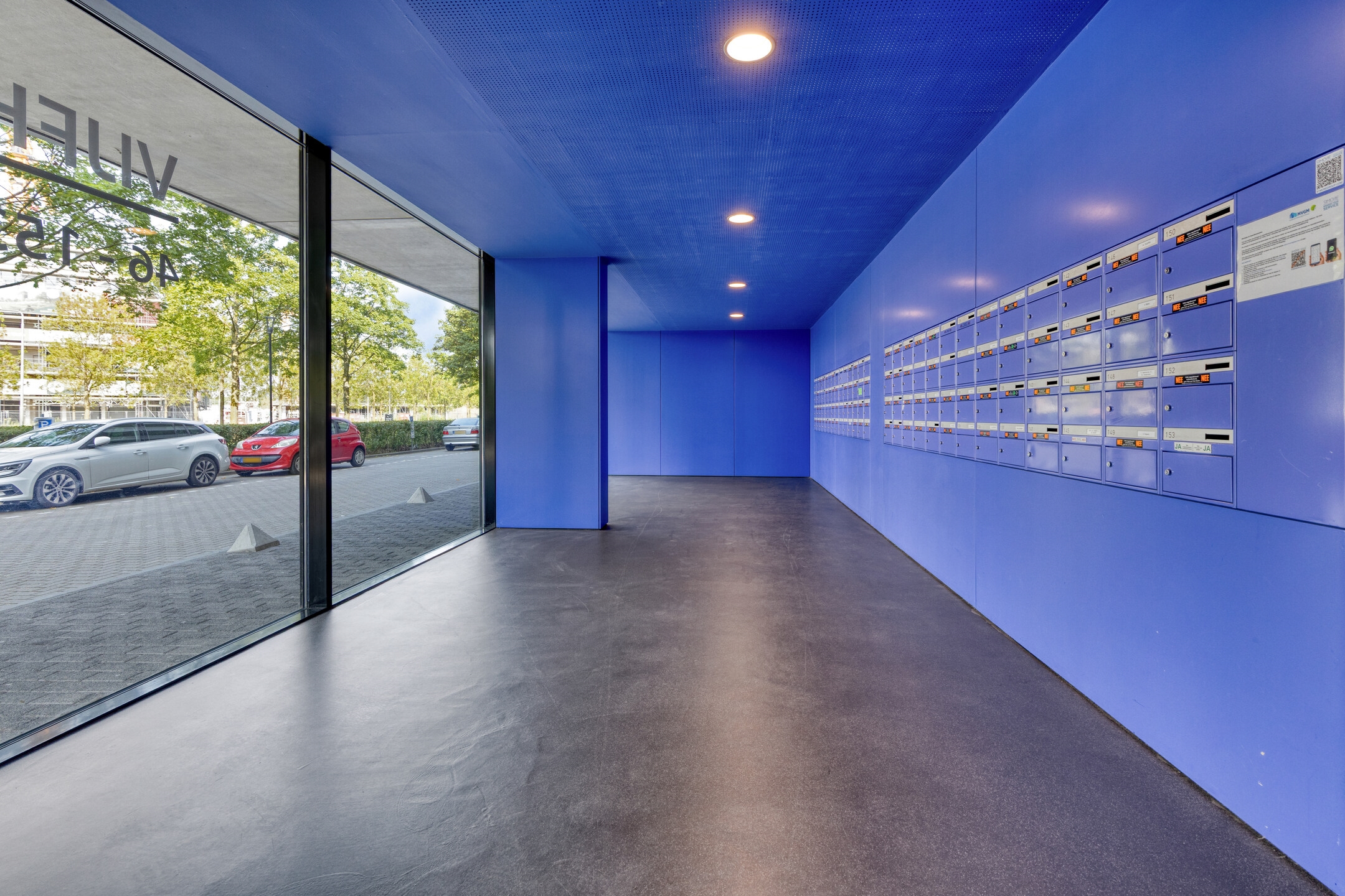 Centrale hal met een bellentableau en intercominstallatie, de brievenbussen, toegang tot de liften en het trappenhuis.