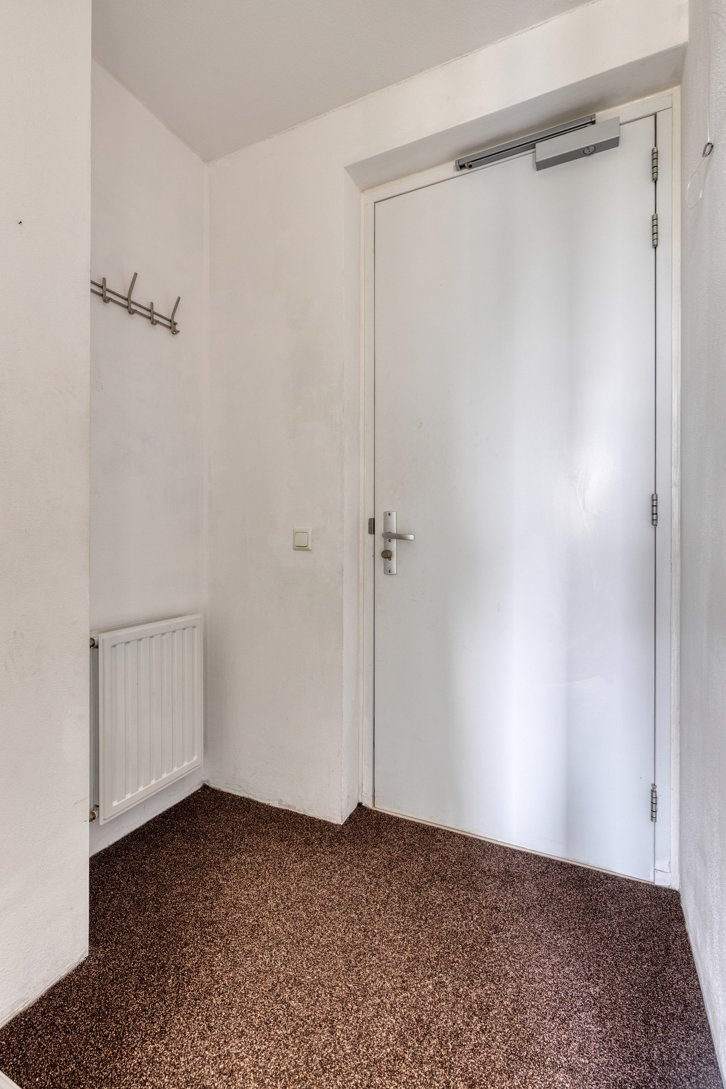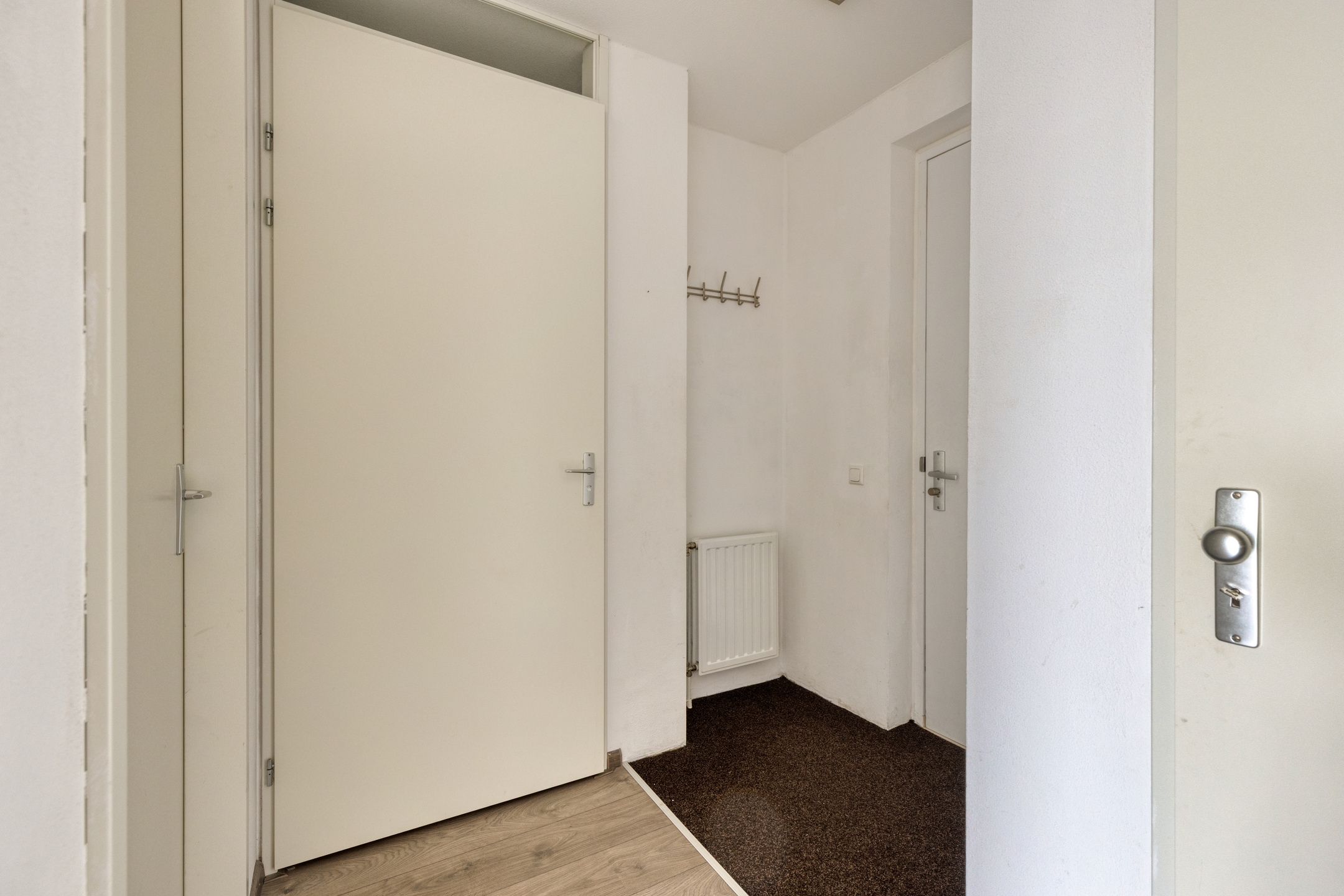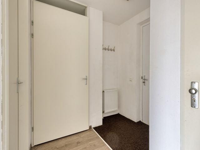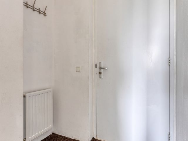 De ruime hal met intercom-videofoon, biedt toegang tot 2 slaapkamers, badkamer, meterkast, toilet en de woonkamer.