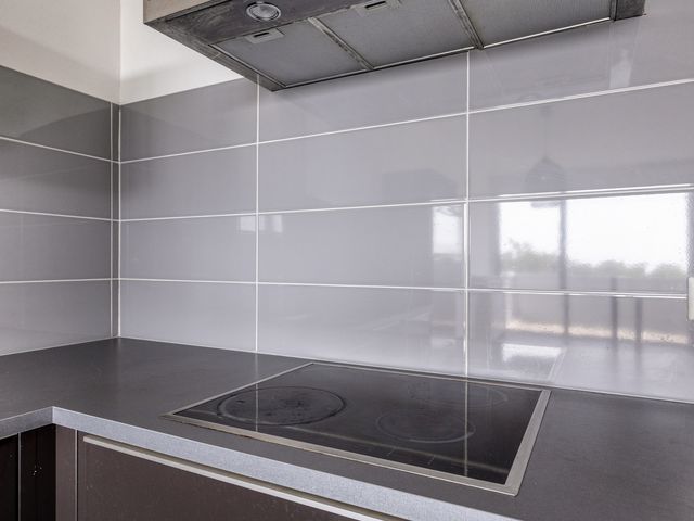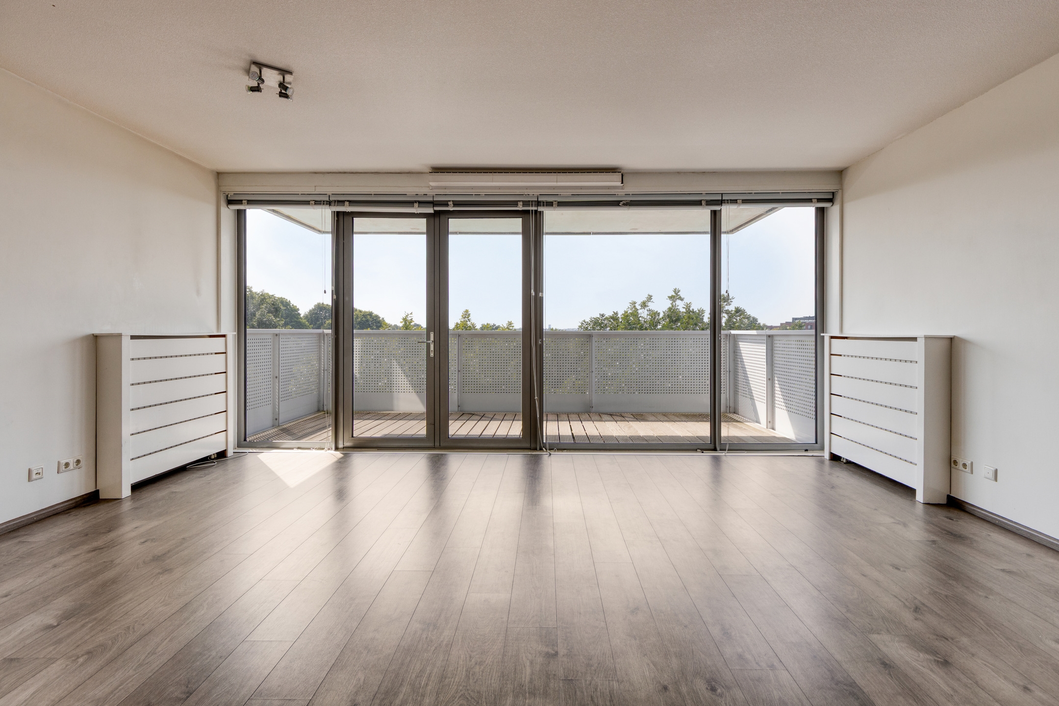 Door de grote glazen pui is dit een mooie lichte woonkamer. Middels dubbele openslaande deuren is het ruime balkon te bereiken. De wanden van de woonkamer zijn strak gestuct.