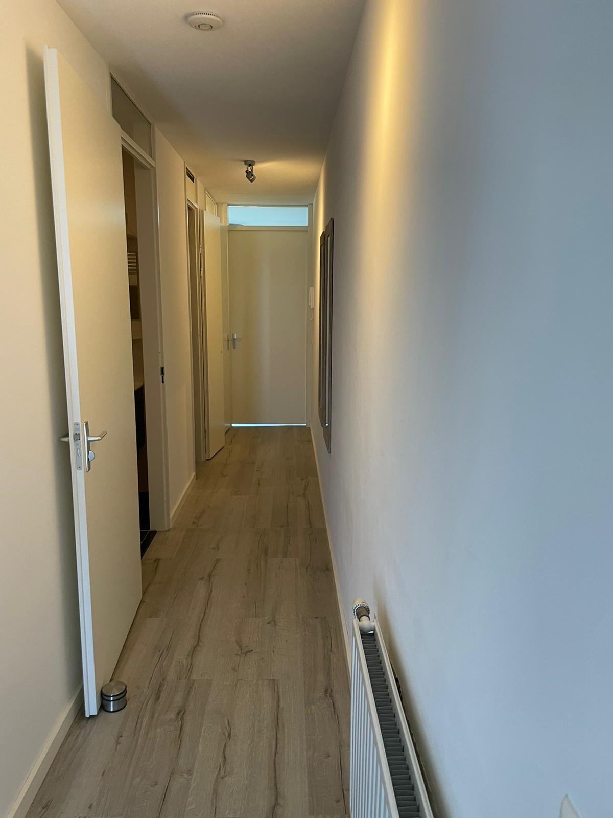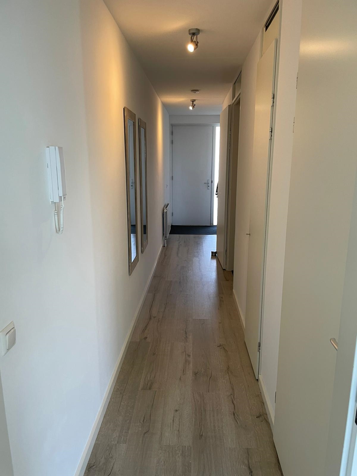 De ruime hal met intercom-videofoon, biedt toegang tot de slaapkamer, badkamer, meterkast, toilet en de woonkamer. De wanden zijn voorzien van stucwerk en de vloer is afgewerkt met laminaat welke doorloopt door het gehele appartement m.u.v. de badkamer.