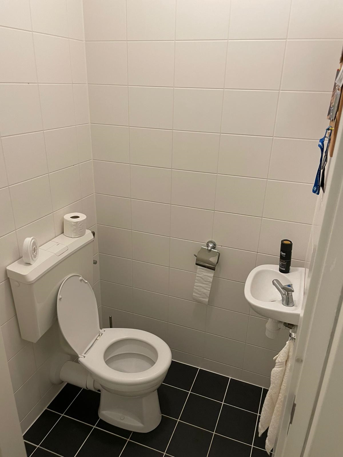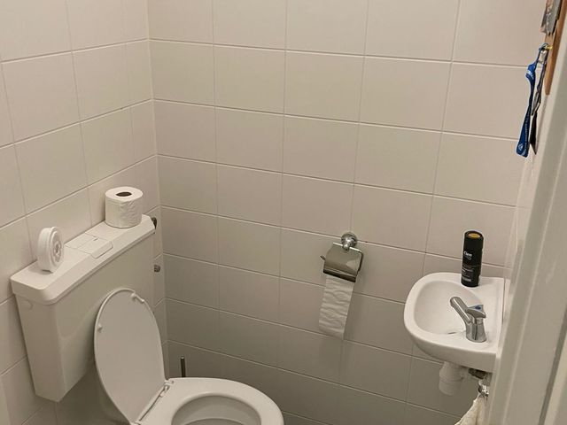 De toiletruimte is voorzien van een closet en een fonteintje, de vloer is afgewerkt met vloertegels en de wanden zijn geheel betegeld.