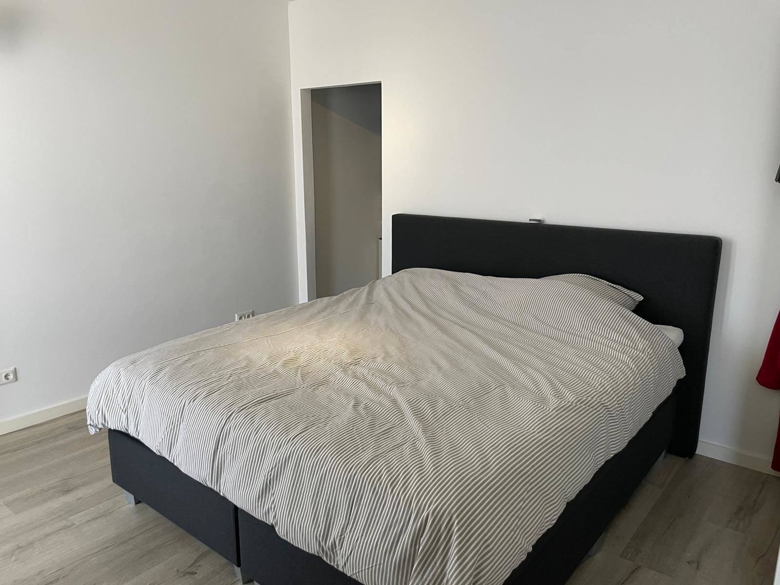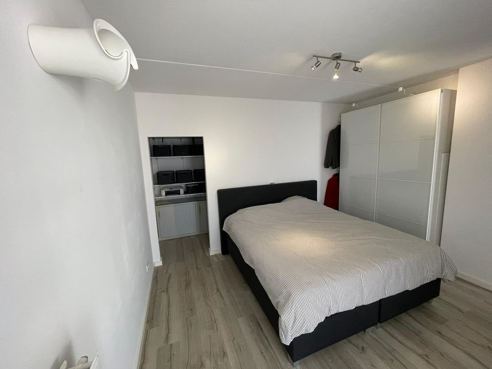 De ruime slaapkamer is voorzien van een laminaatvloer en de wanden zijn gestuct. Vanuit de slaapkamer is er toegang tot een bergkast.